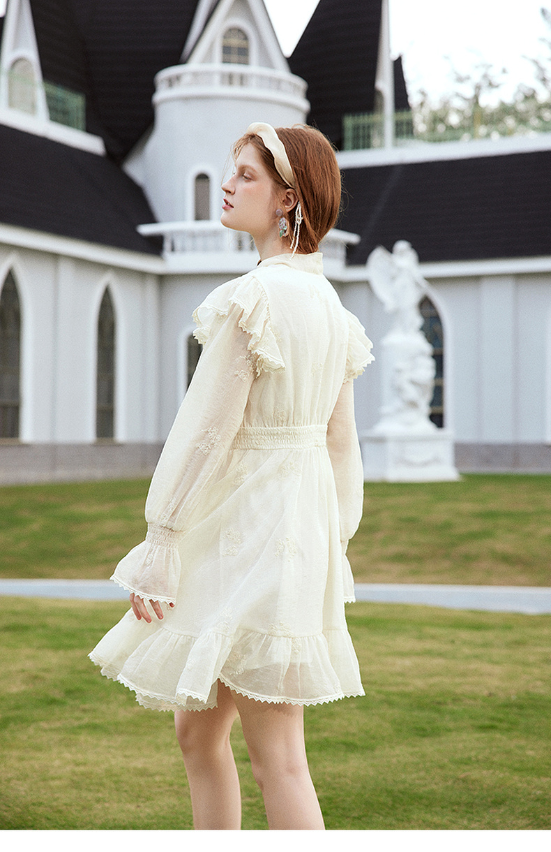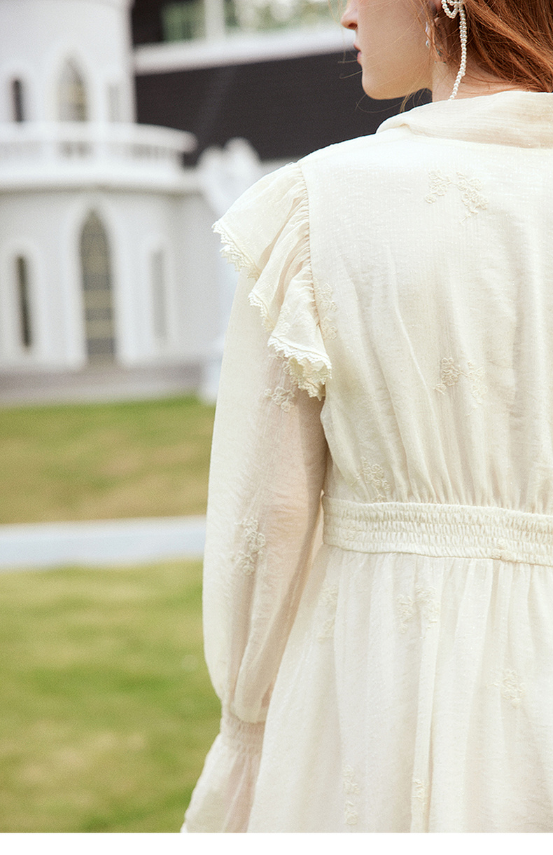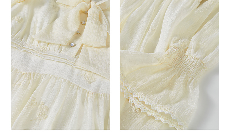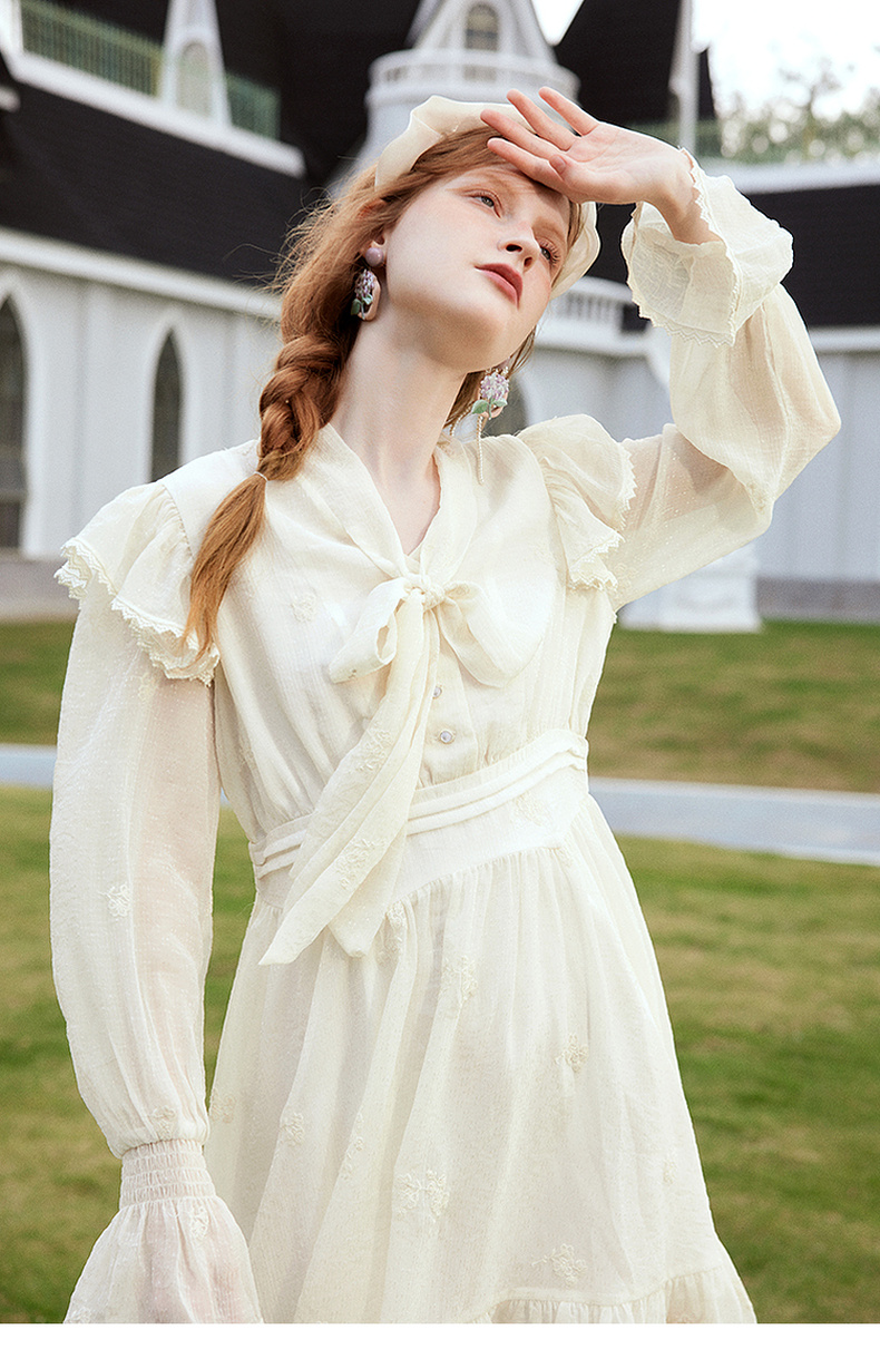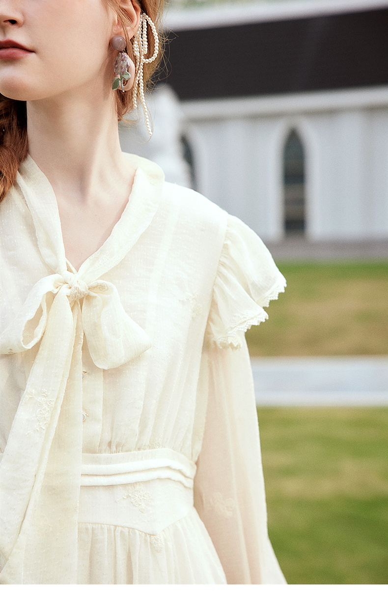 两三事月光岛绮旅2024夏季新款甜美绑带领荷叶边立体花纹连衣裙