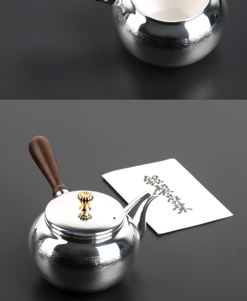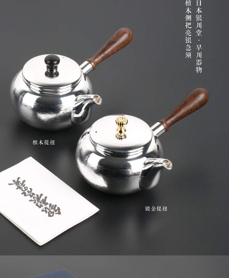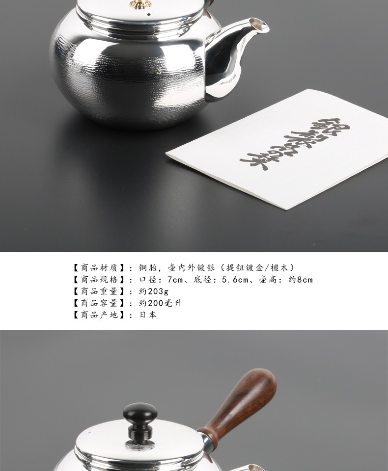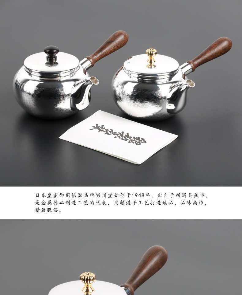 日本进口银川堂 银本铺铜胎镀银檀木侧把亮银急须泡茶壶 功夫茶具