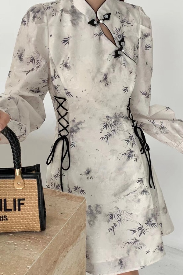 ANSUABEL 水墨竹叶印花盘扣系带收腰连衣裙 20008