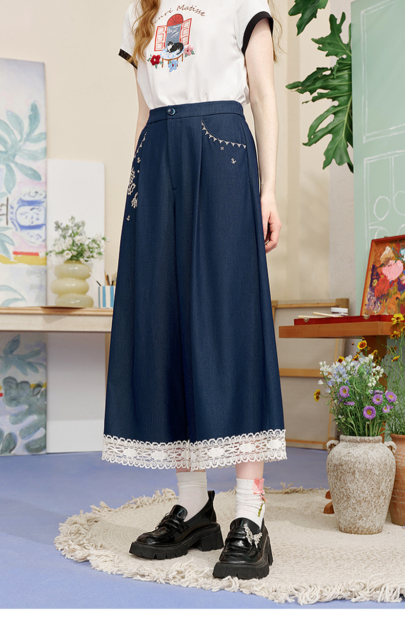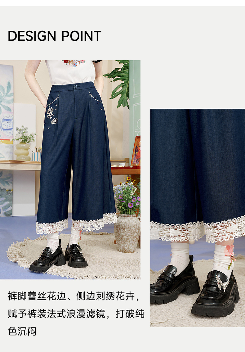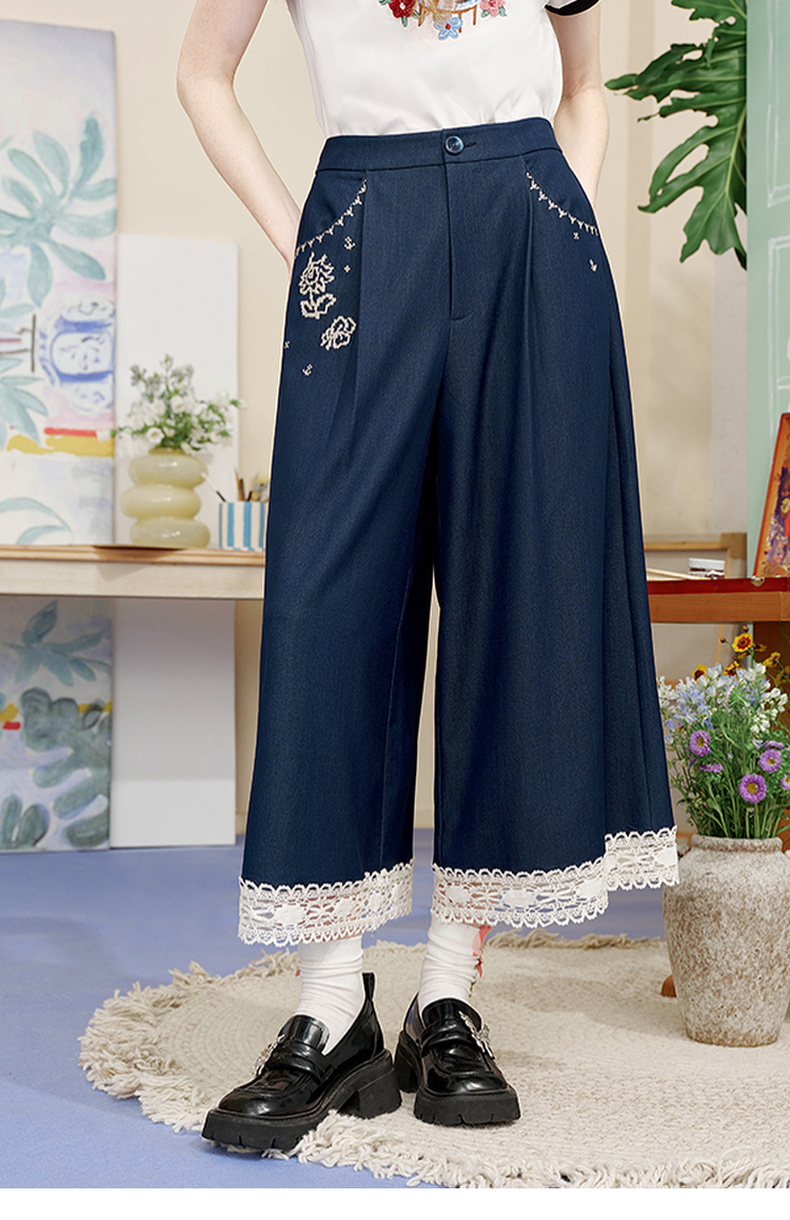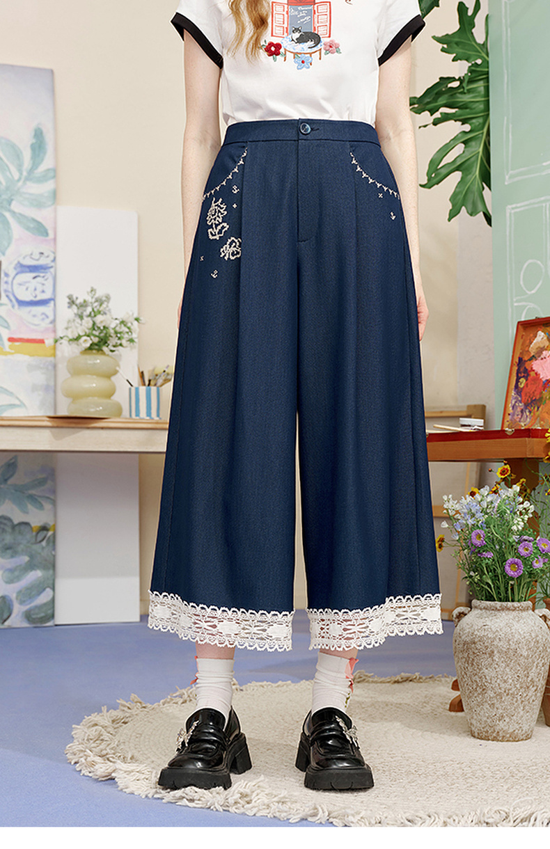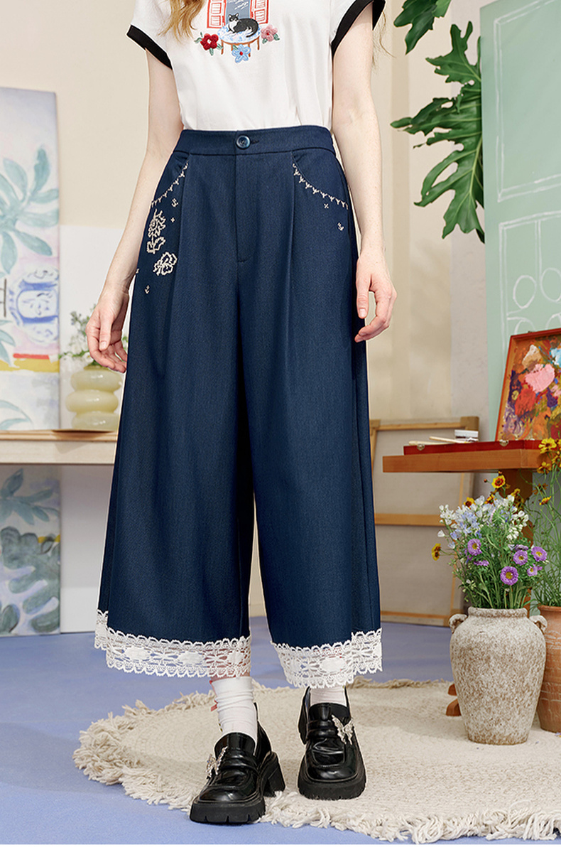 两三事像素派对2025夏新款森女风蕾丝拼接刺绣七分裤阔腿休闲裤女