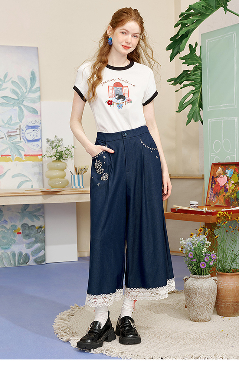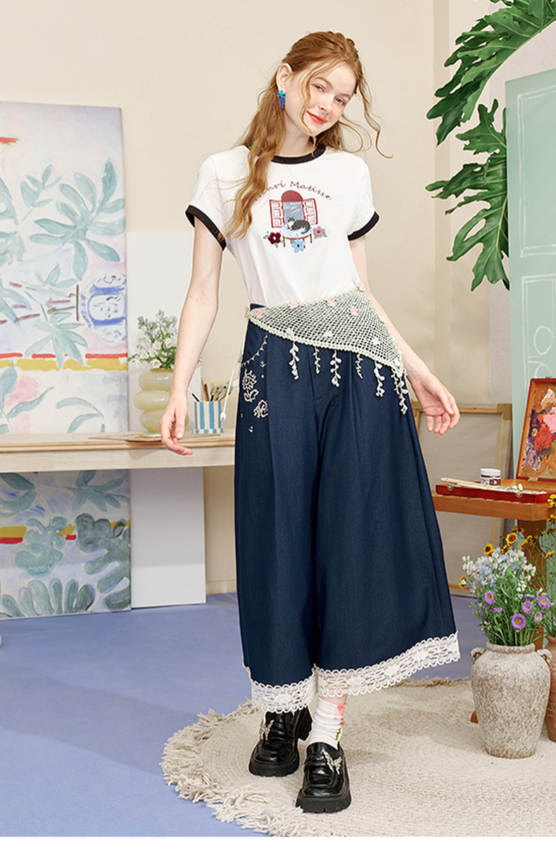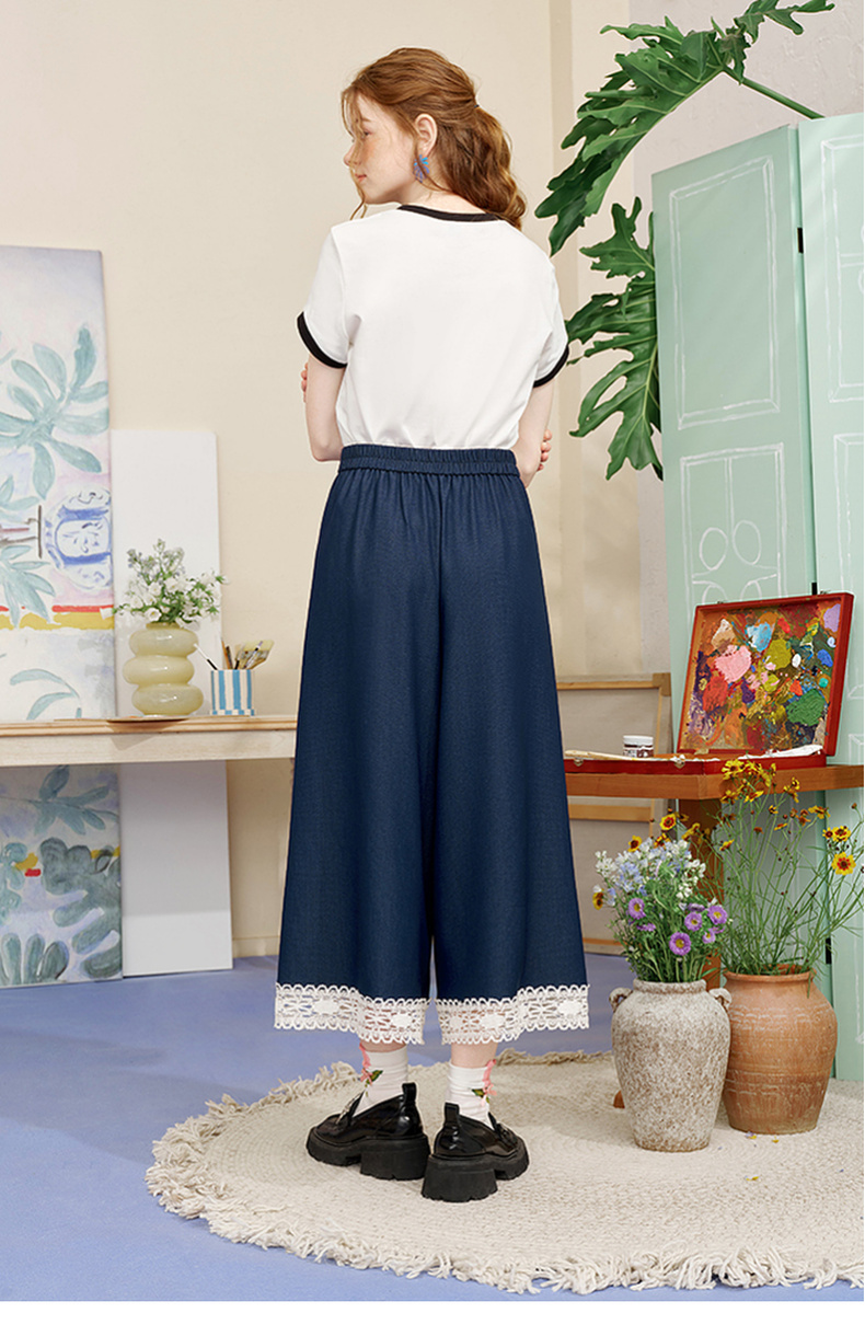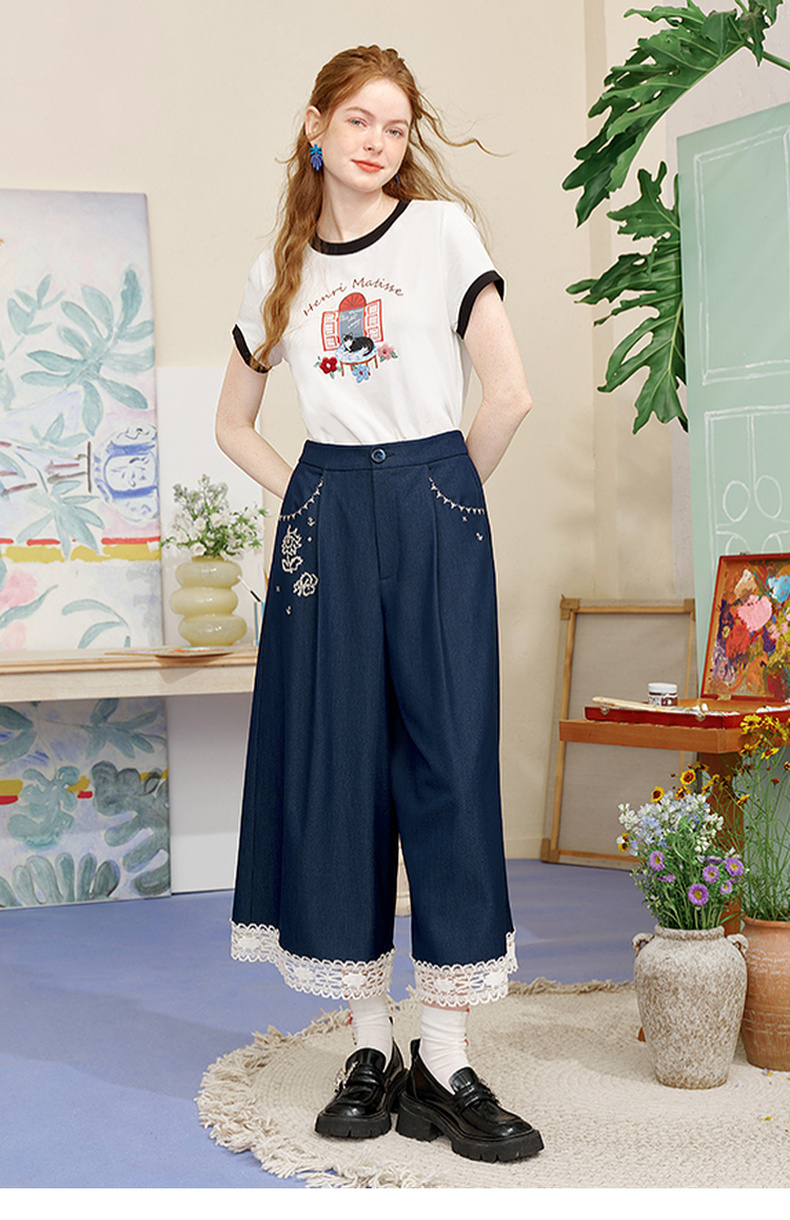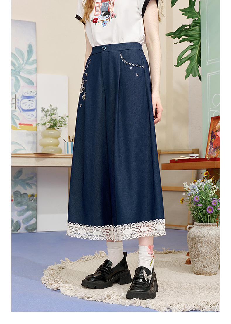 两三事像素派对2025夏新款森女风蕾丝拼接刺绣七分裤阔腿休闲裤女