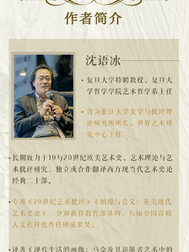 沈语冰,复旦大学特聘教授、复旦大学哲学学院艺术哲学系主任。曾为浙江大学美学与批评理论研究所所长、世界艺术研究中心主任。长期致力于19 与20 世纪欧美艺术史、艺术理论与艺术批评研究,独立或合作翻译西方现当代艺术史论经典二十部。专著《20 世纪艺术批评》《图像与意义:英美现代艺术史论》,分别获得教育部第四、八届全国高校人文社科优秀科研成果奖。译著《现代生活的画像:马奈及其追随者艺术中的巴黎》、专著《图像与意义:英美现代艺术史论》分别获得AAC 第八、十二届“艺术中国·年度影响力”年度艺术类出版物提名奖。