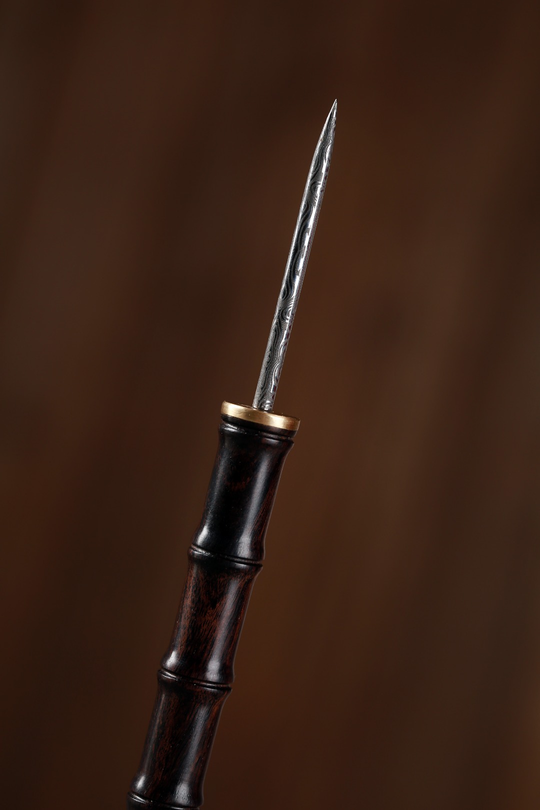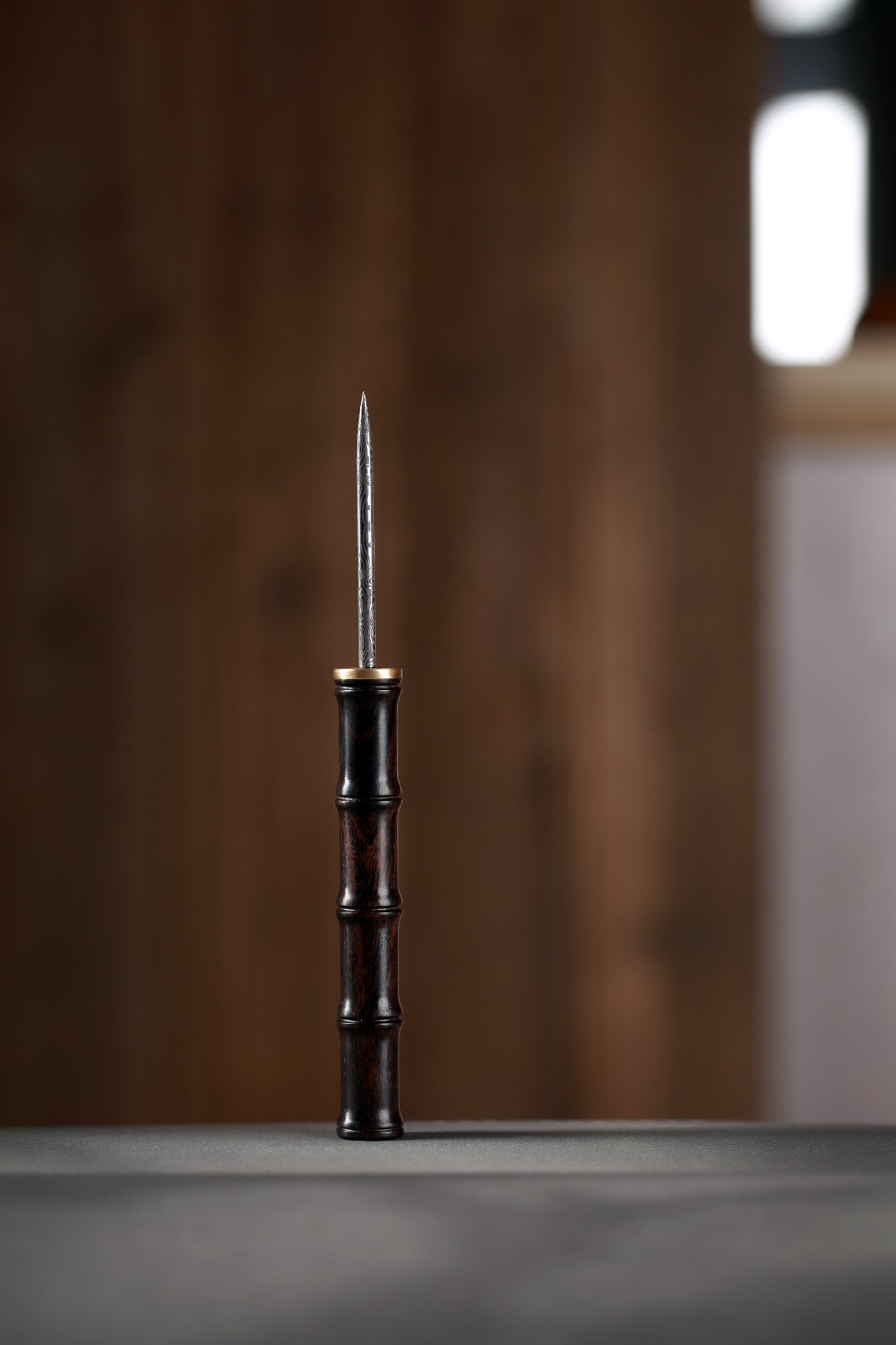 茶针也叫茶通,是茶道六君子之中必不可少的茶具,此茶针手柄取紫光檀为材,竹节型制,精巧典雅,搭配仿大马士革钢,花纹明暗交替,独具一格。