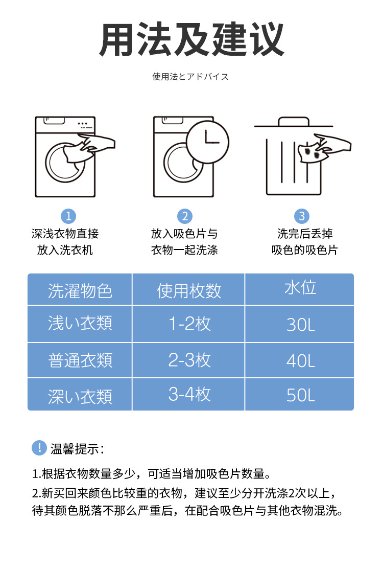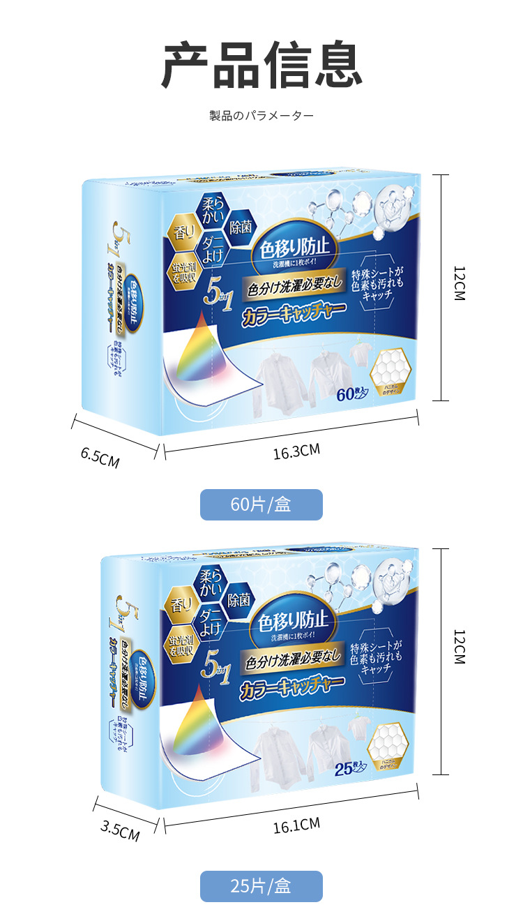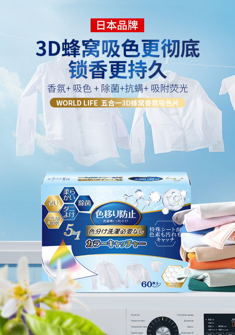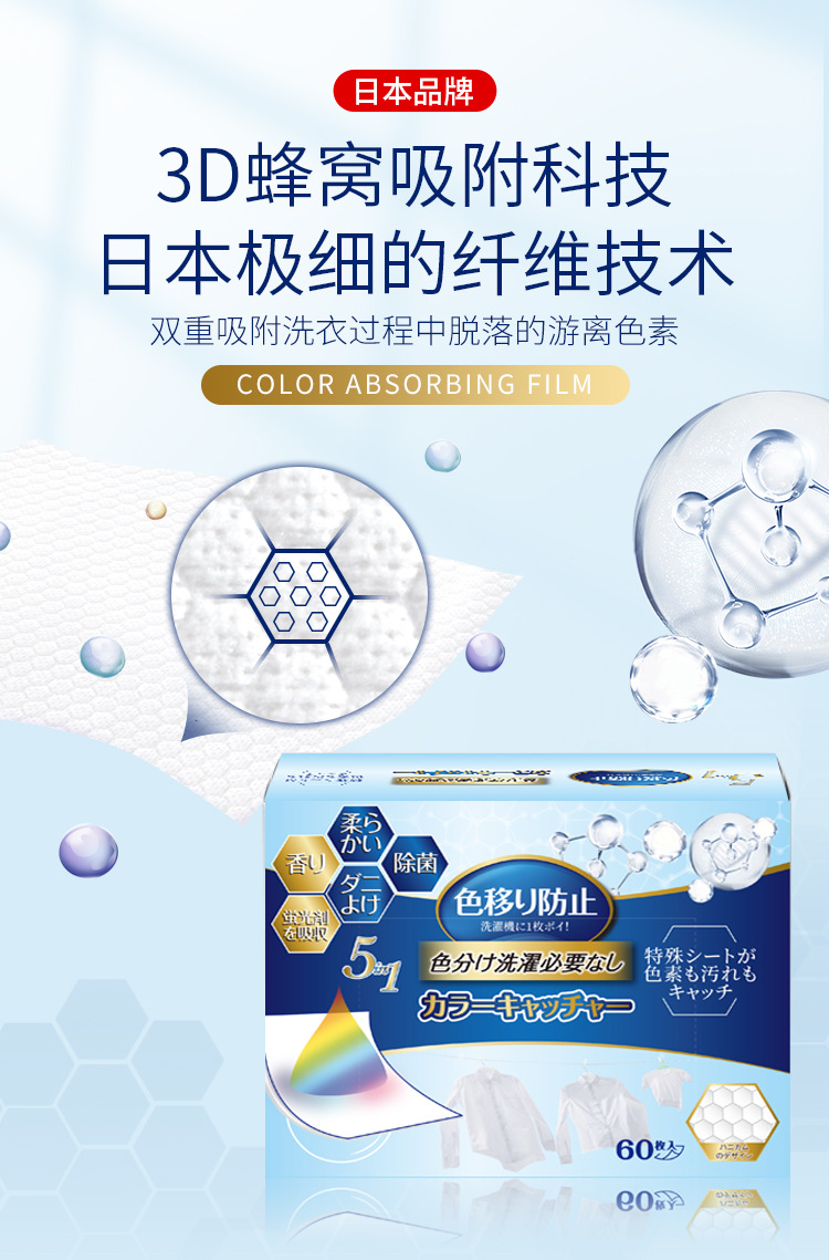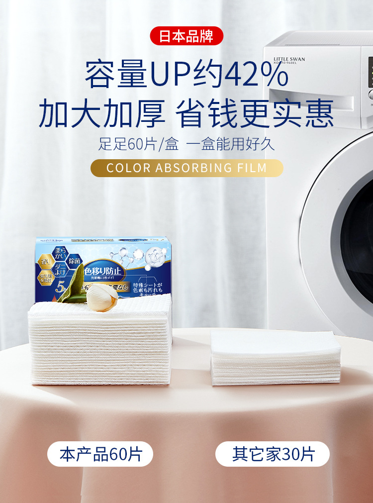 日本吸色片防染色【拍1发2!】 3D蜂窝吸色片,防串染+除菌+留香,一片搞定衣物护理!60片超值装,衣服亮丽如新