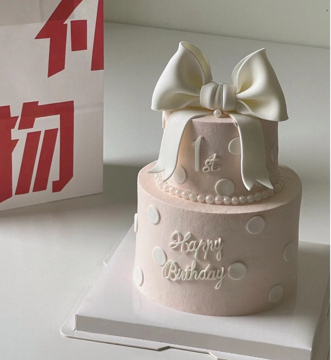 Ins淡粉蝴蝶结双层蛋糕