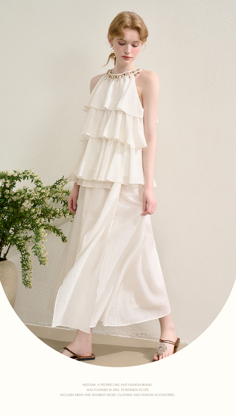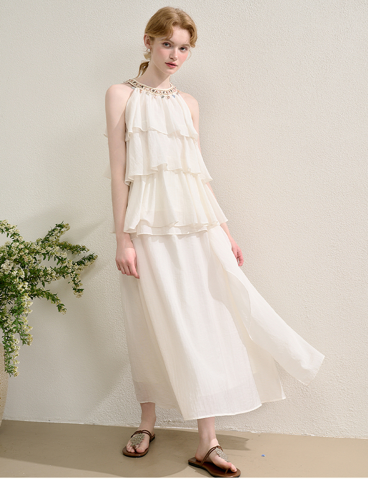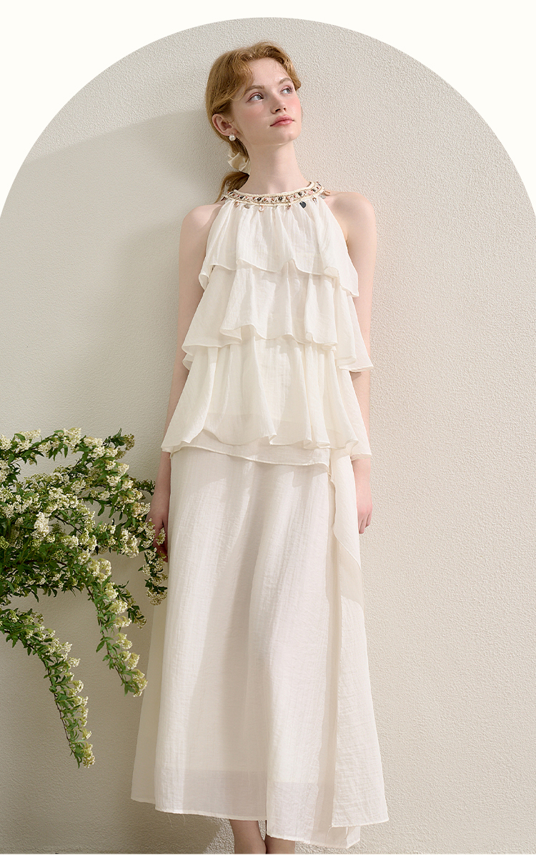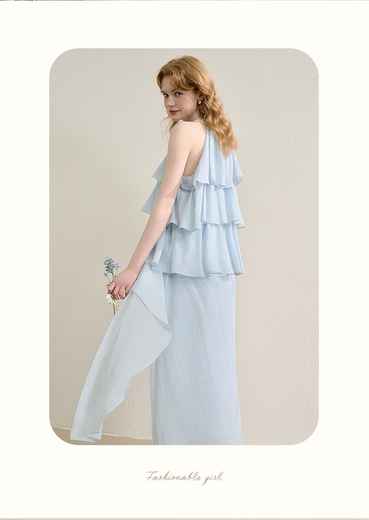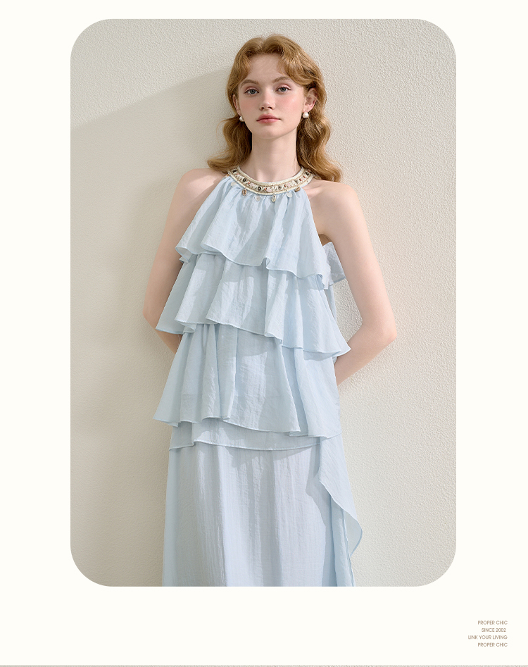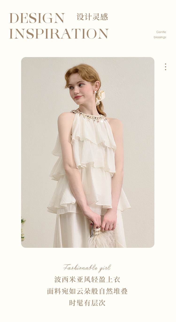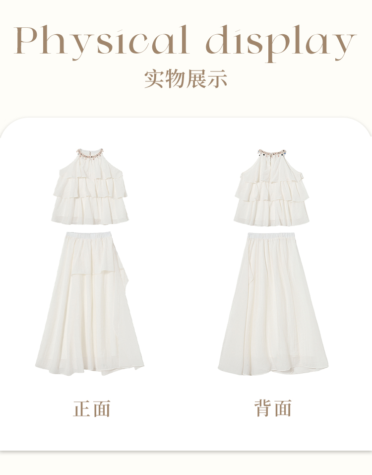 法式度假风荷叶边套装女夏季钉珠挂脖衬衫搭半裙两件套H0050860
