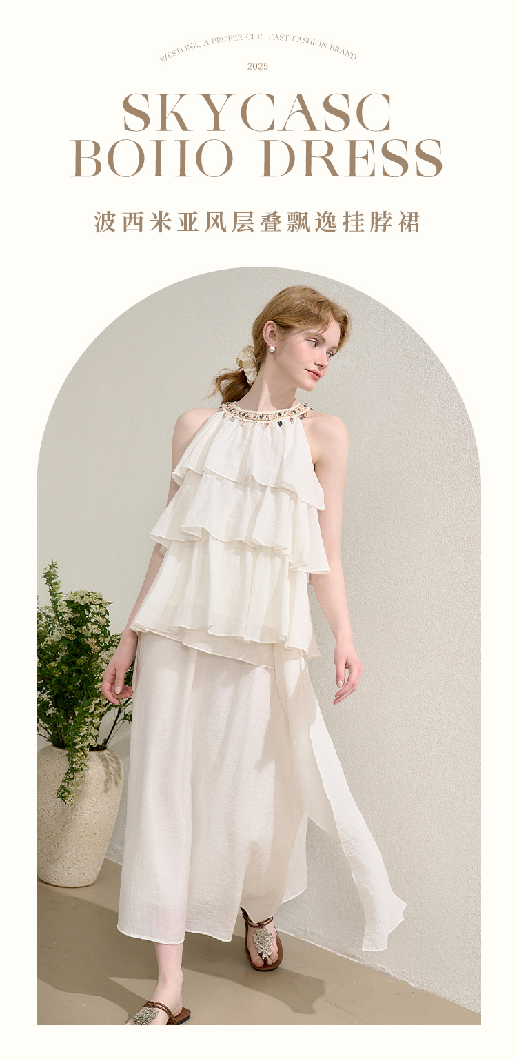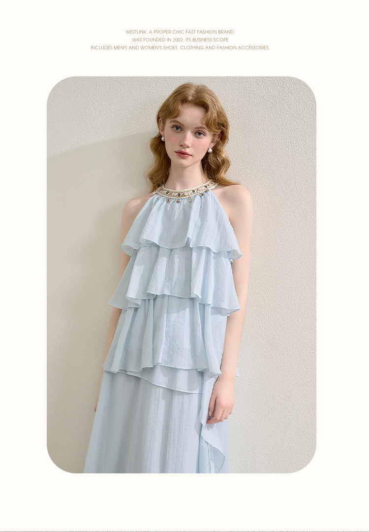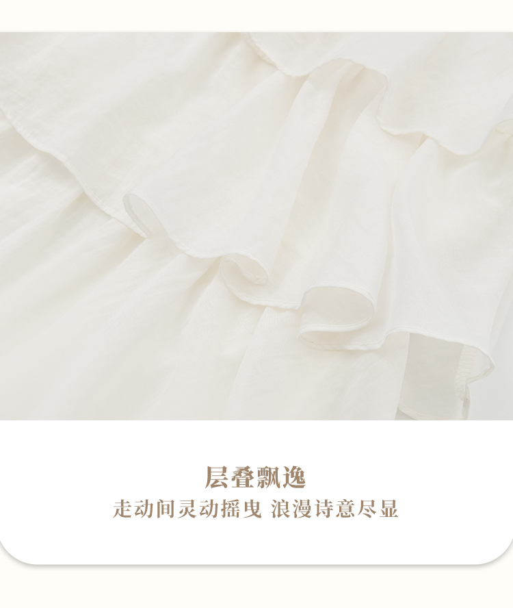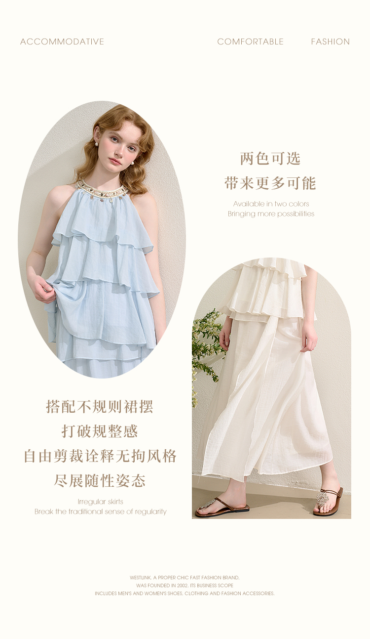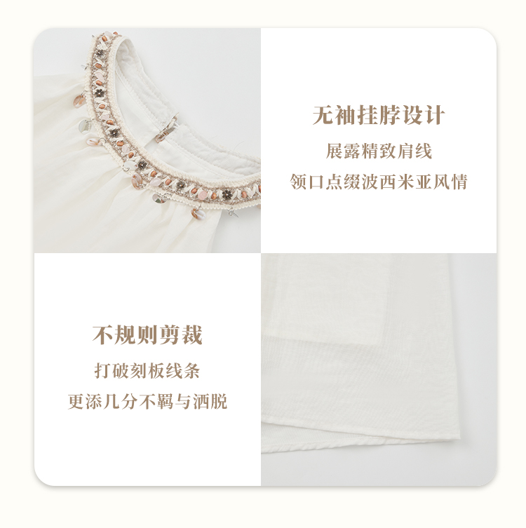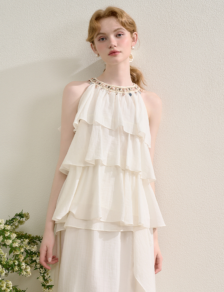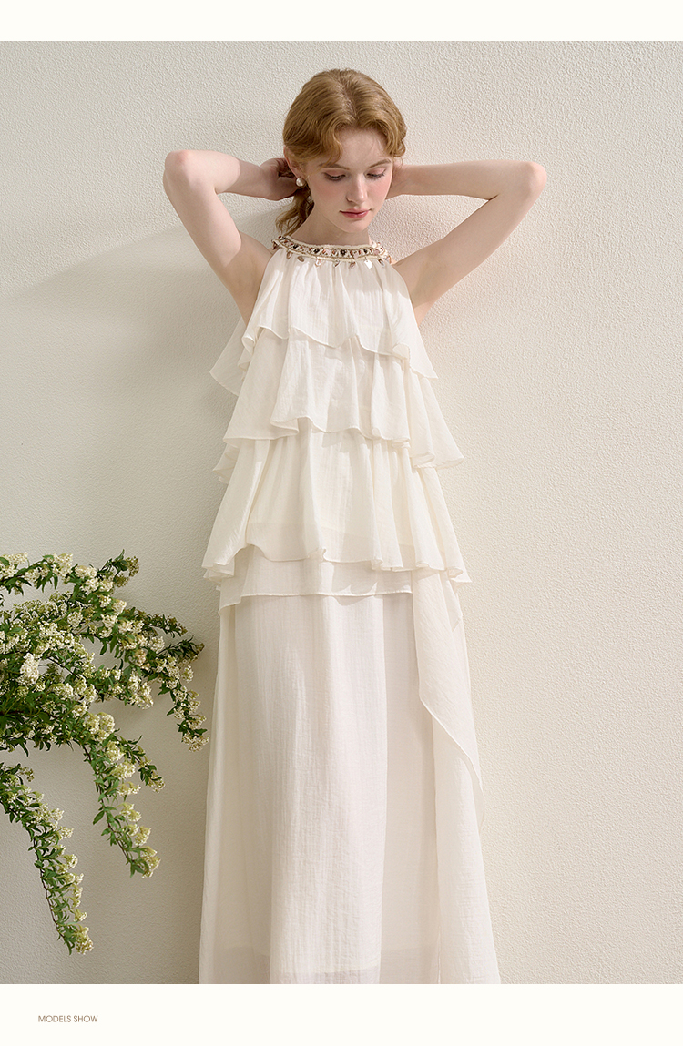 法式度假风荷叶边套装女夏季钉珠挂脖衬衫搭半裙两件套H0050860