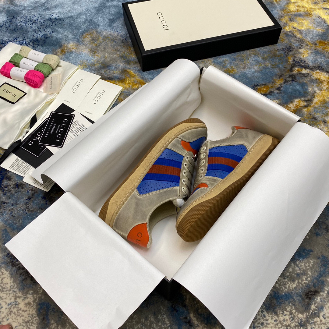 鞋面擦色牛皮拼接经典双G布面料,皮面切口全油边封口工艺,原版毛巾布里细腻柔软更舒适透气,垫脚乳胶注塑一体,私模钢印双色原版TPU大底(下层宽,上层窄)