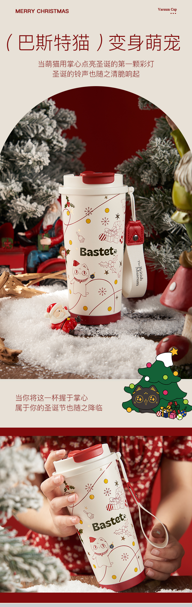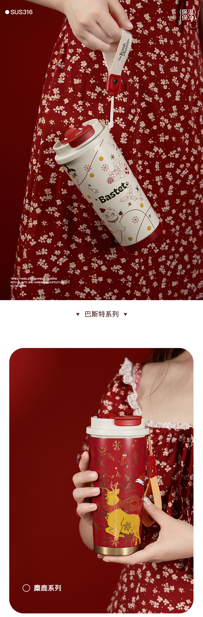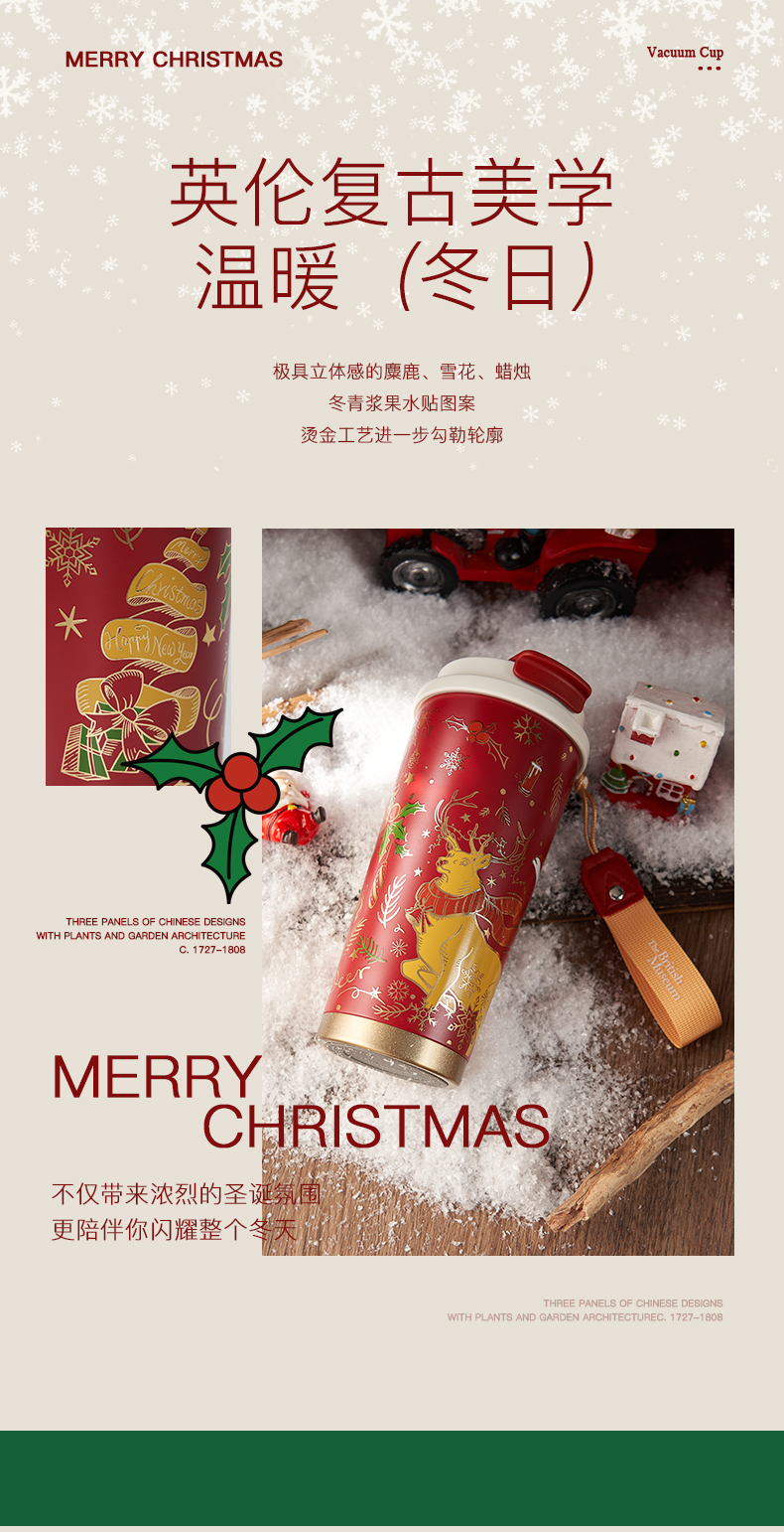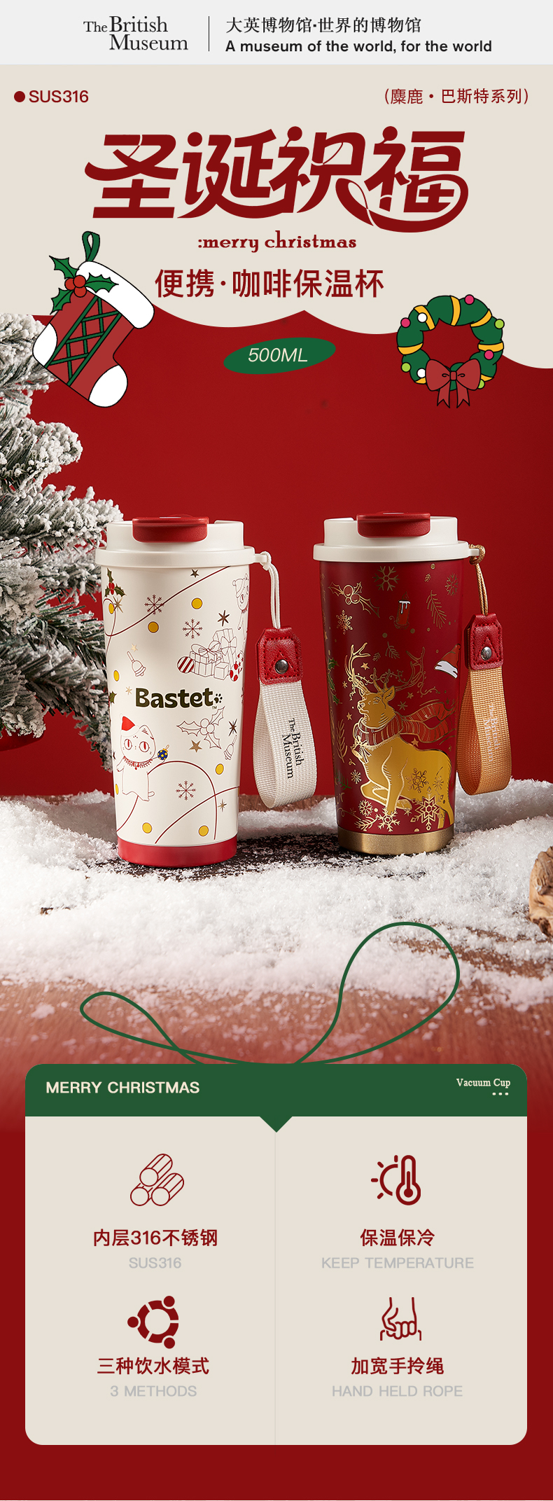 大英博物馆 麋鹿系列 盖亚·巴斯特系列 500ml 圣诞祝福 便携咖啡保温杯