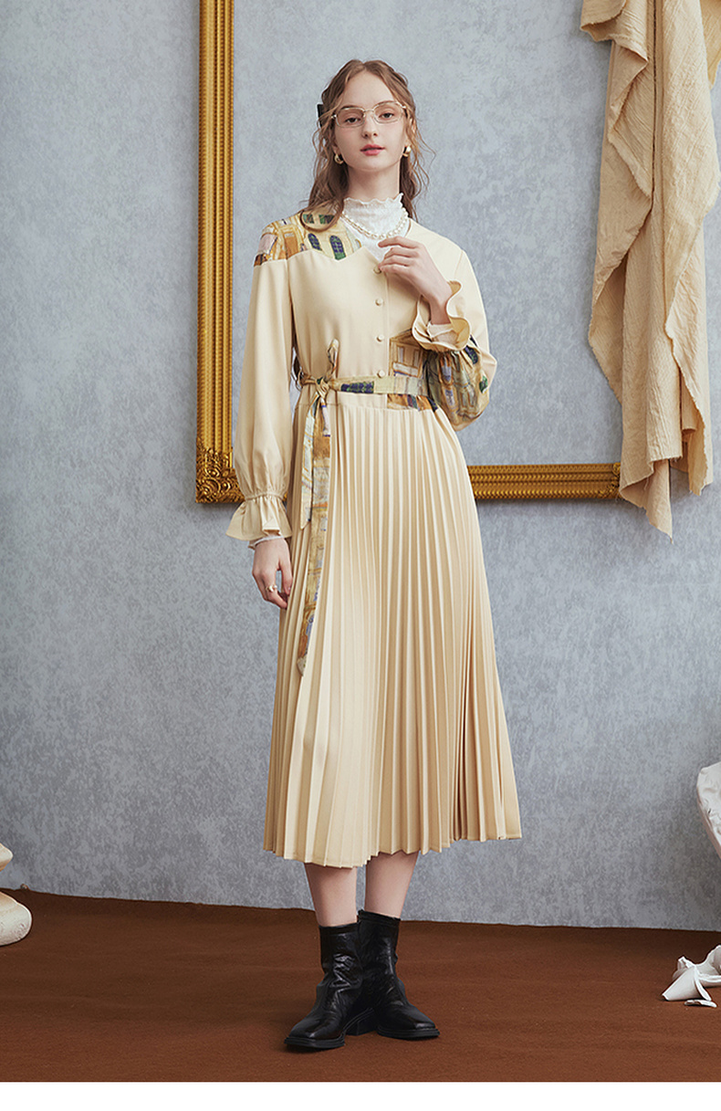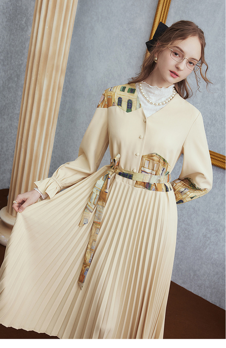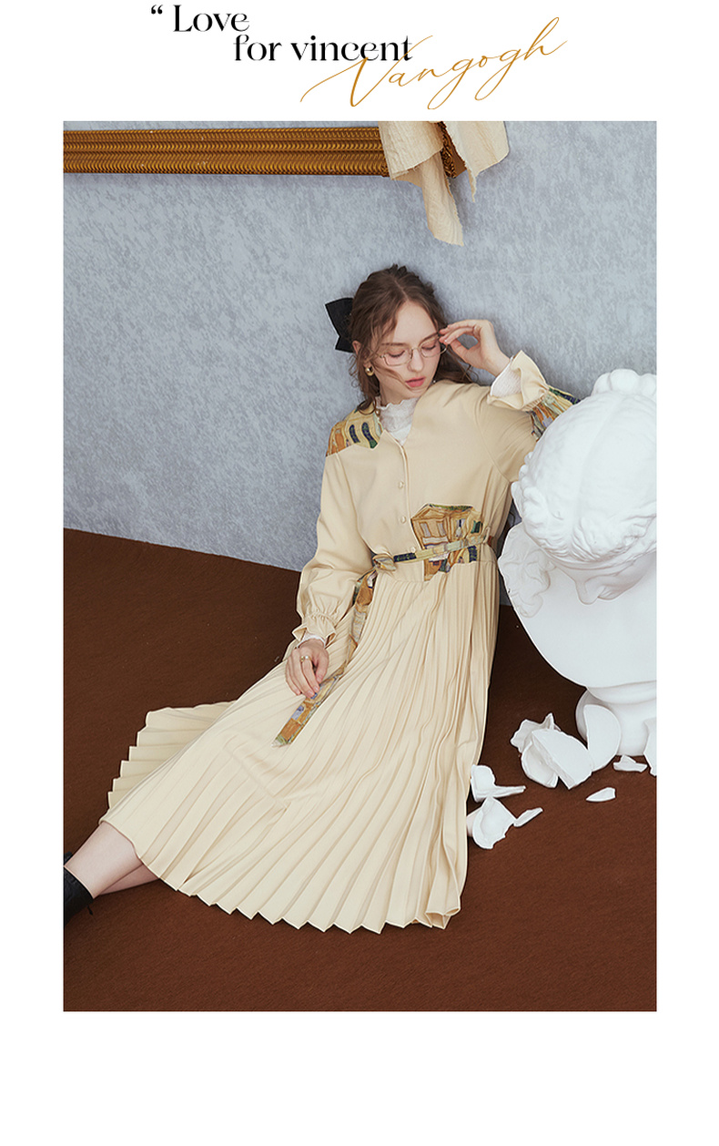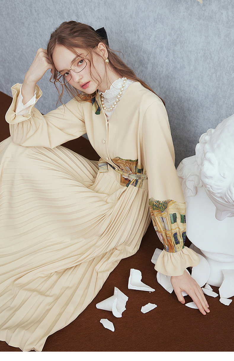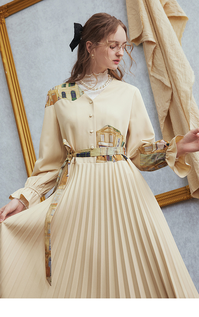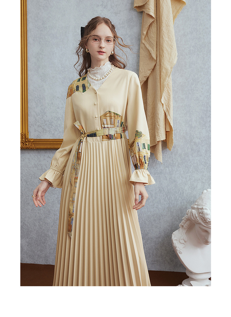 两三事梵高文艺错位空间2025秋季新款印花拼接百褶裙摆绑带连衣裙