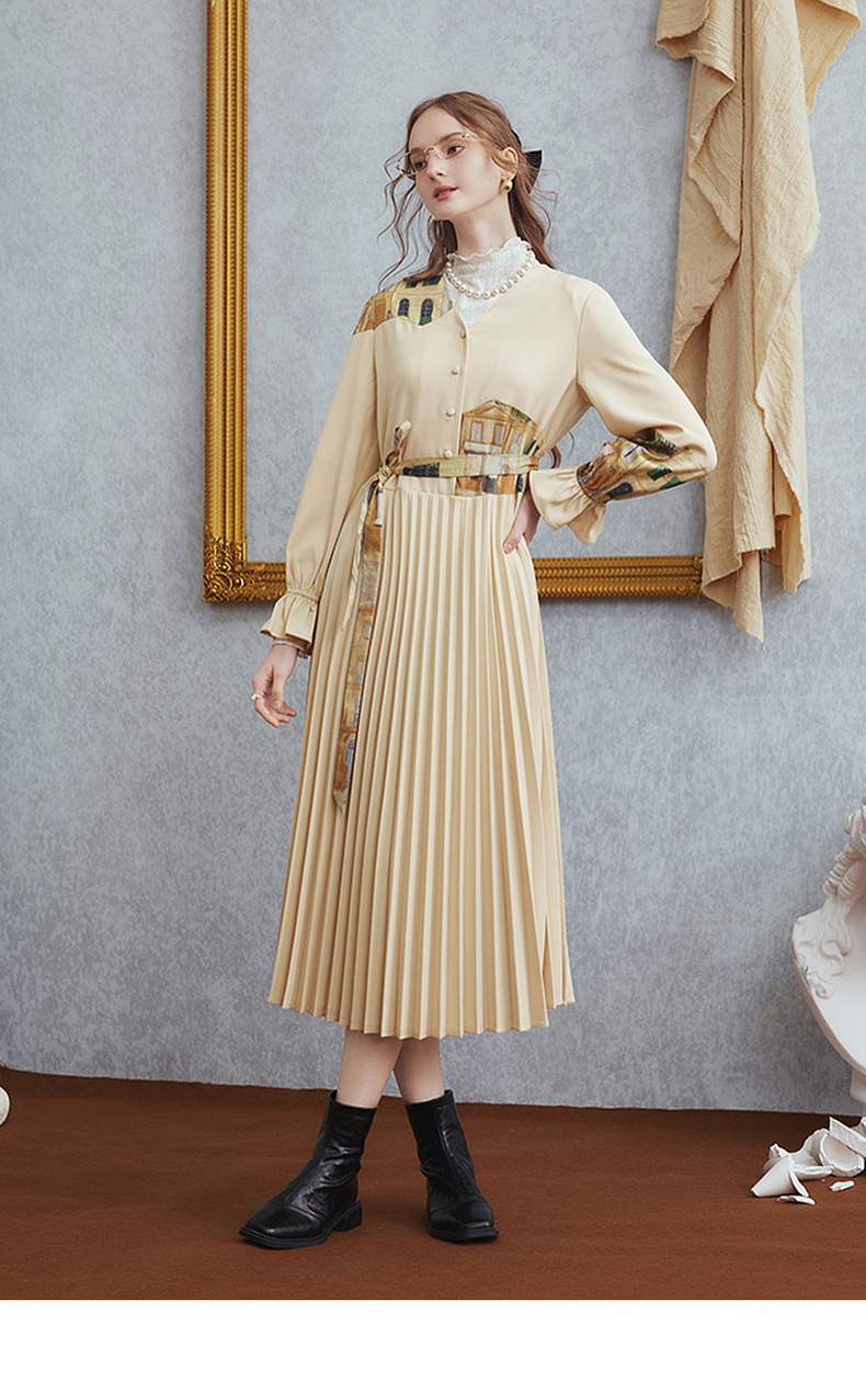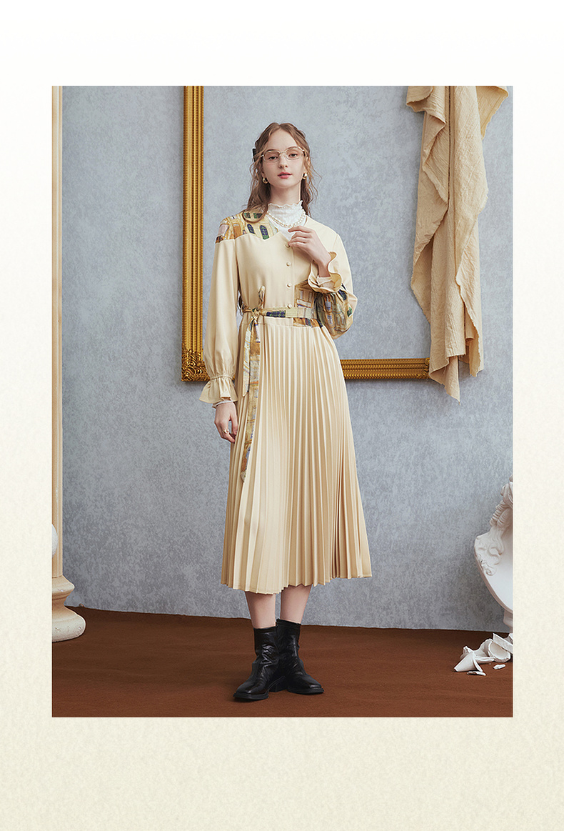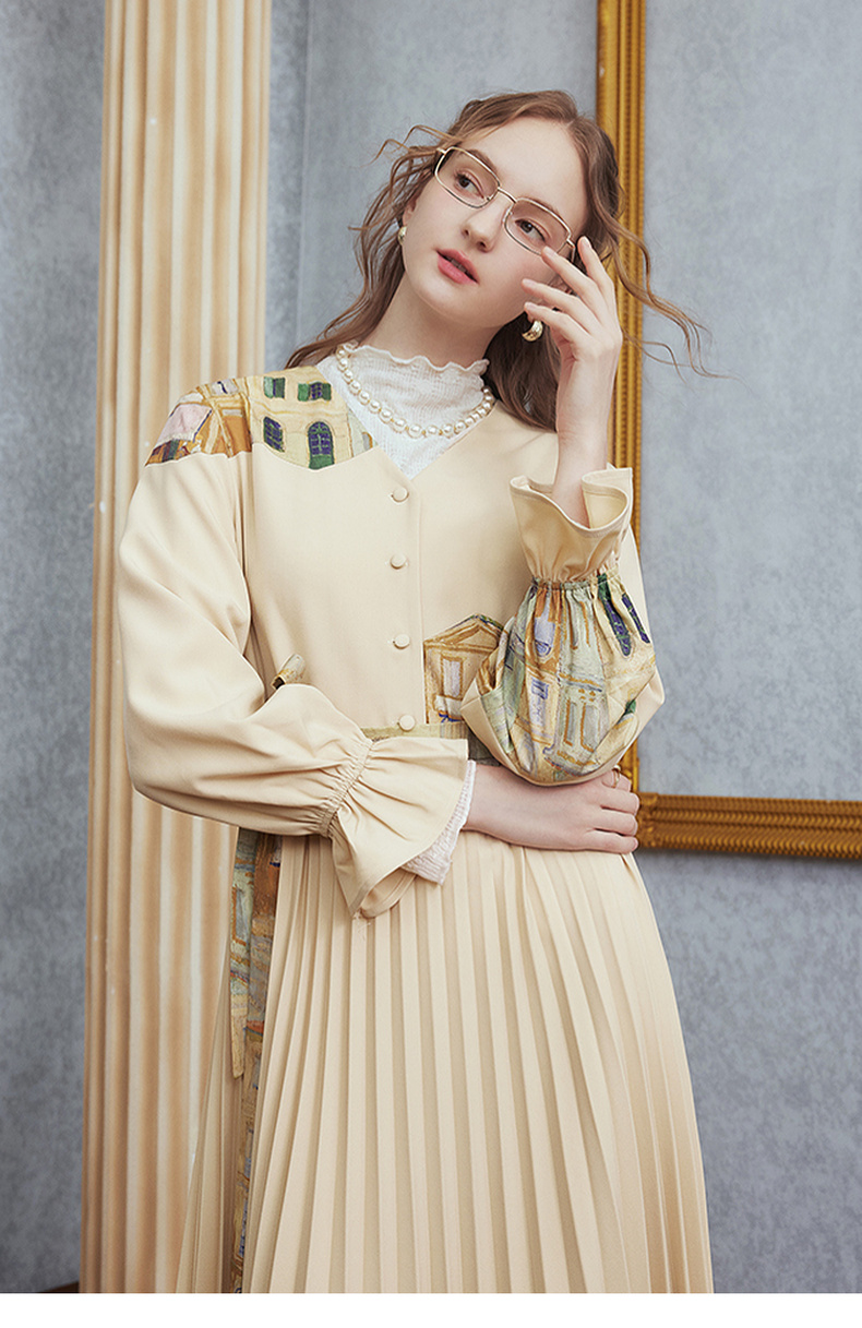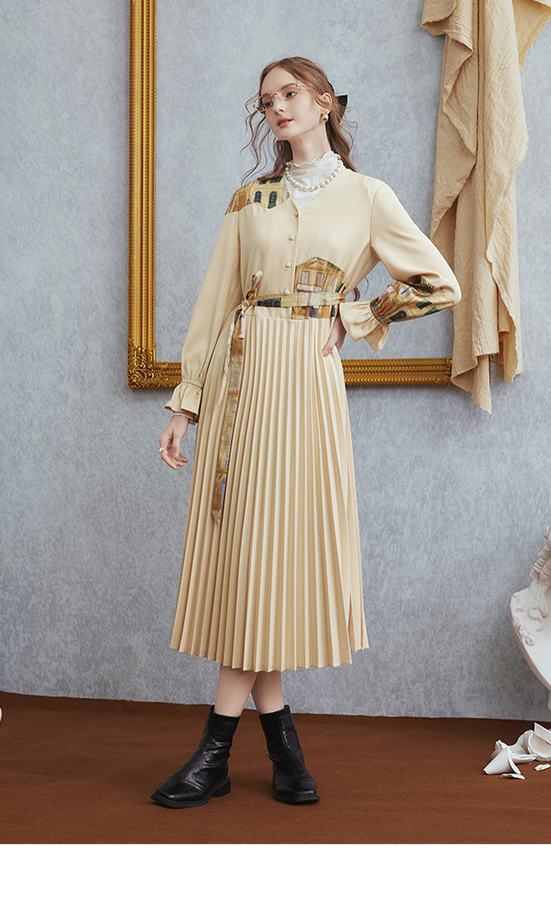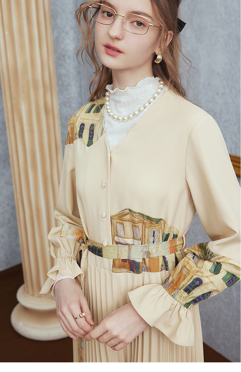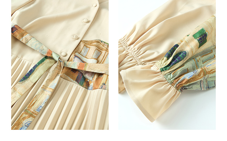 两三事梵高文艺错位空间2025秋季新款印花拼接百褶裙摆绑带连衣裙