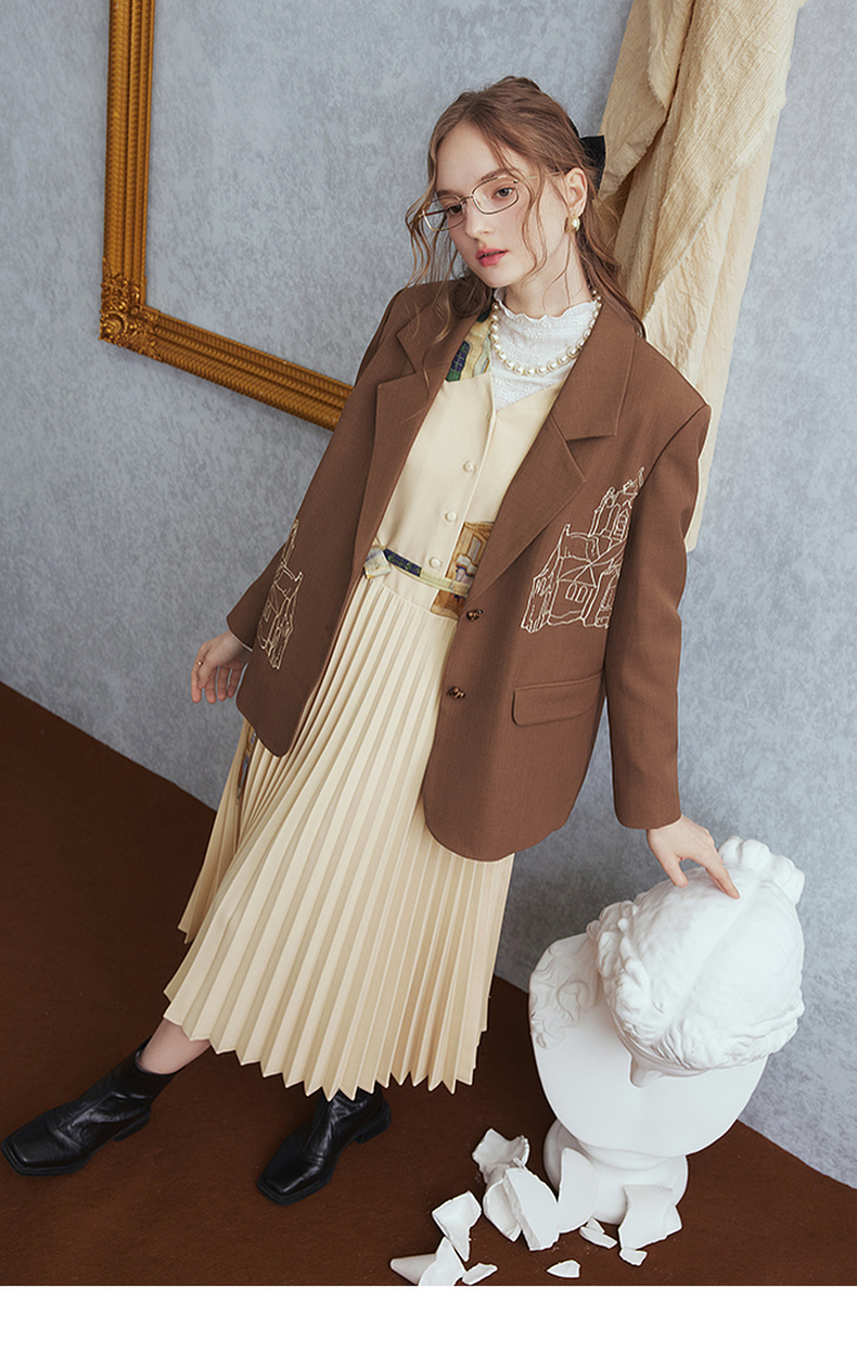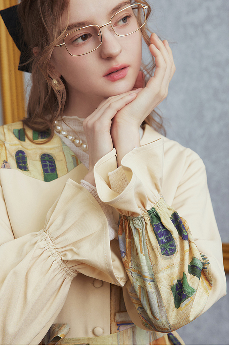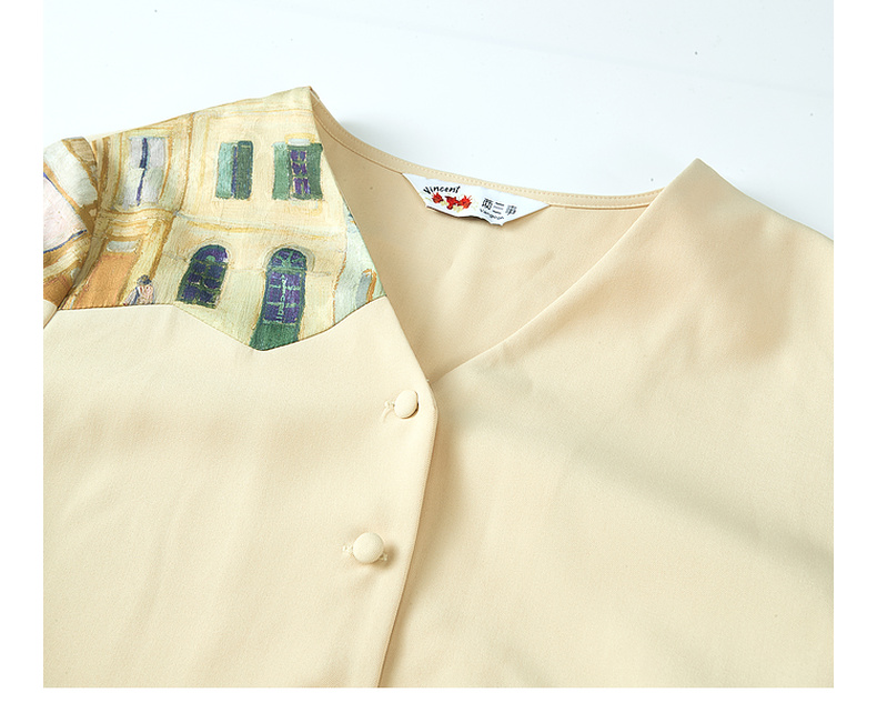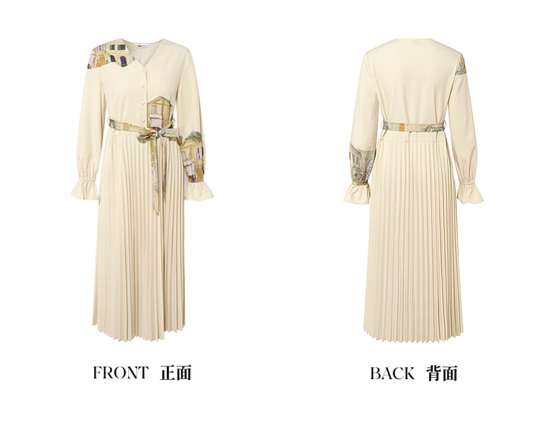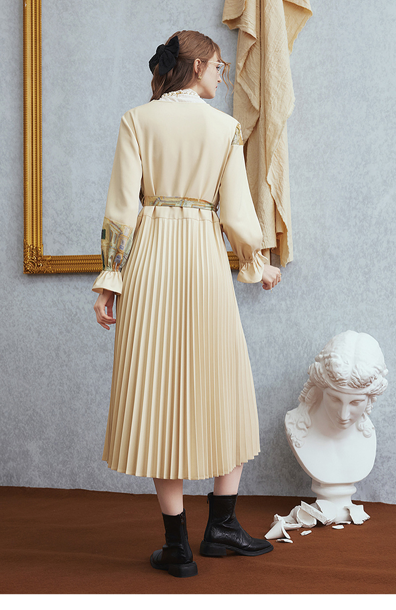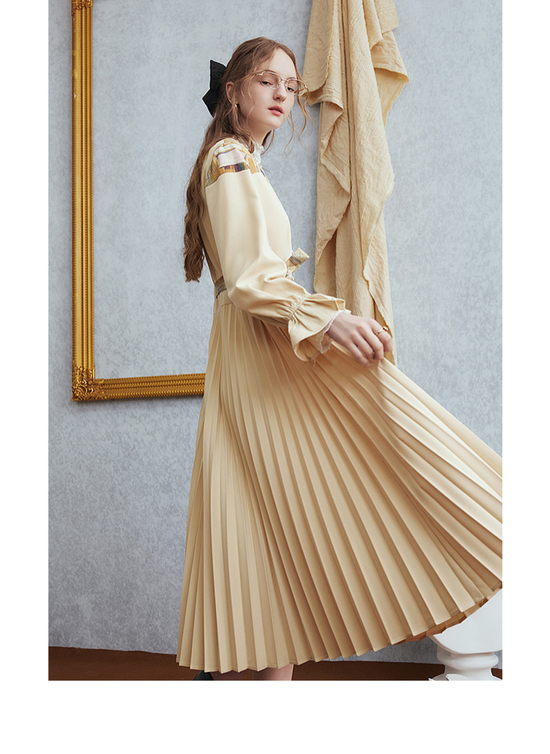 两三事梵高文艺错位空间2025秋季新款印花拼接百褶裙摆绑带连衣裙