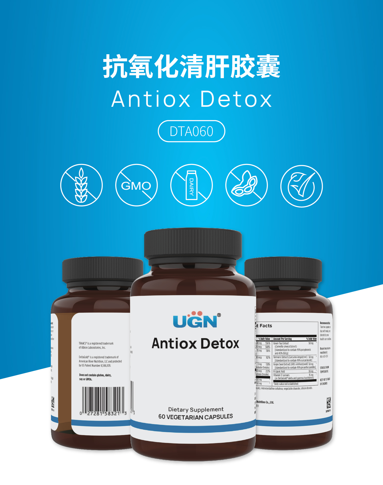 Antiox Detox提供肝脏I期和II期代谢所需营养,这些营养与谷胱甘肽水平、肝脏活力、自由基水平相关。