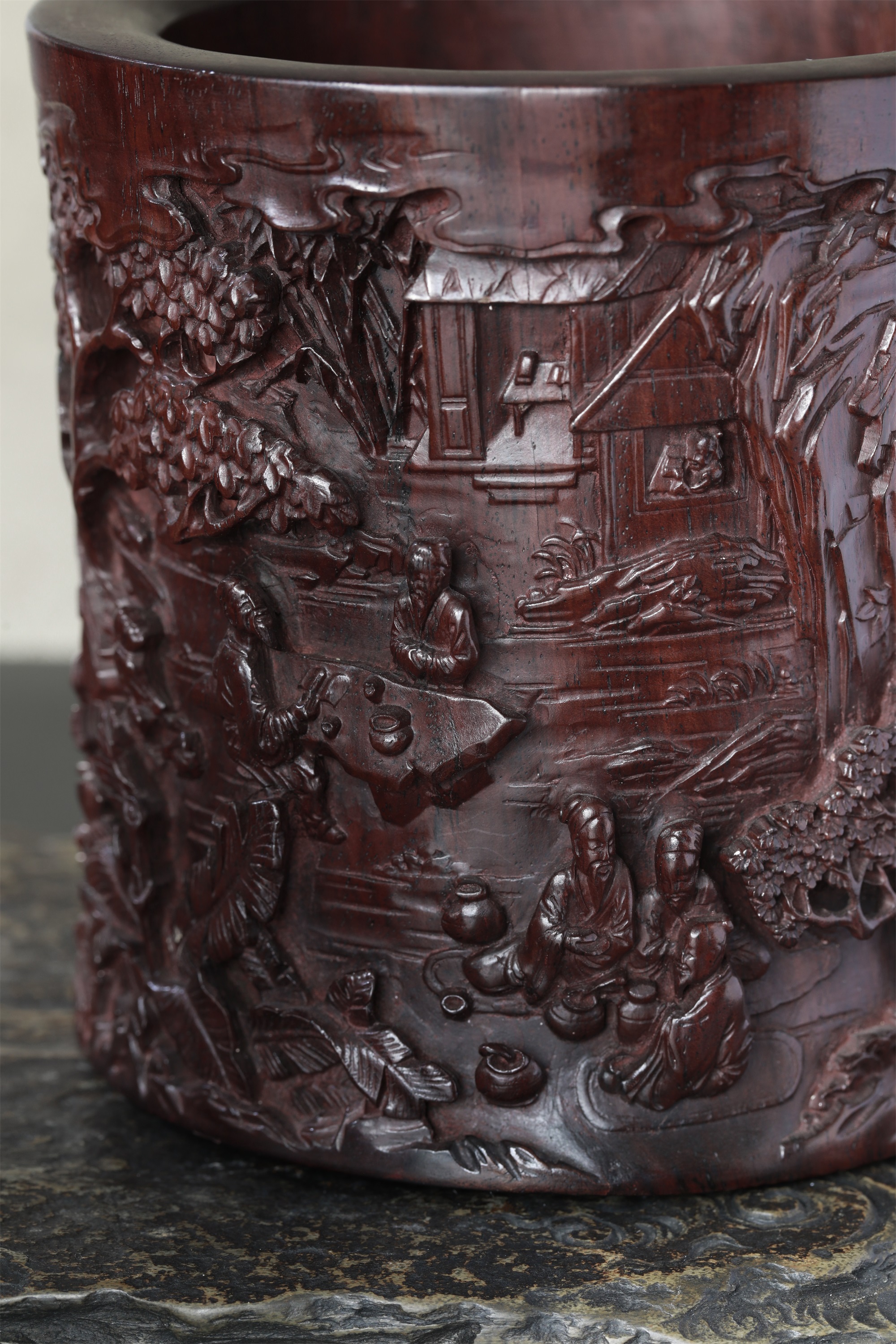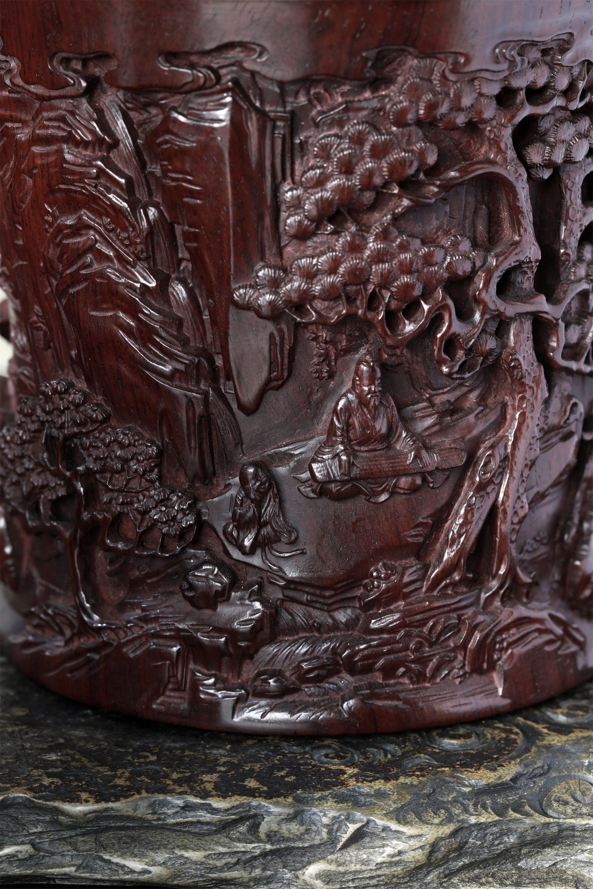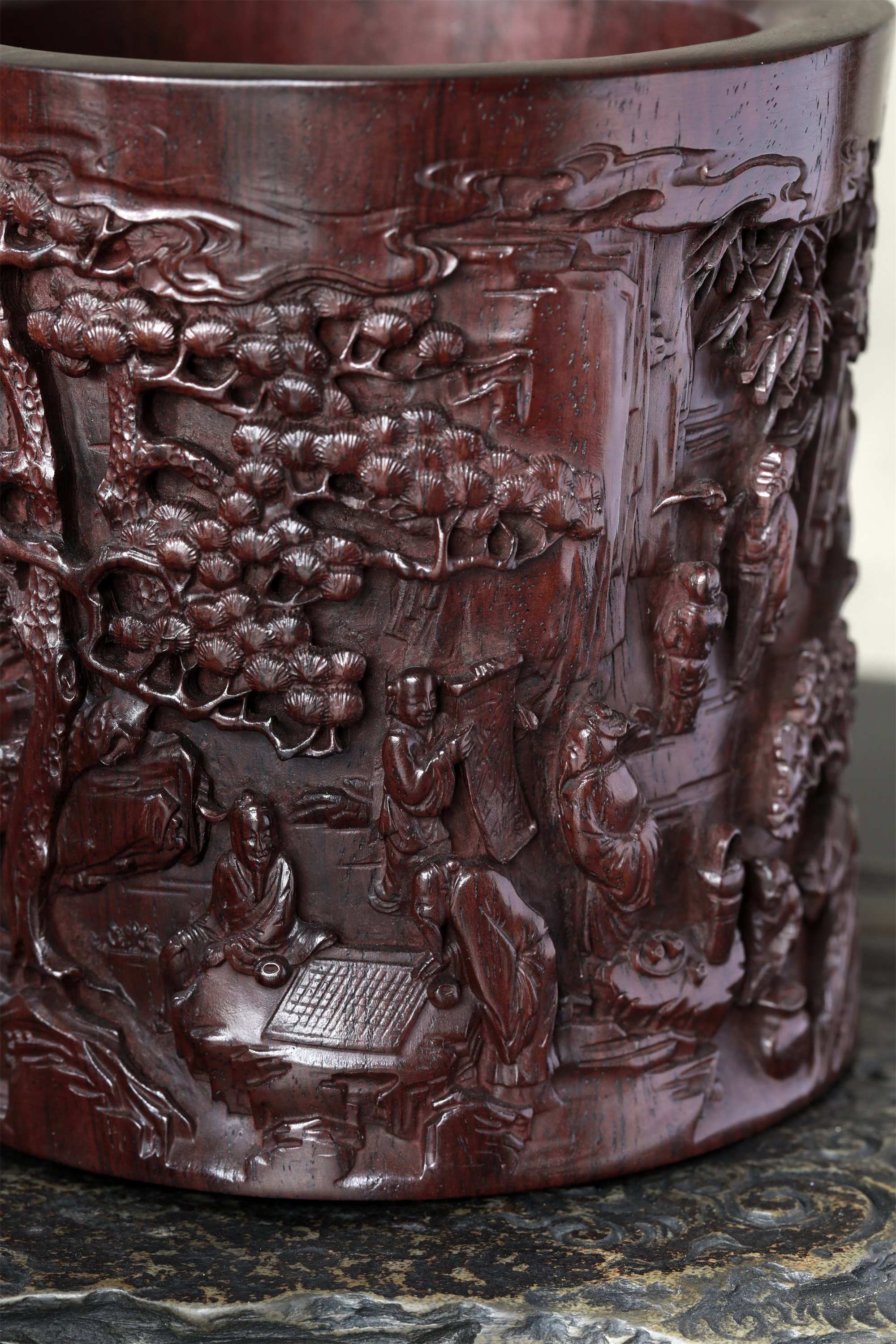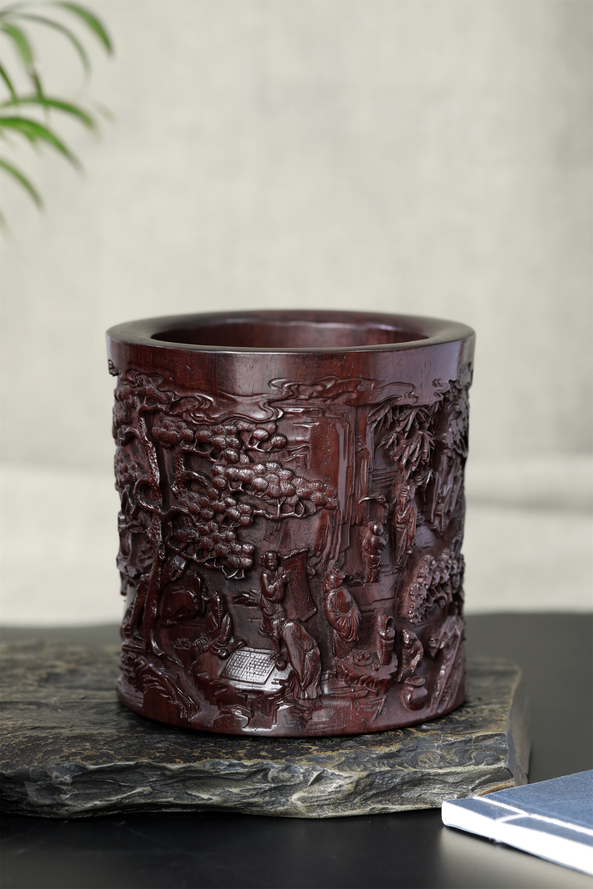 作品采用了传统徽派深浅浮雕及镂空雕等雕刻技艺。筒身雕刻山峰连绵起伏,云绕虬松,松枝悬垂,树木古朴苍深。几组老翁相间,或对弈、或赏画、或抚琴、或读书品茗……画面意境深远,格调清风高雅。作品构图得体合理,人物刻画栩栩如生,动态感强,面部表情刻画丰富,显示了人物的雍容华贵、温文尔雅暗藏着对高雅文化的崇尚之意。