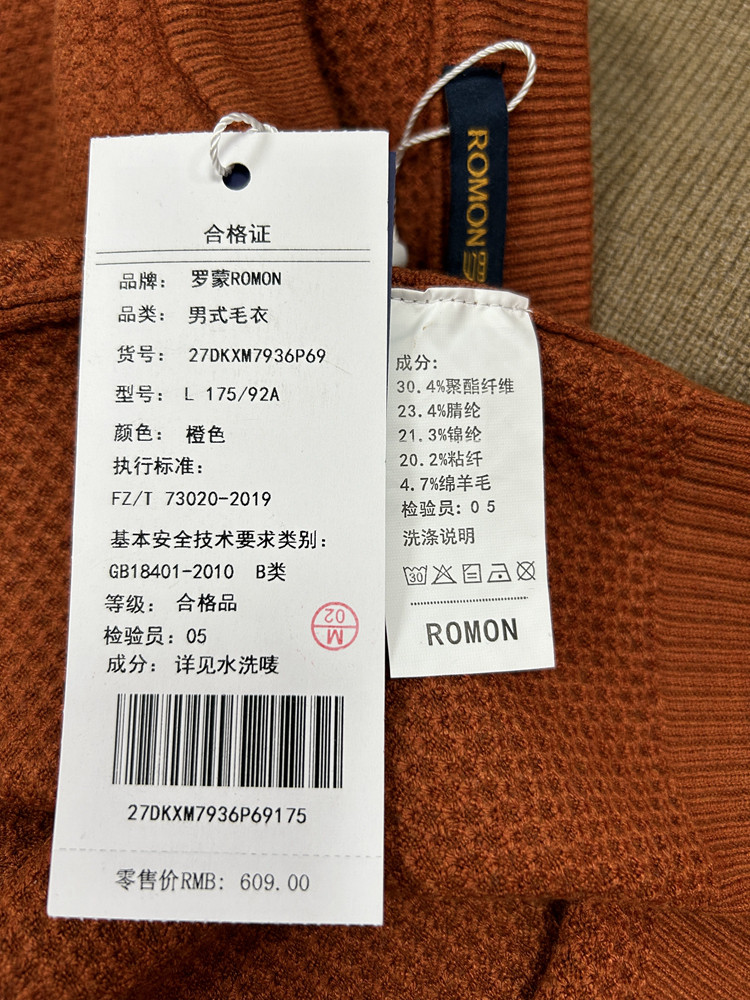 面料:聚酯纤维 30.4%腈纶 23.4%锦纶 21.3%粘纤 20.2%绵羊毛 4.7%
