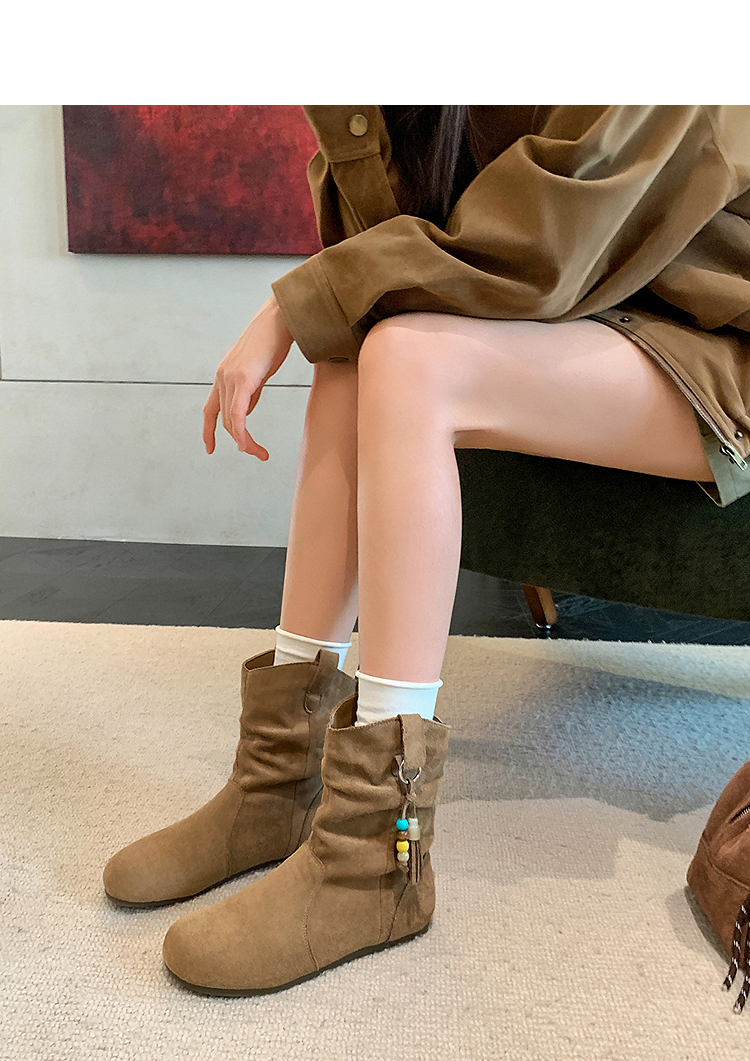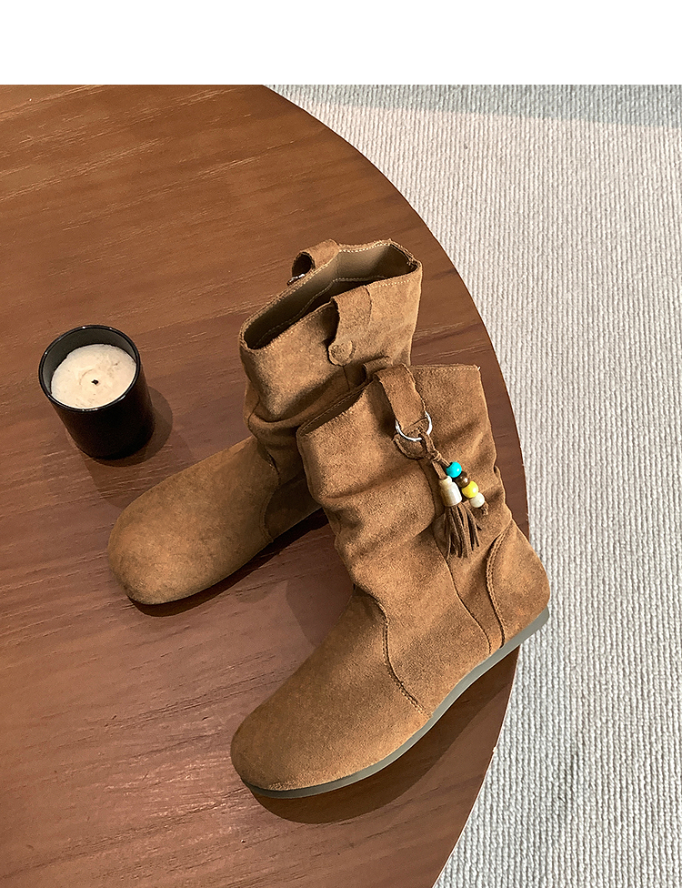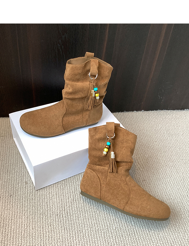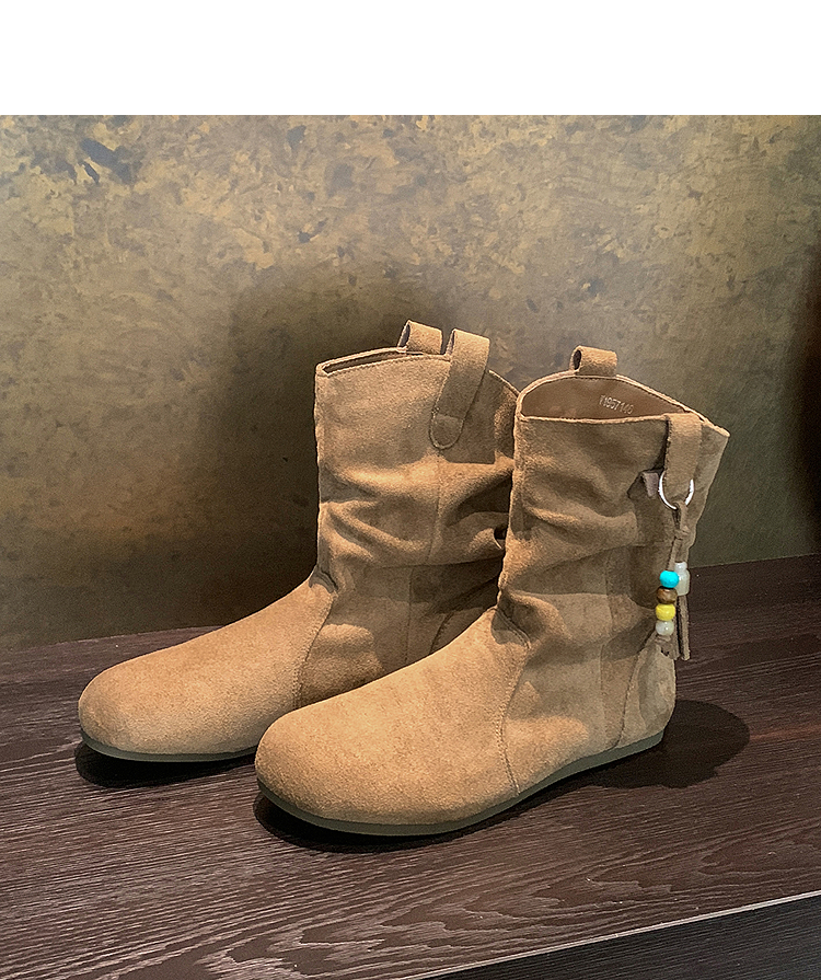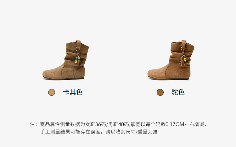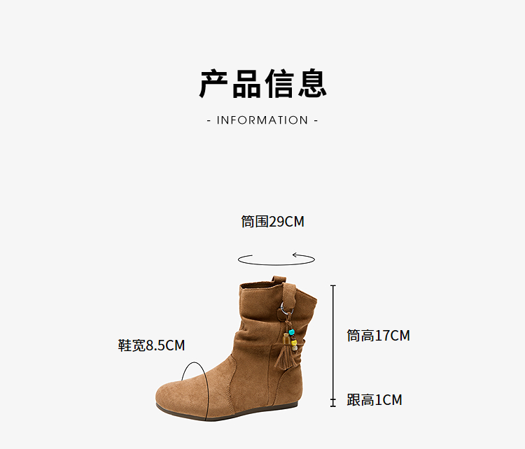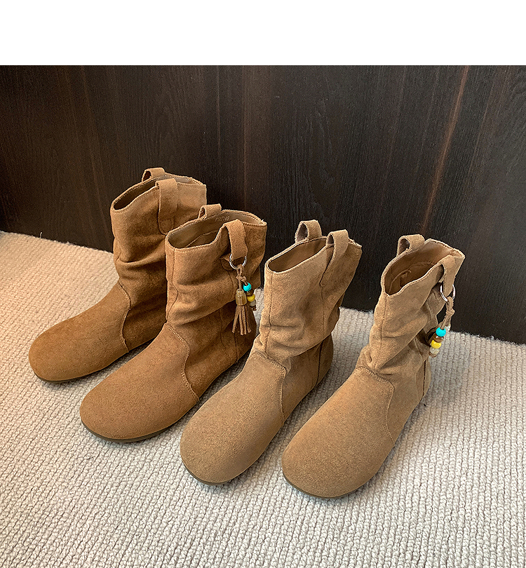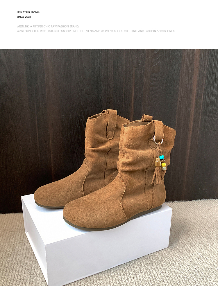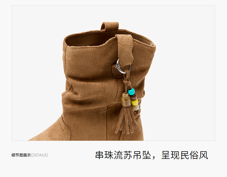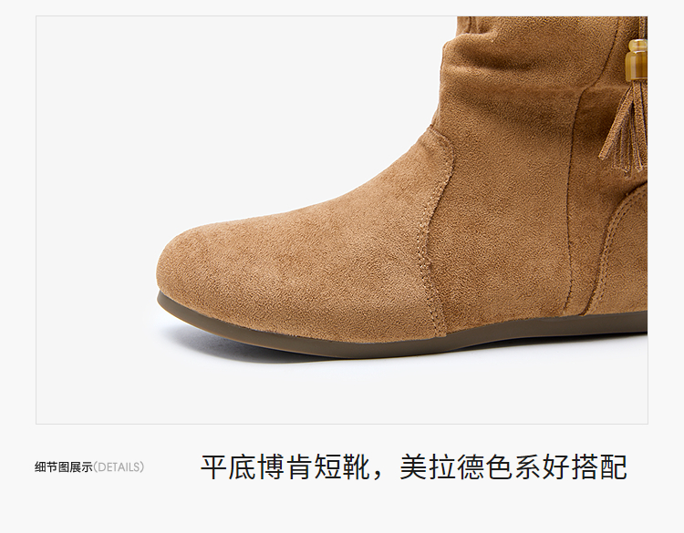 西遇勃肯短靴女新款秋季复古美拉德流苏圆头平底堆堆靴西部靴V1957146