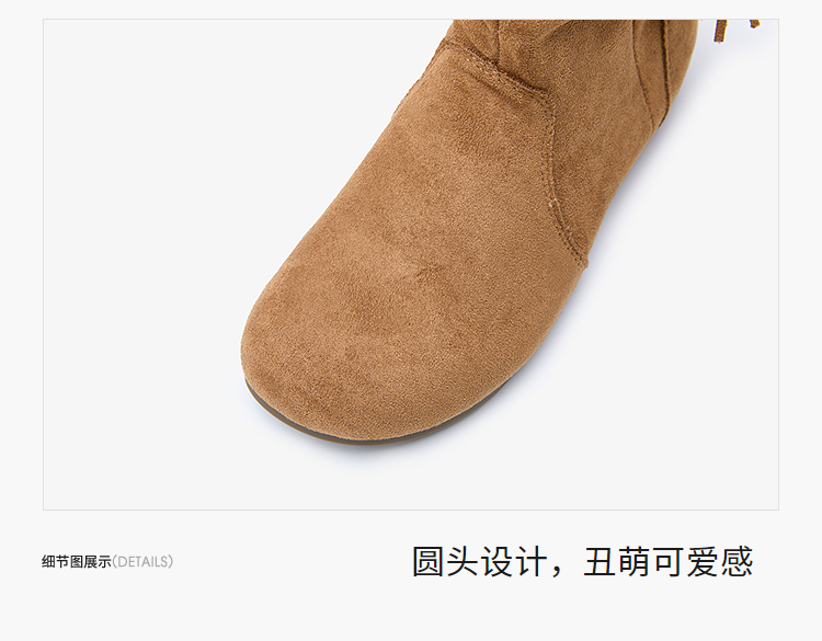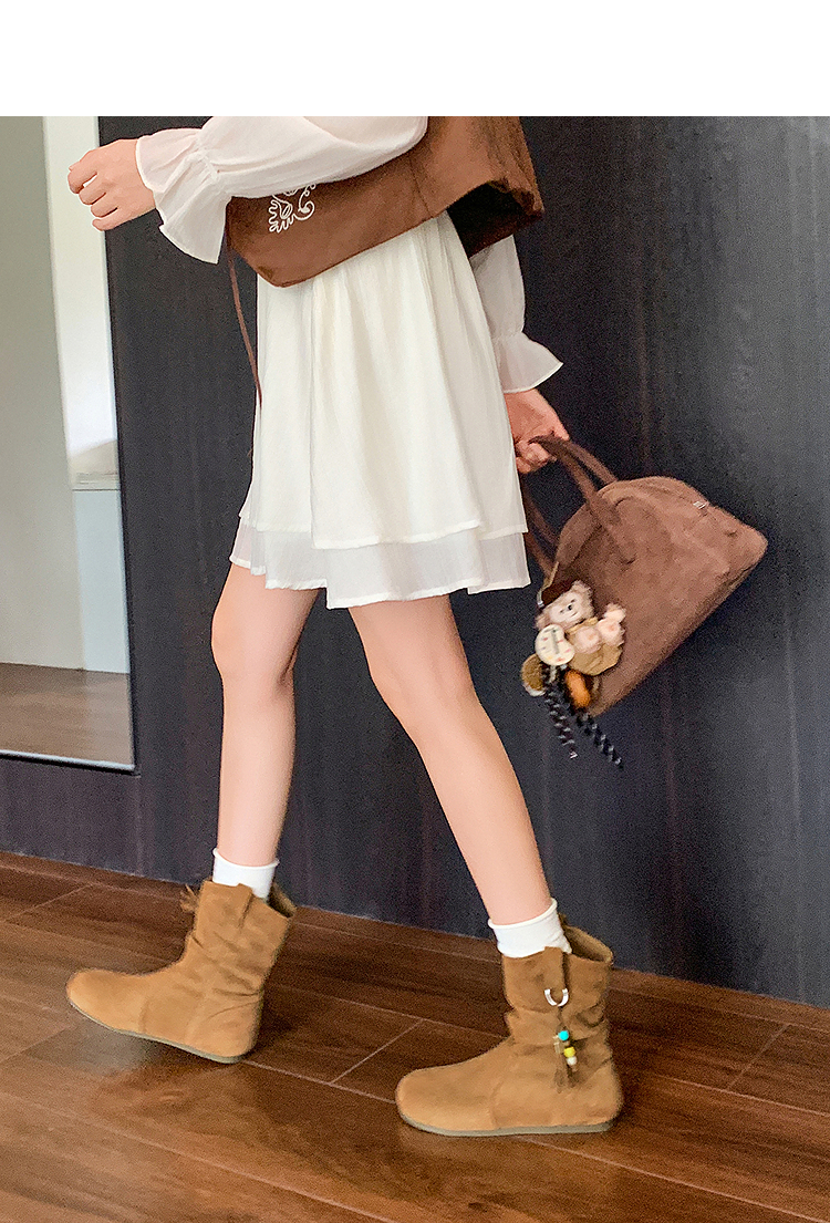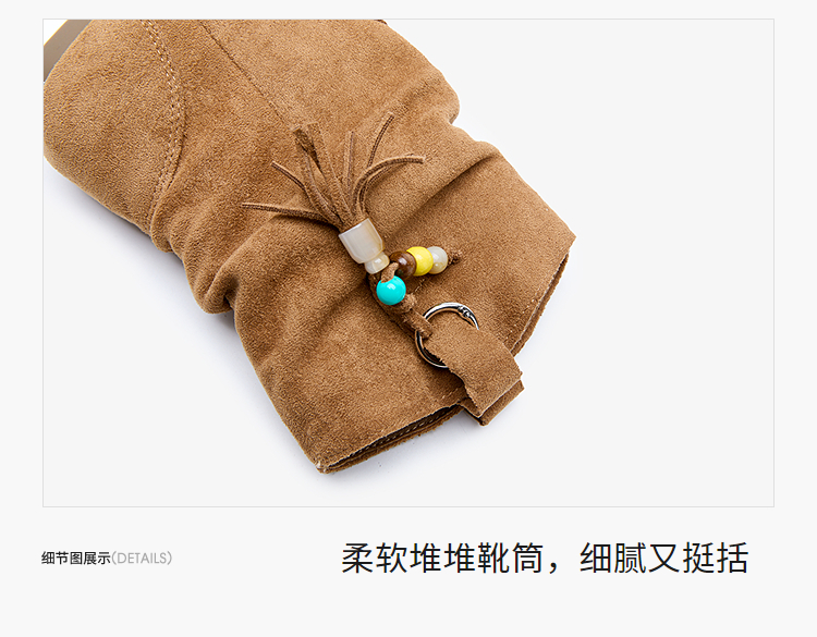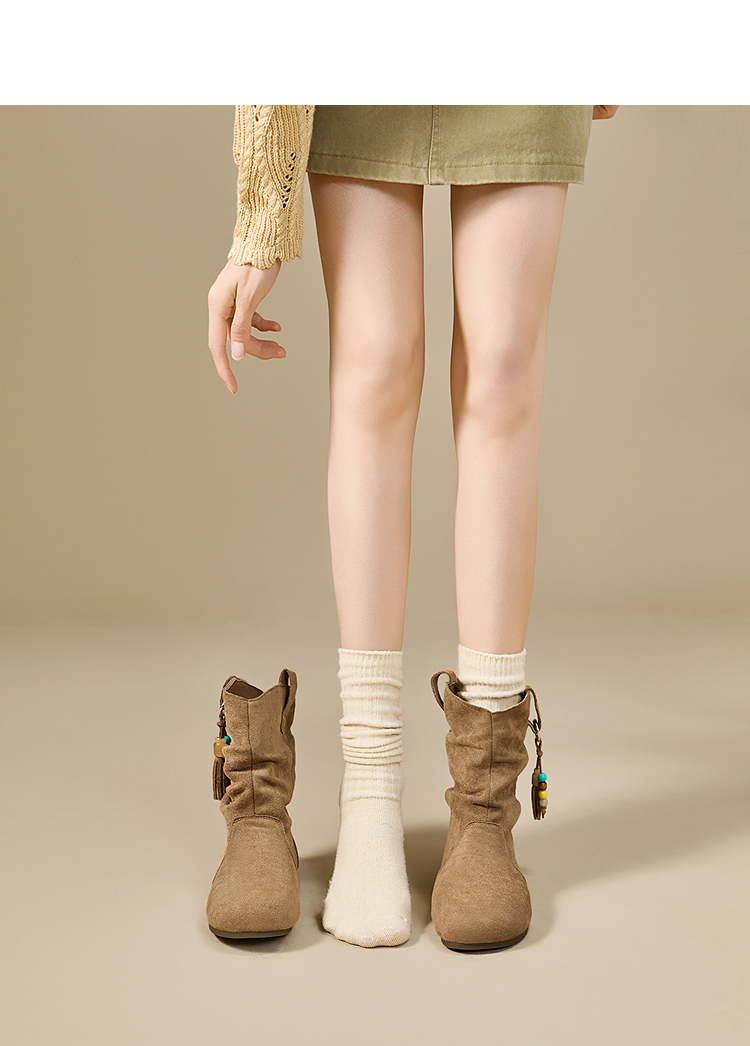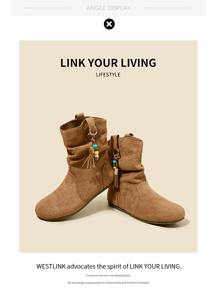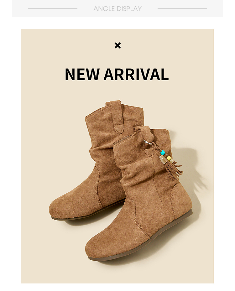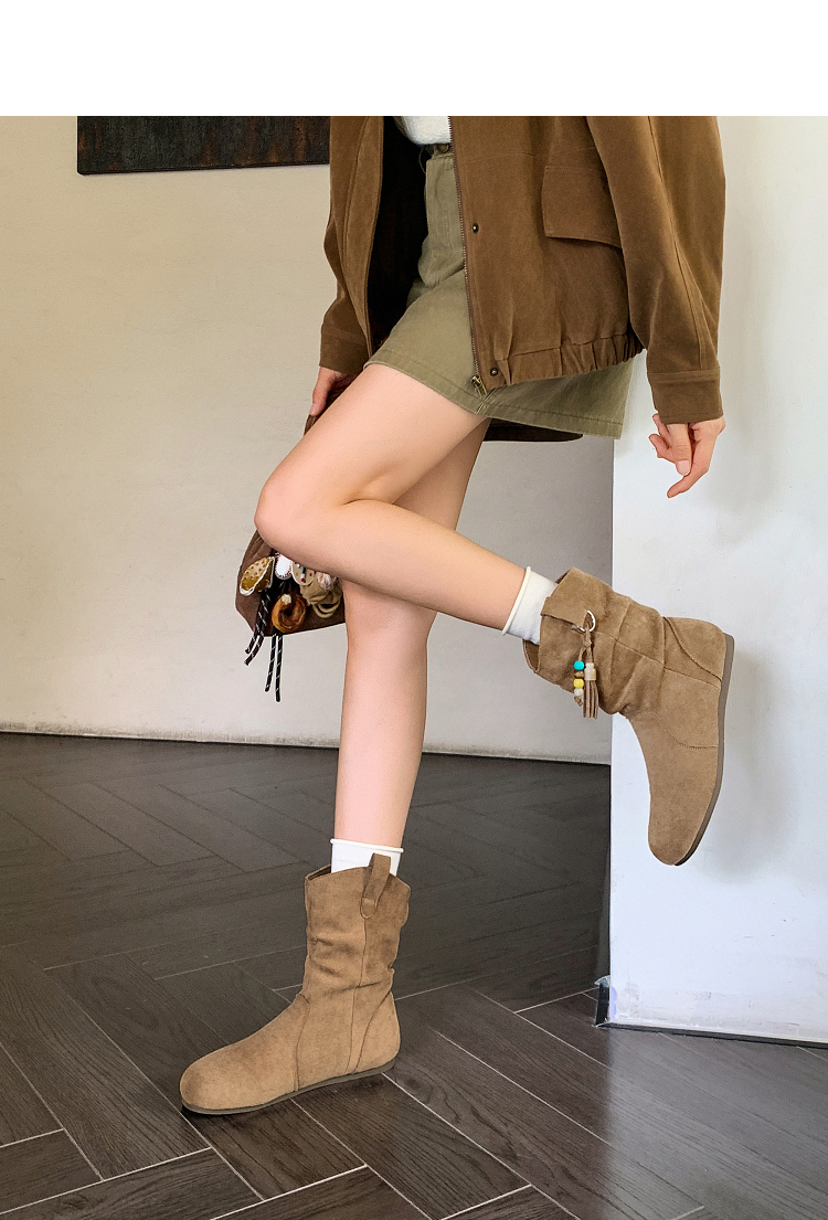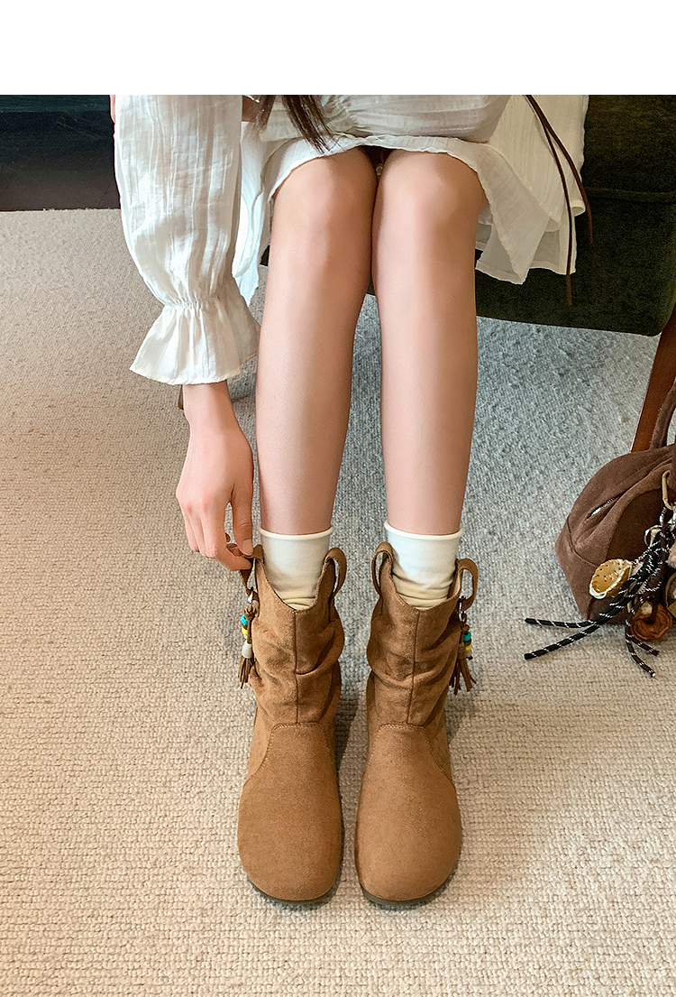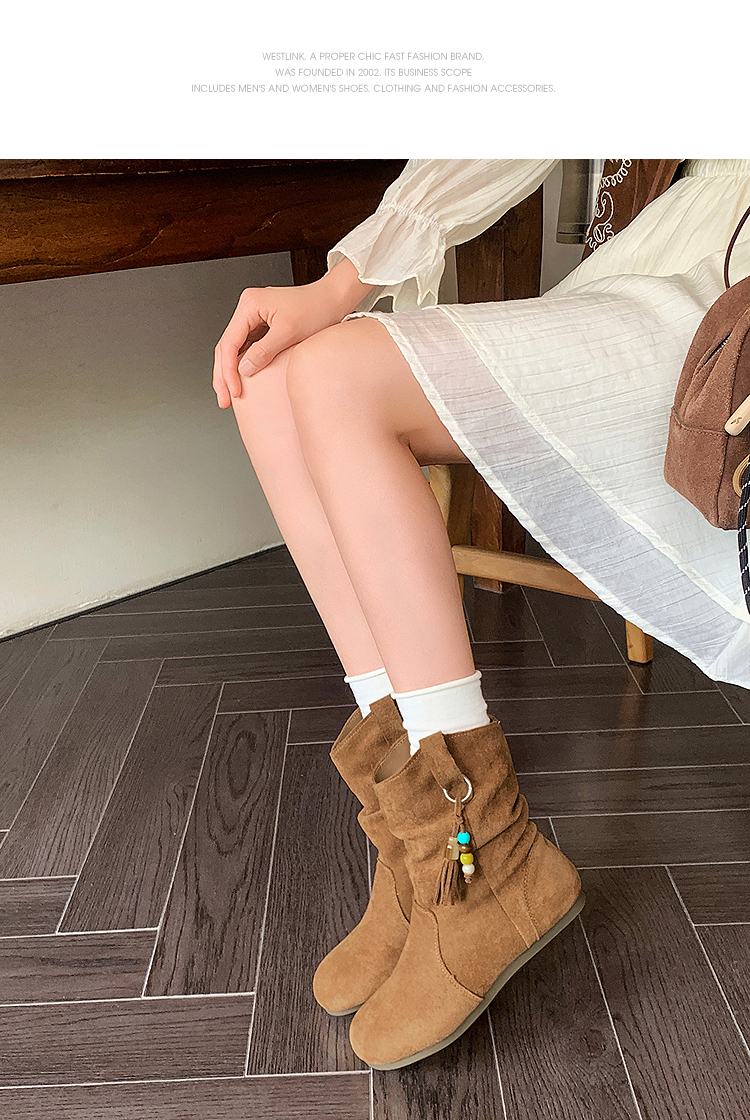 西遇勃肯短靴女新款秋季复古美拉德流苏圆头平底堆堆靴西部靴V1957146