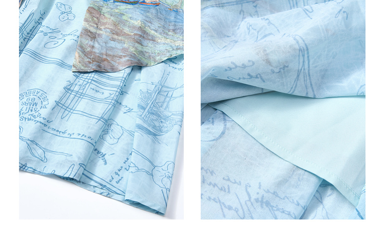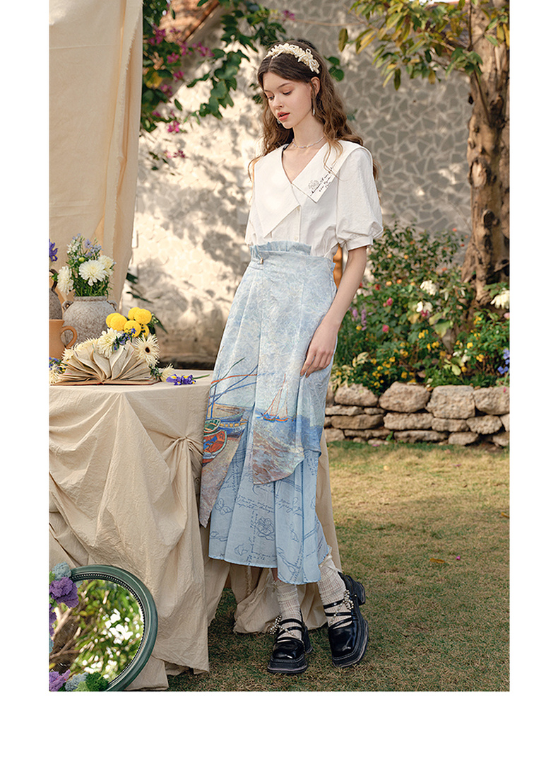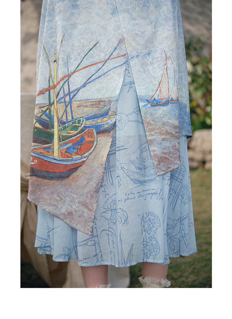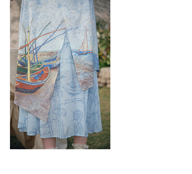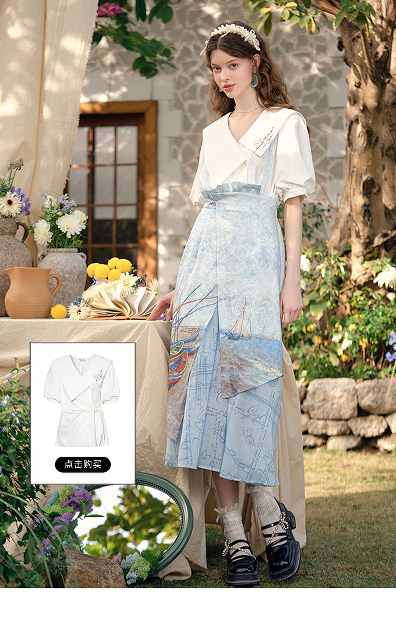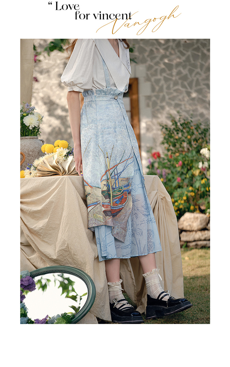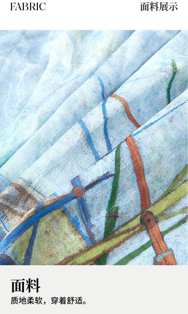 两三事梵高文艺艺术长廊2025夏季新款复古印花抽绳绑带两穿半身裙