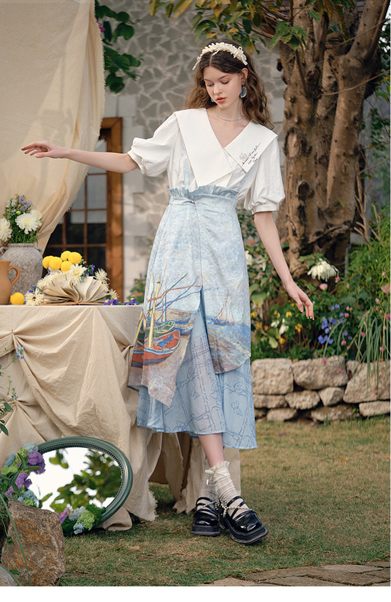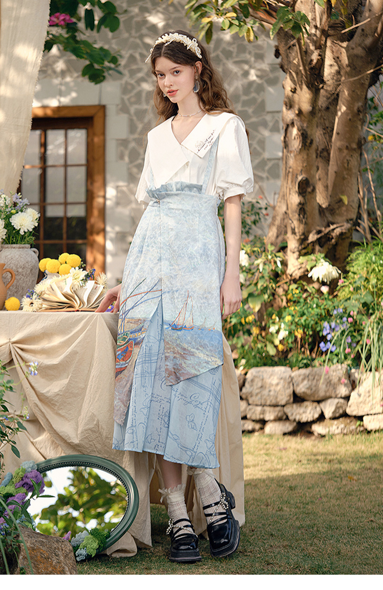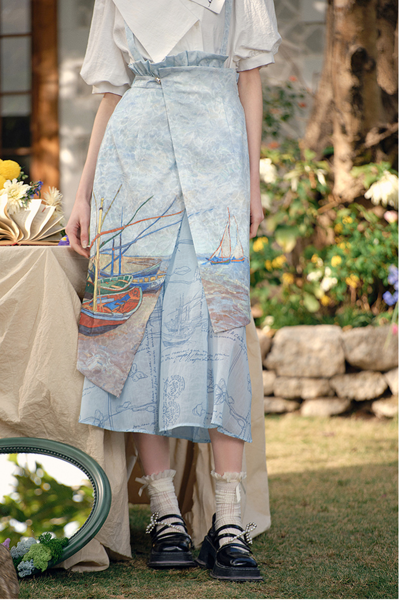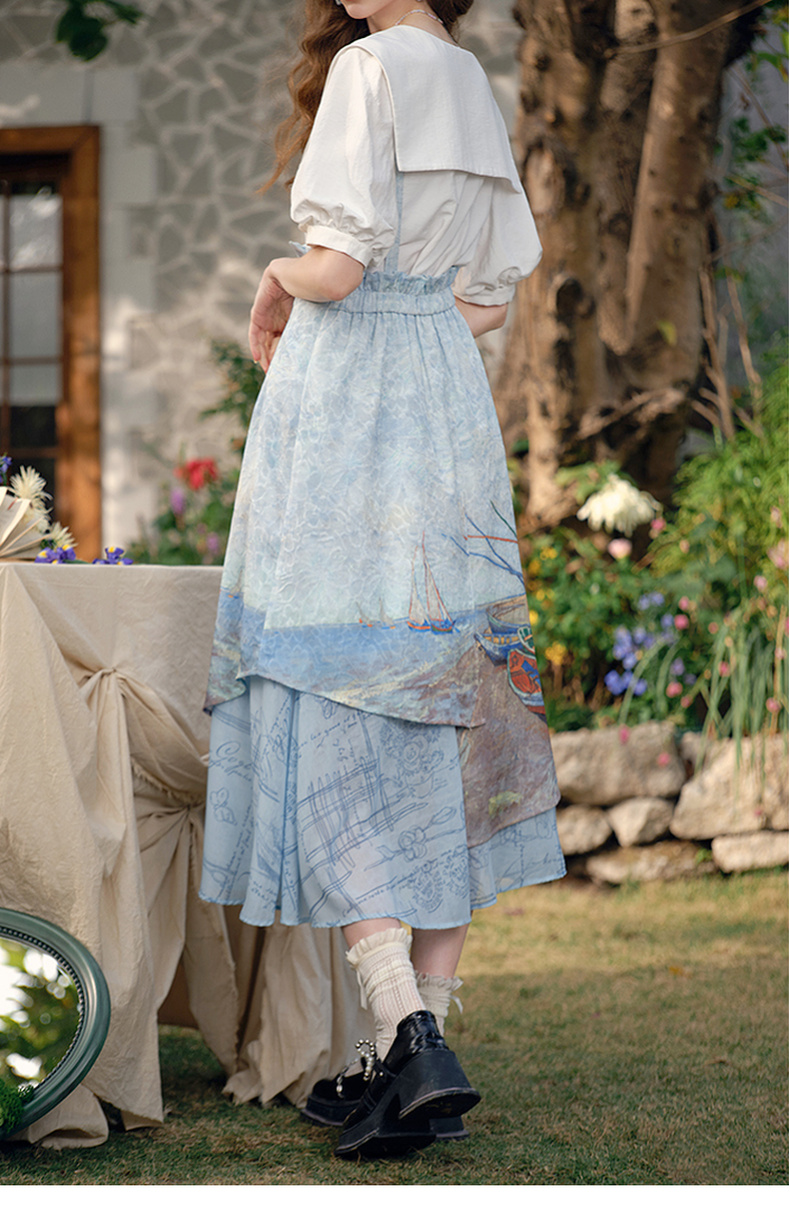 两三事梵高文艺 云汐海海 2025春季新款复古印花背带裙高腰半身裙S25CKB326