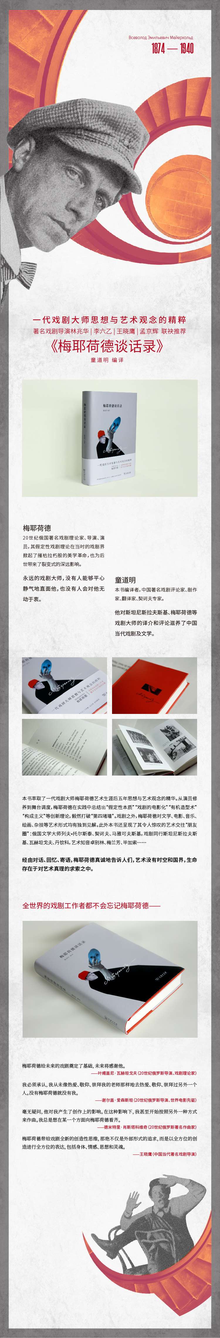 本书萃取了一代戏剧大师梅耶荷德艺术生涯最后五年思想与艺术观念的精华。从演员修养到舞台调度,梅耶荷德在实践中总结出“假定性本质”“戏剧的电影化”“有机造型术”“构成主义”等创新理论,毅然打破“第四堵墙”。戏剧之外,梅耶荷德对文学、电影、音乐、绘画、杂技等艺术形式均有独到见解。书中还从不同侧面呈现了其令人惊叹的艺术交往“朋友圈”:俄国文学大师列夫•托尔斯泰、契诃夫、马雅可夫斯基,戏剧同行斯坦尼斯拉夫斯基、瓦赫坦戈夫、丹钦科,艺术知音卓别林、梅兰芳、毕加索等,梅耶荷德甚至预言“未来戏剧艺术”的方向之一便是西欧戏剧艺术和中国戏剧艺术的某种联姻”。经由对话、回忆、寄语,梅耶荷德真诚地告诉所有热爱戏剧的人,艺术没有时空和国界,生命存在于对艺术真理的求索之中。