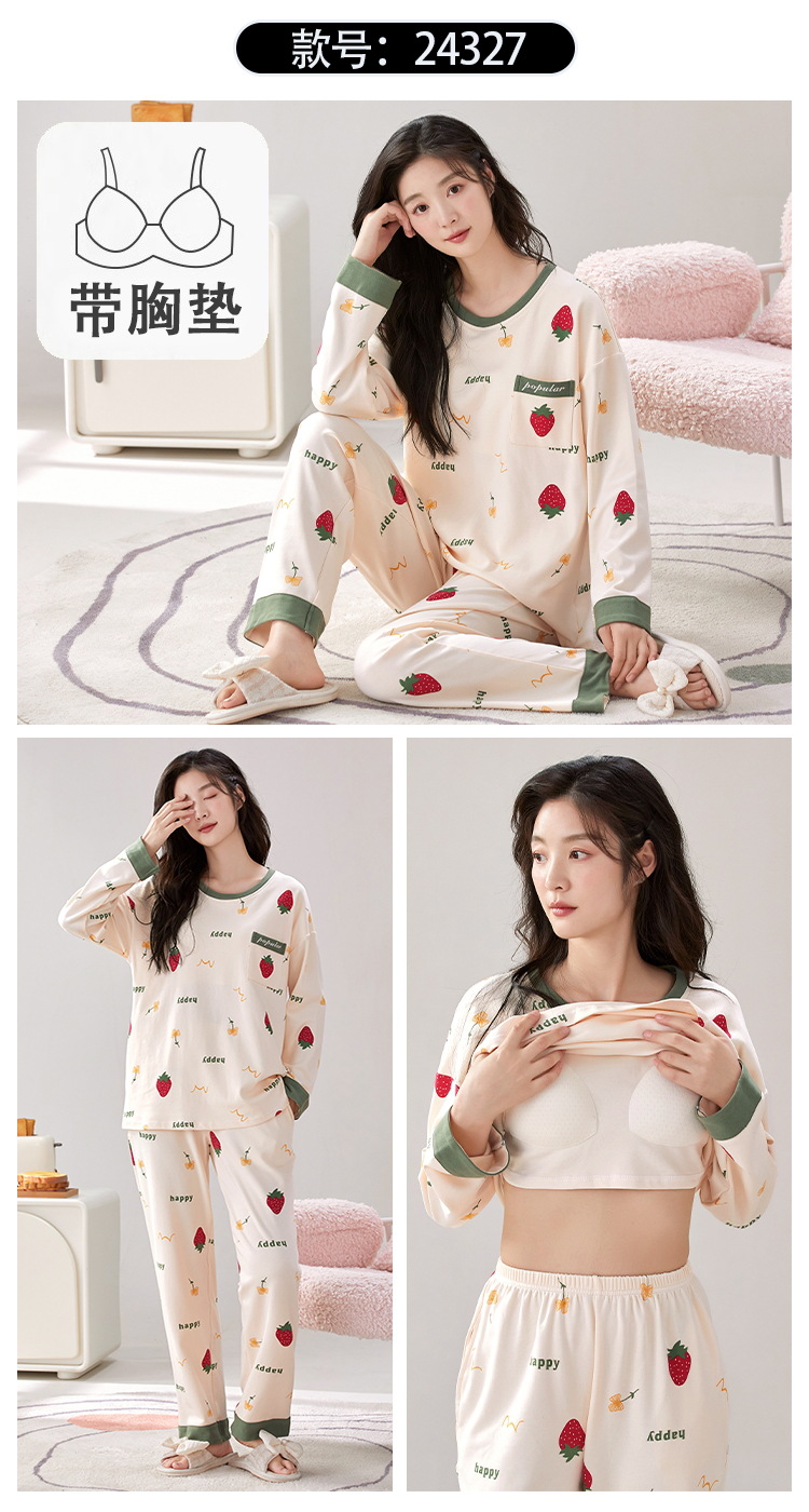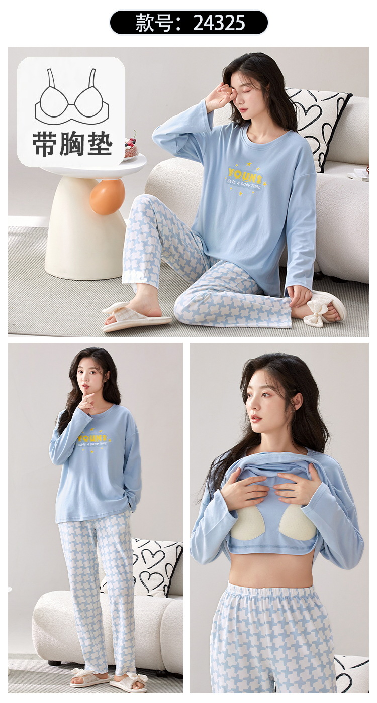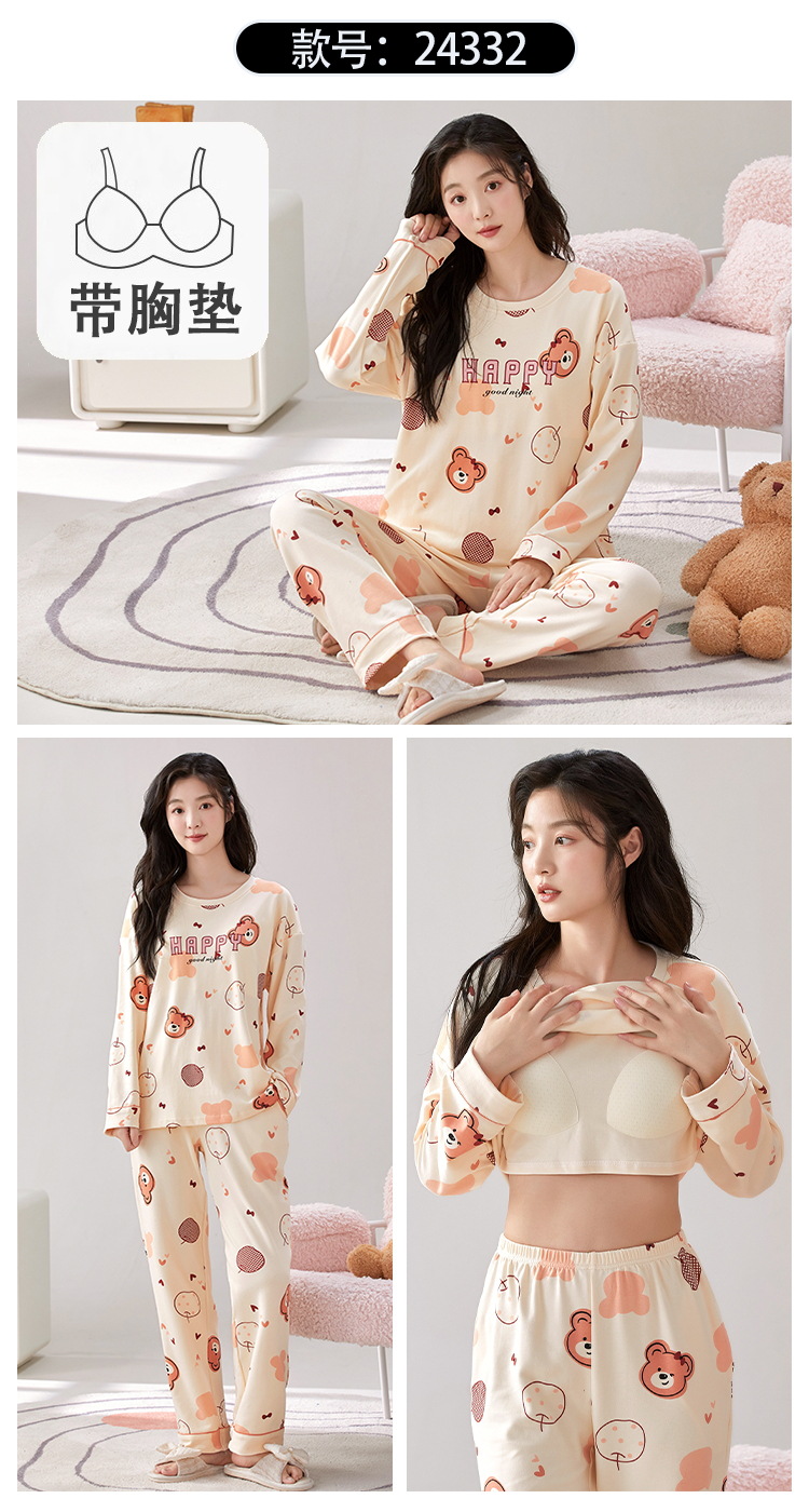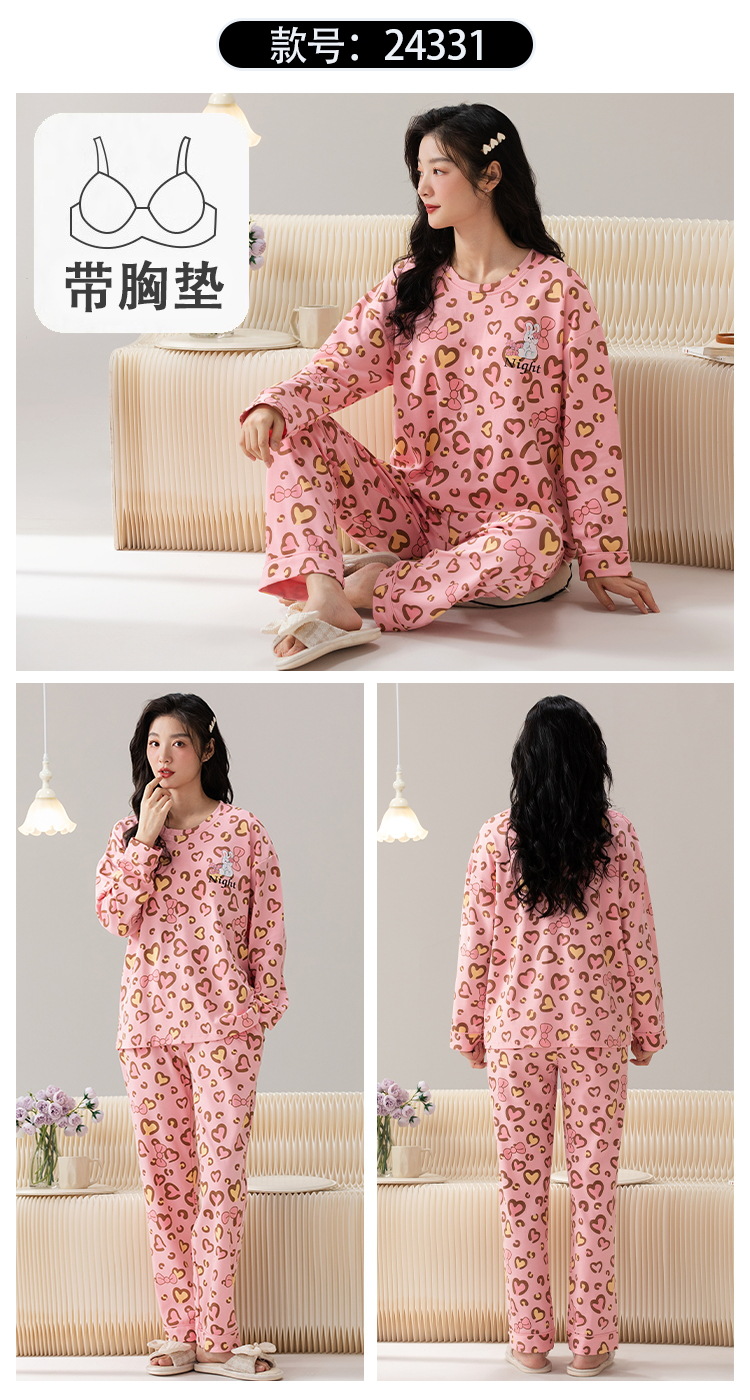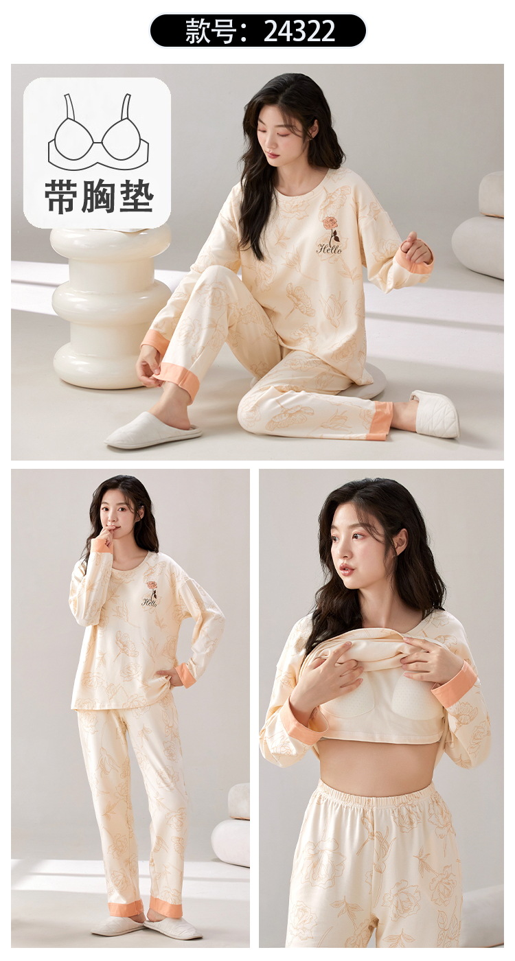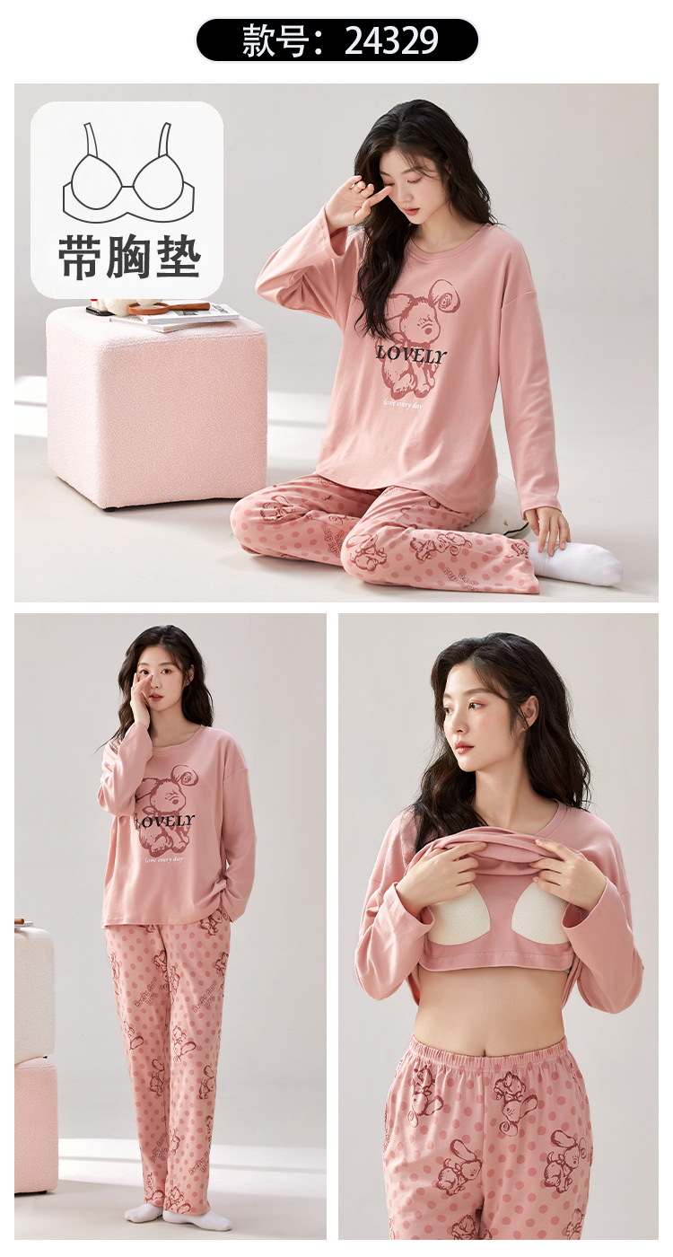 家居服秋季新款新品带胸垫春秋睡衣女长袖长裤套头甜美圆领舒适可外穿家居服