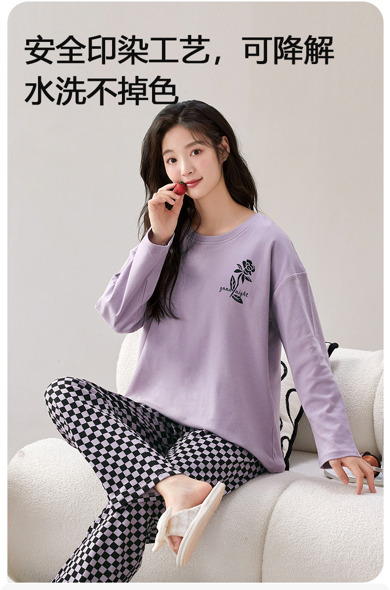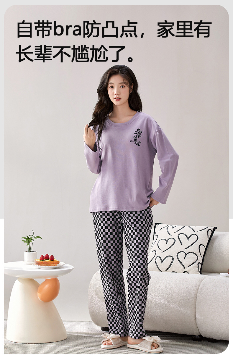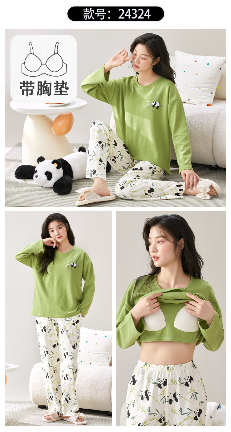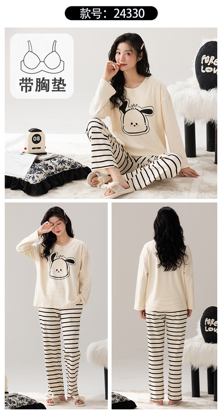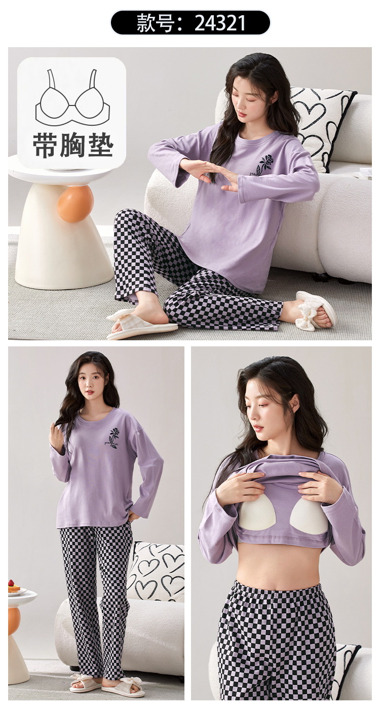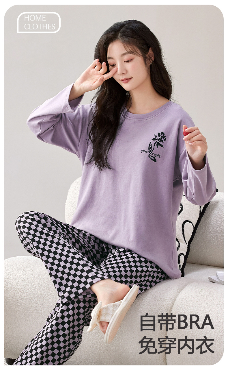 家居服秋季新款新品带胸垫春秋睡衣女长袖长裤套头甜美圆领舒适可外穿家居服