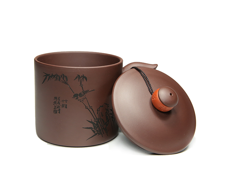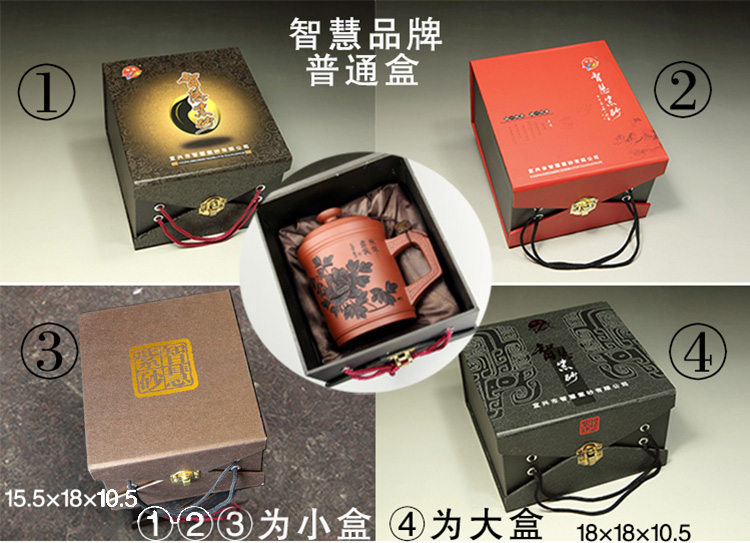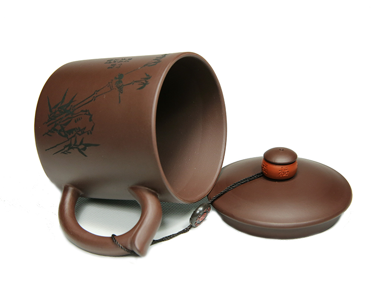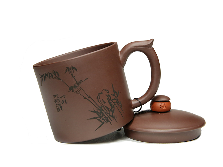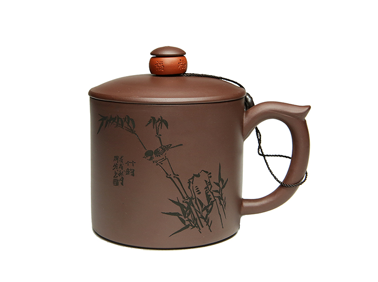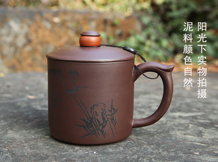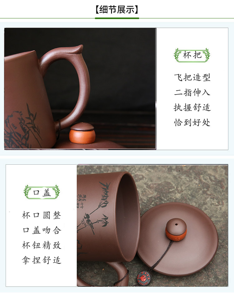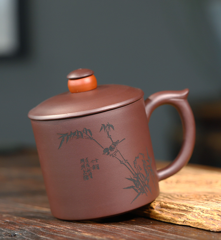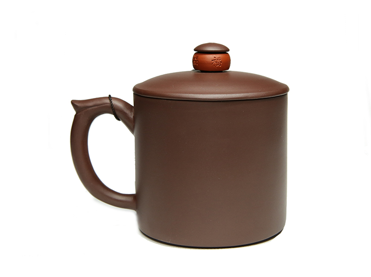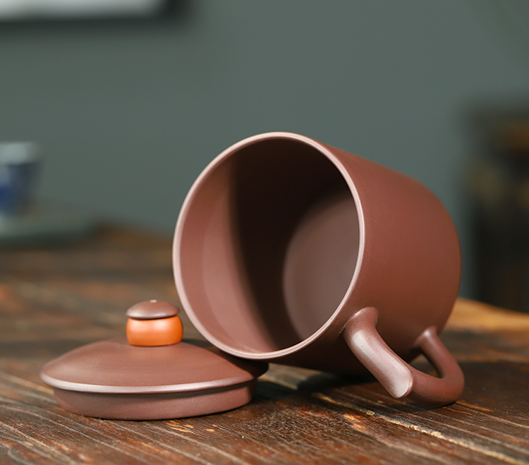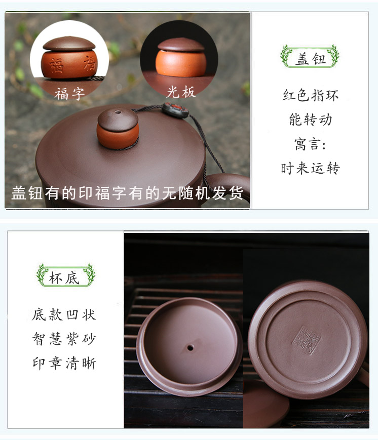 宜兴智慧紫砂福来运转杯460ml紫泥手工直筒指环盖钮泡茶杯礼盒装