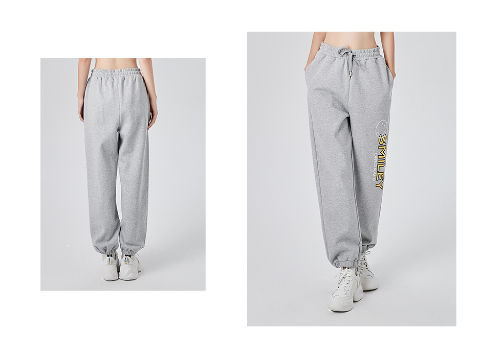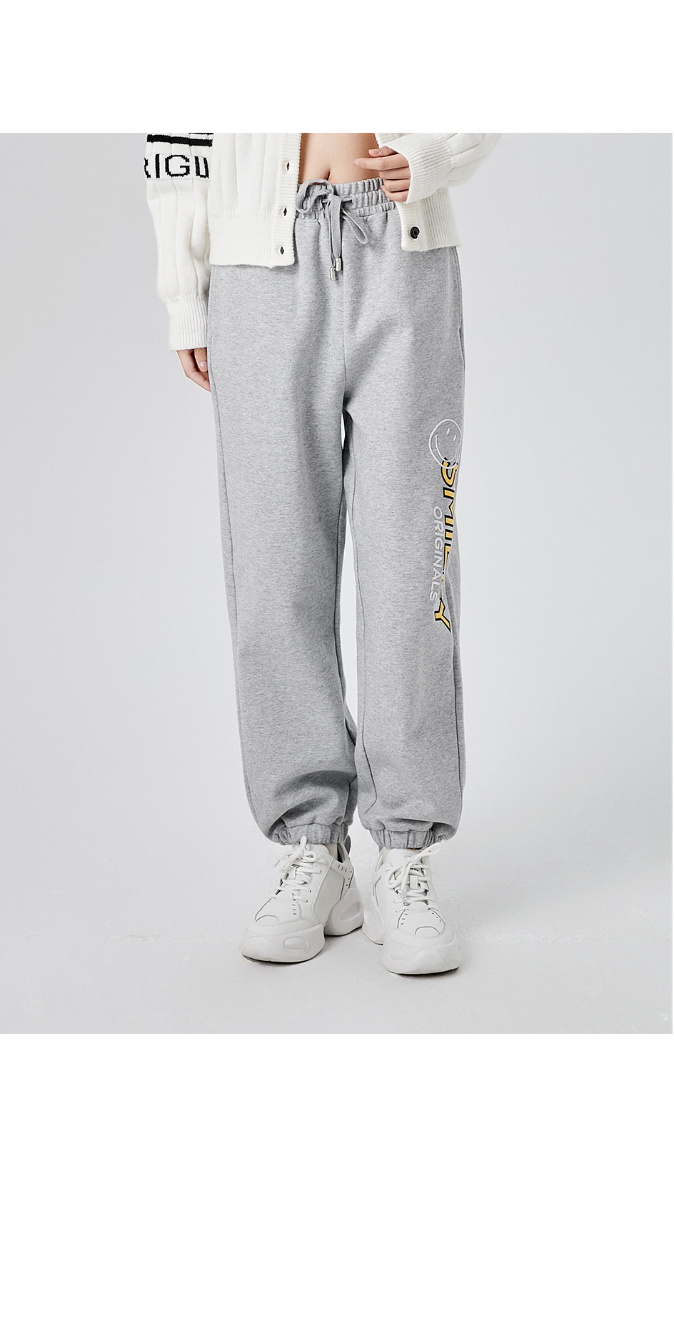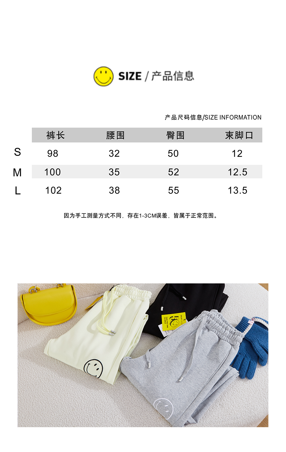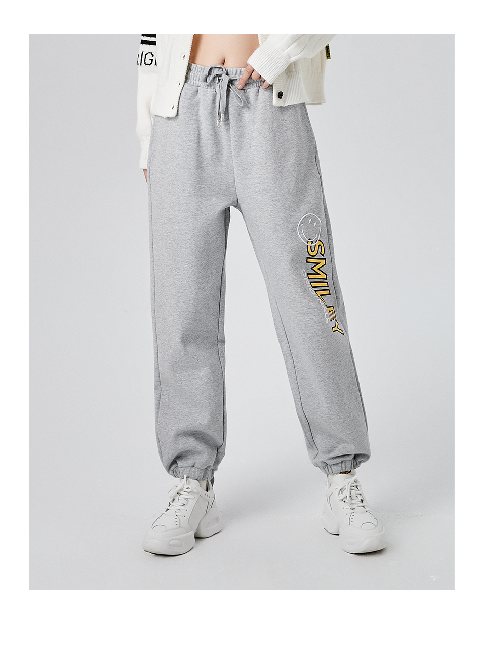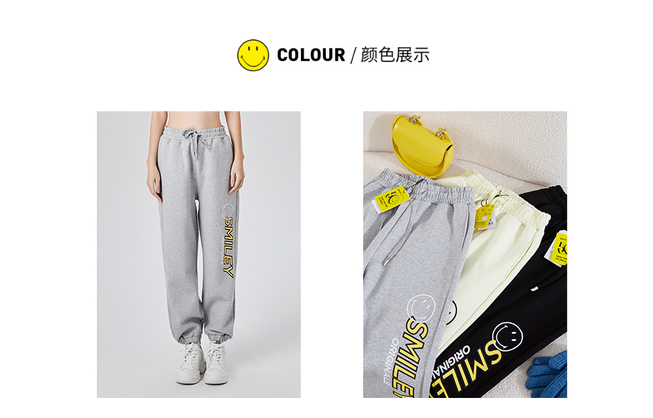 【品名】:经典笑脸印花字母刺绣束脚卫衣长裤
