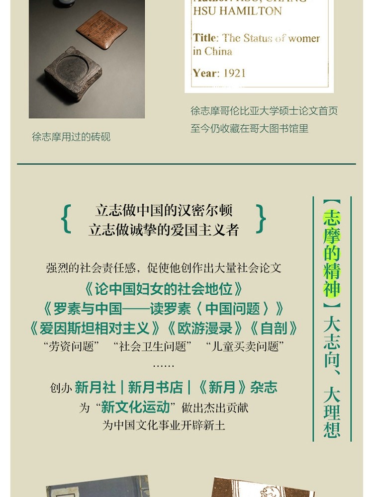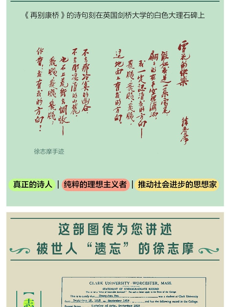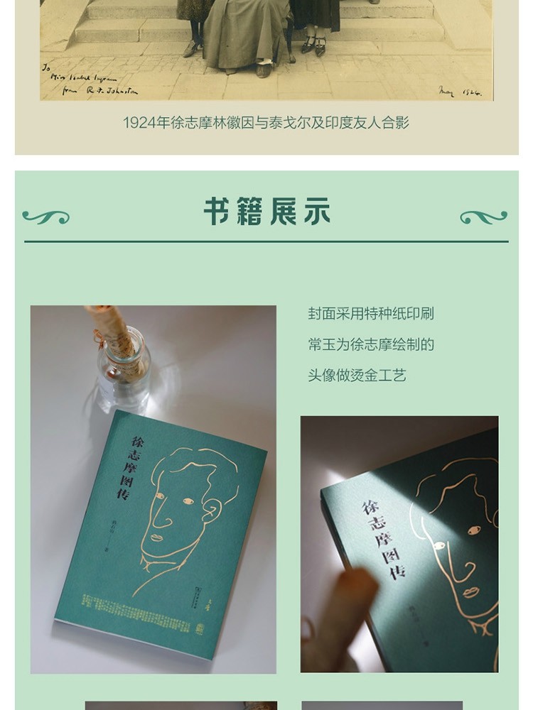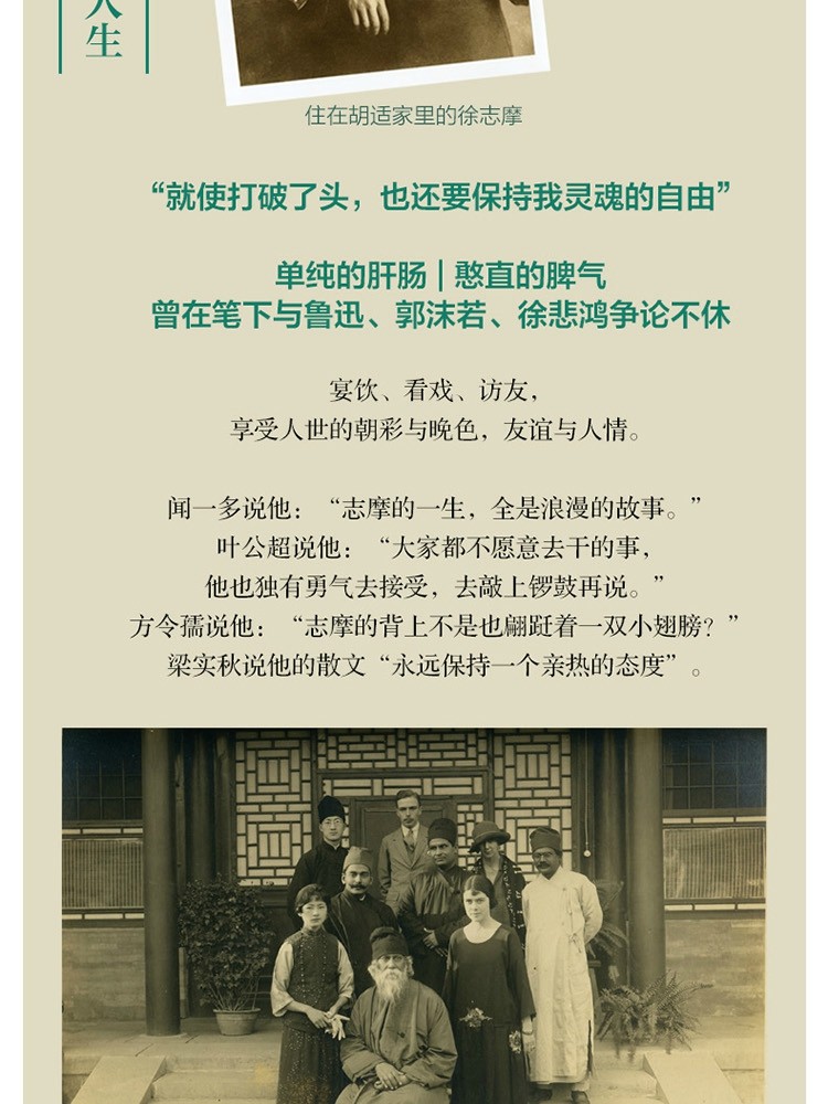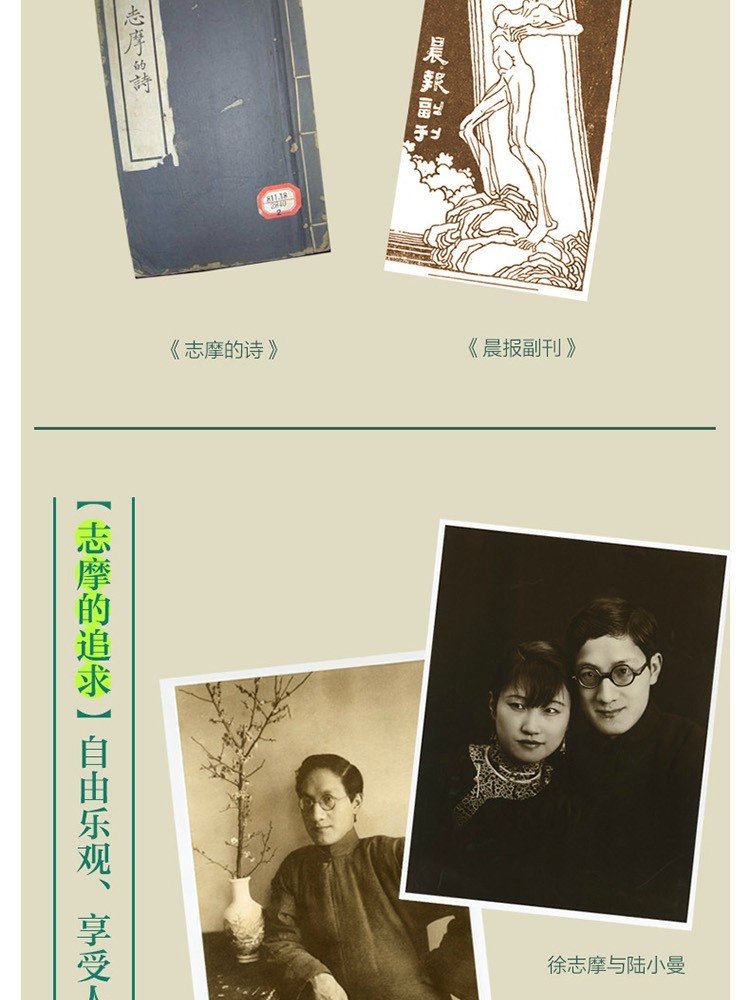 本书内含百余幅关于志摩的珍贵影像图片资料,从徐氏族谱到徐志摩幼年时期的照片,再到徐志摩海外求学时期成绩单的照片还有徐志摩与他的友人和爱人的照片。在阅读文字的同时,也带给读者同样的视觉享受,令读者印象深刻。这些珍贵的照片资料汇集本就不是一件易事,对于喜欢文学、历史和徐志摩的读者来说也非常有收藏价值。