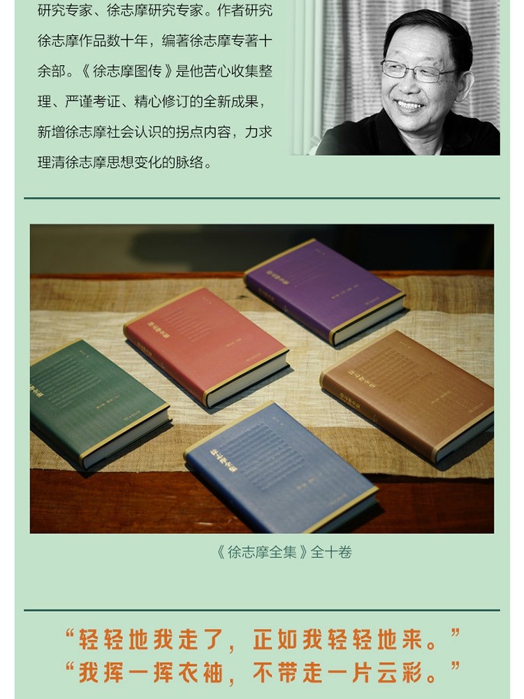 商务印书馆《徐志摩全集》(全十卷)是他苦心收集整理、严谨考证、精心编订的高水平成果。新版《徐志摩图传》,是他研究徐志摩的新成果,有助于读者全面认识徐志摩的品质和他完成的事业。