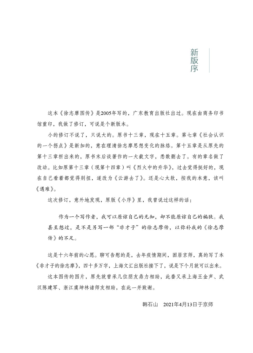 在新版《徐志摩图传》中,韩石山老师除了做出无数小的修订之外,对于老版《徐志摩图传》的脉络也进行了改动还有诸多章节名称的变更,可以说是一个全新版本。例如第七章《社会认识的一个拐点》是新加的,意在理清徐志摩思想变化的脉络。第十五章是作者从原先的第十三章析出来的,原书末后谈著作的一大截文字,悉数删去了。有的章名做了改动。比如原第十三章(现第十四章)叫《烈火中的升华》,改为《云游去了》。韩石山老师把自己对于徐志摩的全新感悟和研究成果投入这本书的内容之中,与读者分享。