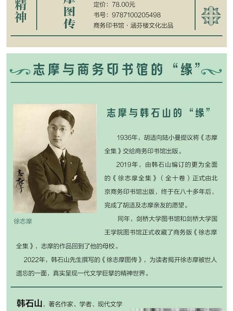 胡适说过,志摩的全集应该由商务来出版,终于在八十多年后达成。由韩先生编订的这部更全的《徐志摩全集》终于正式由北京商务印书馆出版,也可以说是完成了胡适早年的这一愿望。商务版《徐志摩全集》是目前收录徐志摩作品zui多的一部文集,作者韩石山老师通过首创的分类编年法,更加便于读者对徐志摩作品的阅读和研究。本书也出自韩石山老师之手,搭配《徐志摩全集》,从作品和人物生平的角度全面解读徐志摩,是喜爱徐志摩的读者的不二之选。