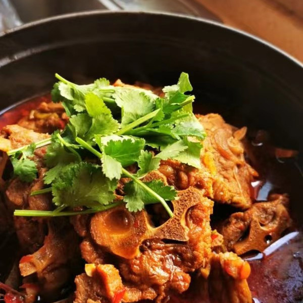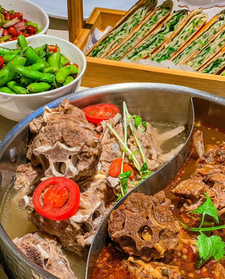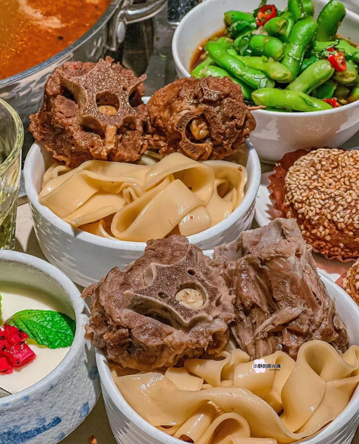 炖好的羊蝎子先啃肉吸髓,吃完肉的原汤别浪费,涮上青菜、冻豆腐、宽粉,秒变羊蝎子火锅;最后用浓汤煮一碗手工面,酱香裹着面香,连汤带面吃光光才过瘾,暖胃又暖心。