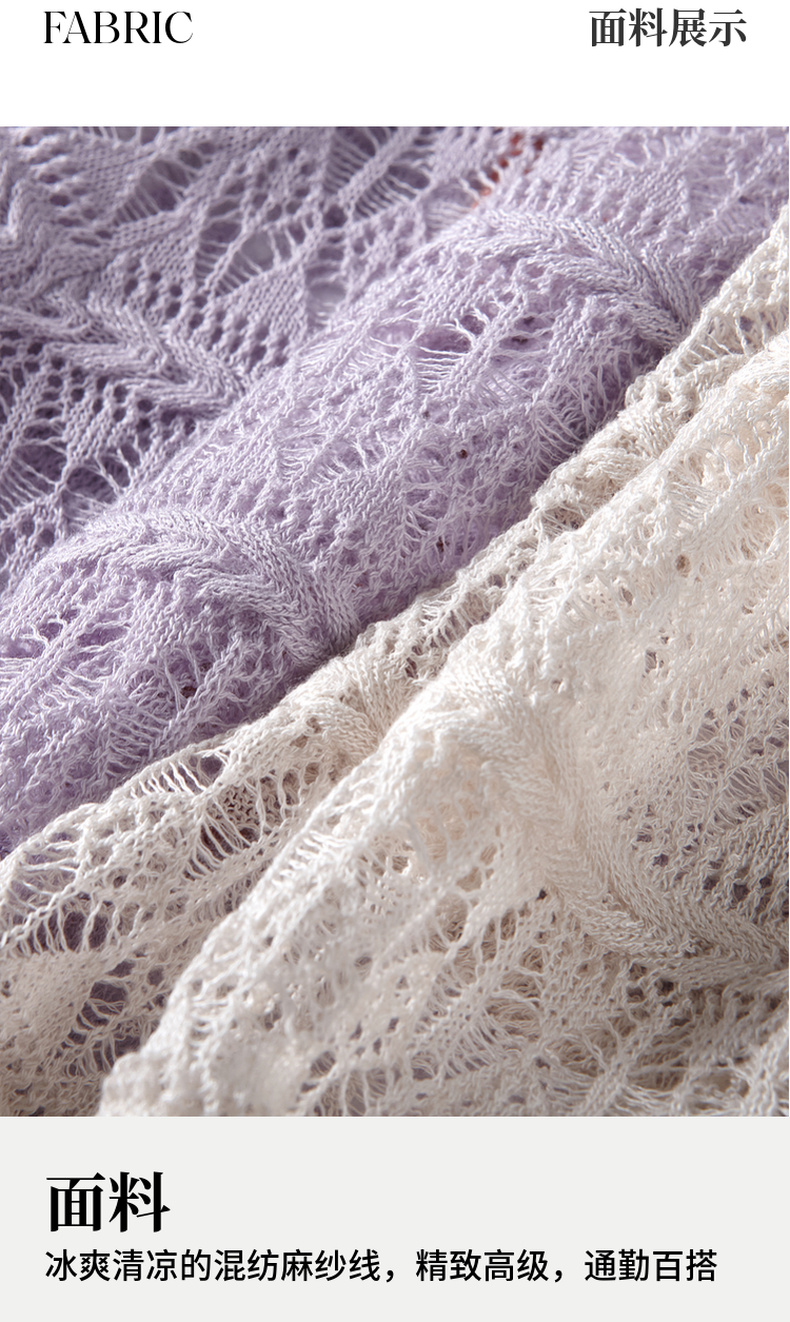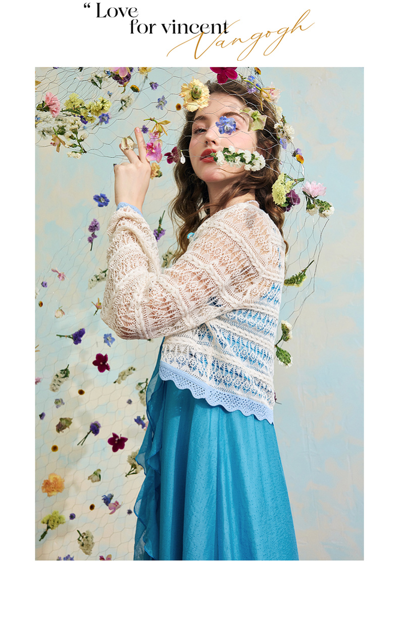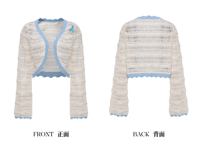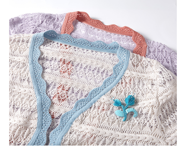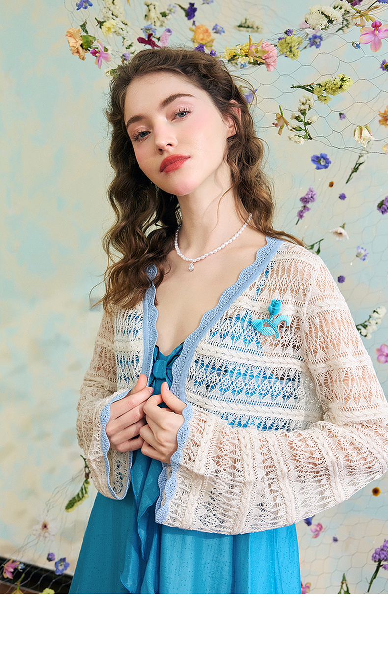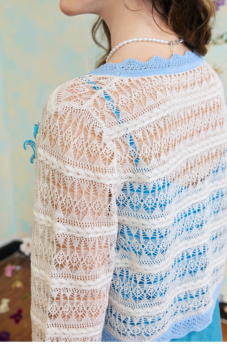 两三事梵高文艺 夏沫可可 2024夏季新款拼色边镂空针织衫女配胸针