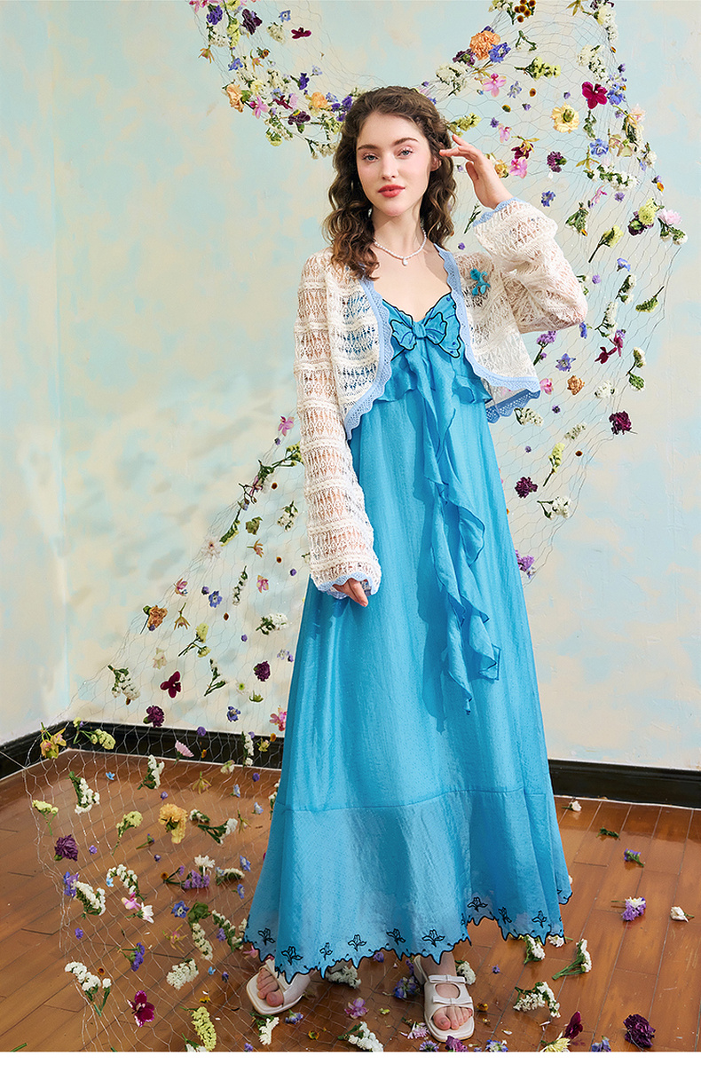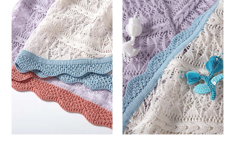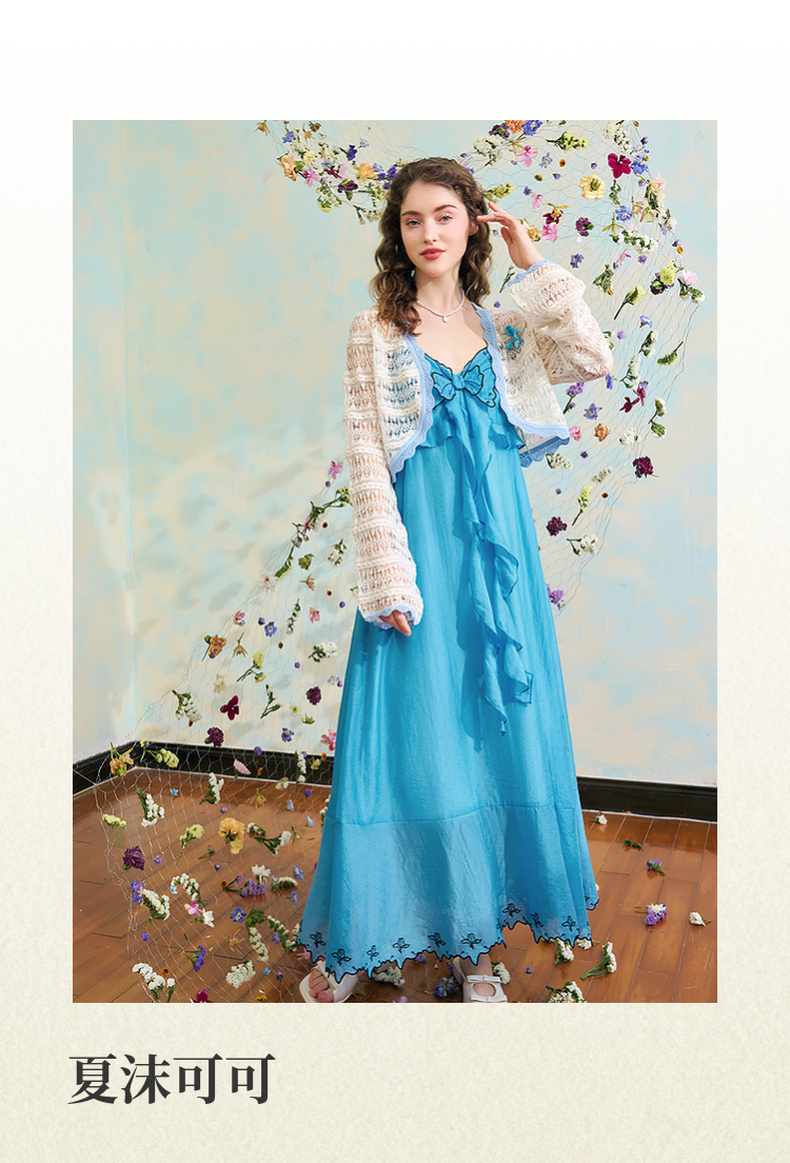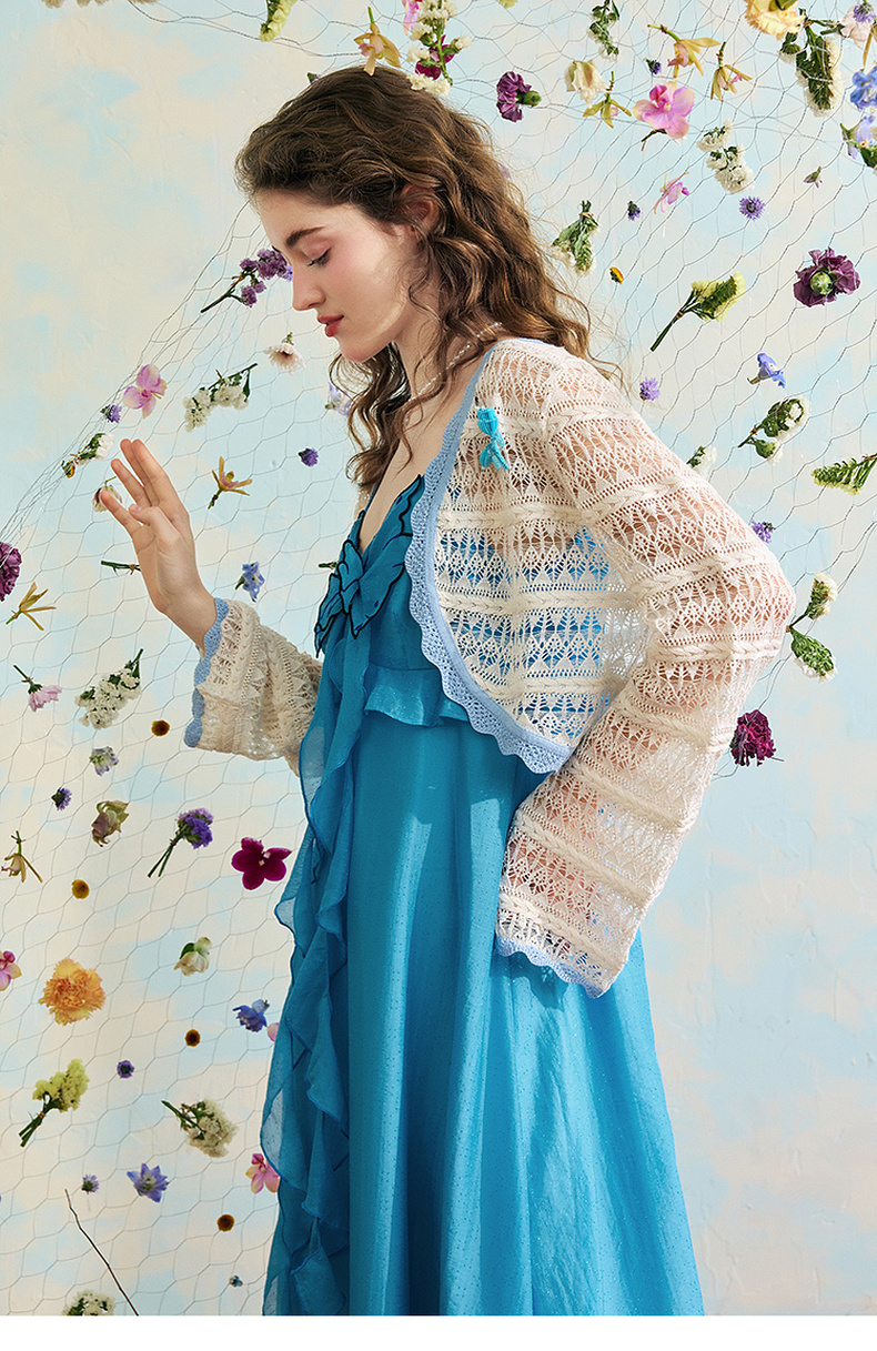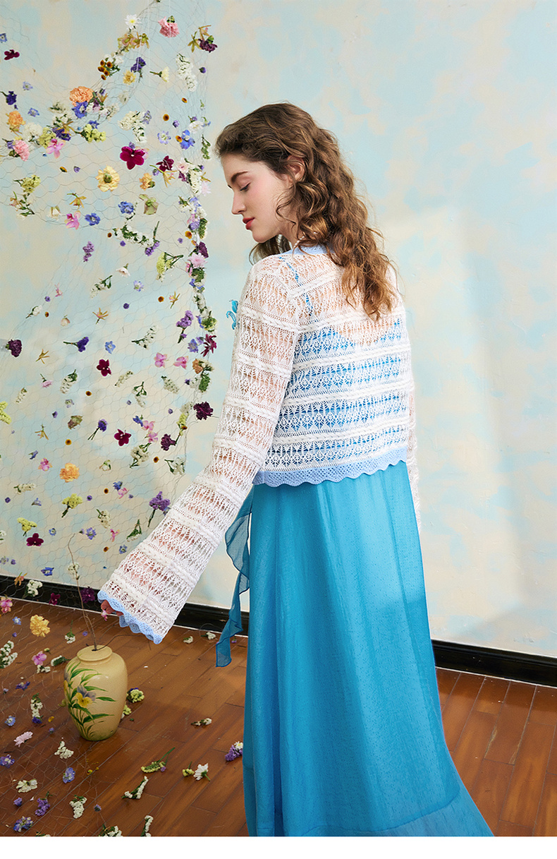 两三事梵高文艺 夏沫可可 2024夏季新款拼色边镂空针织衫女配胸针