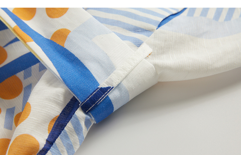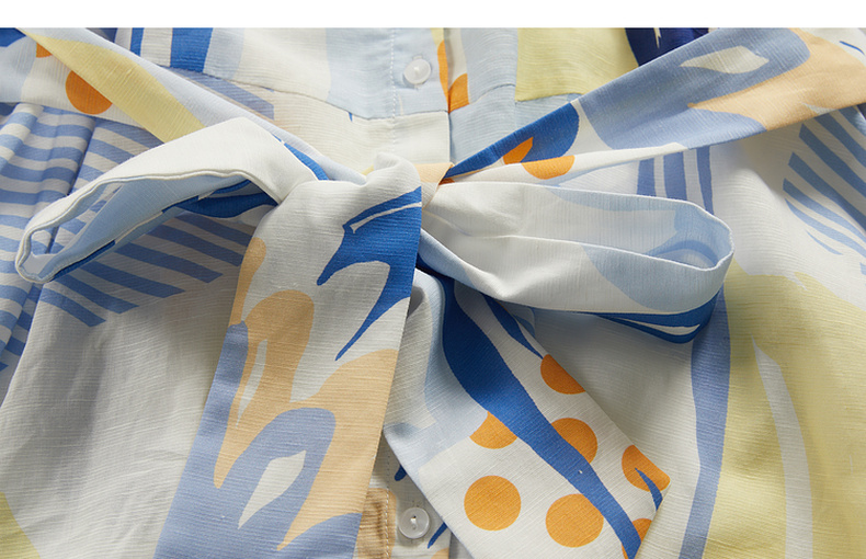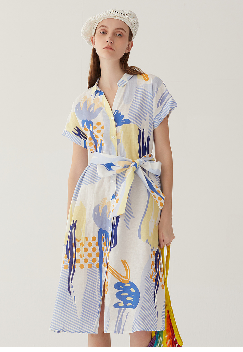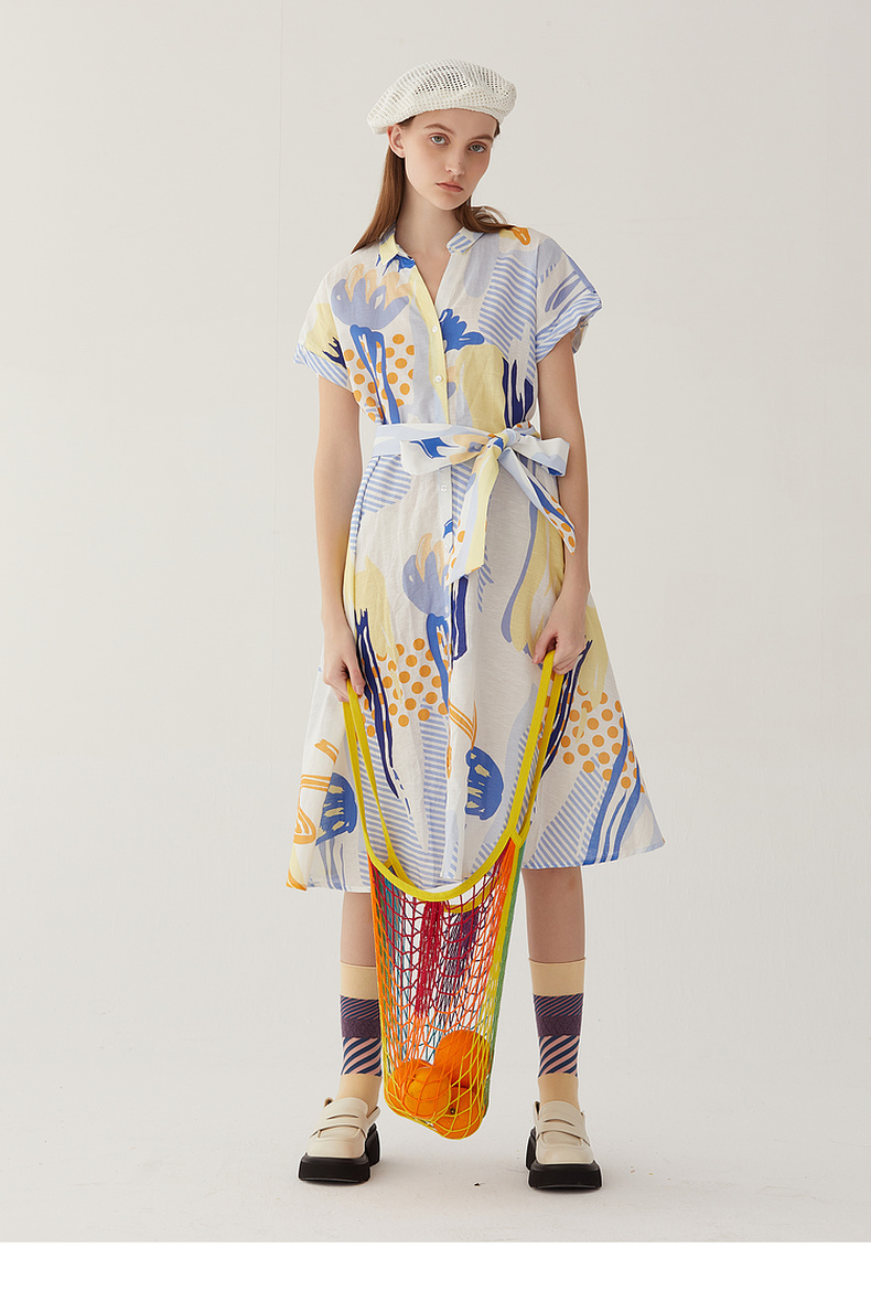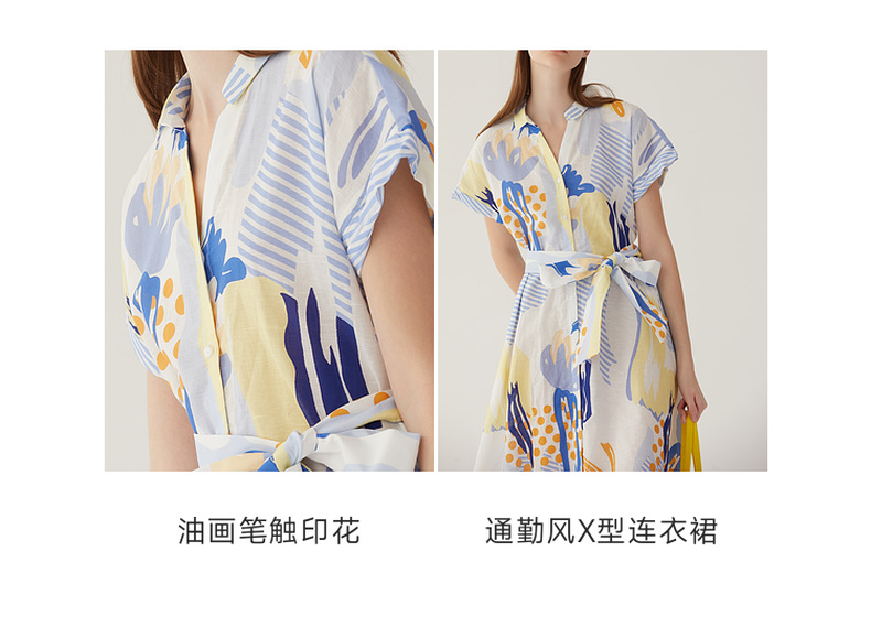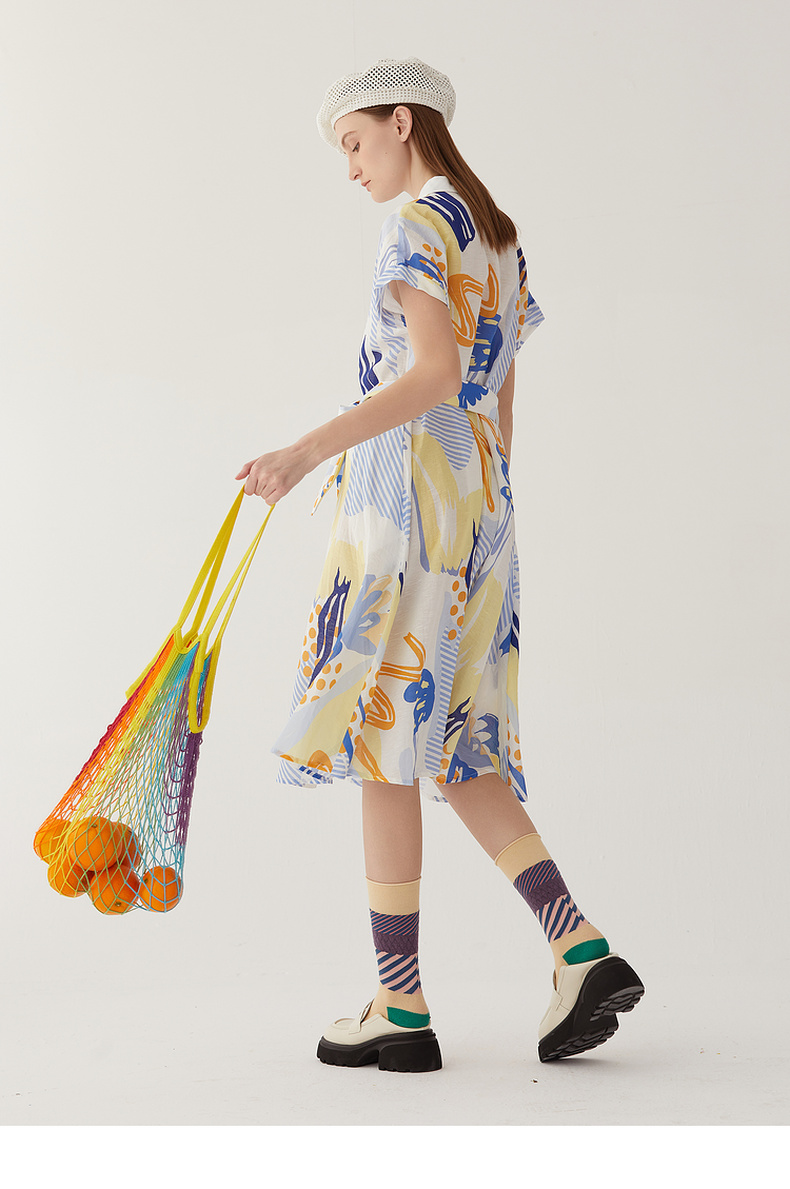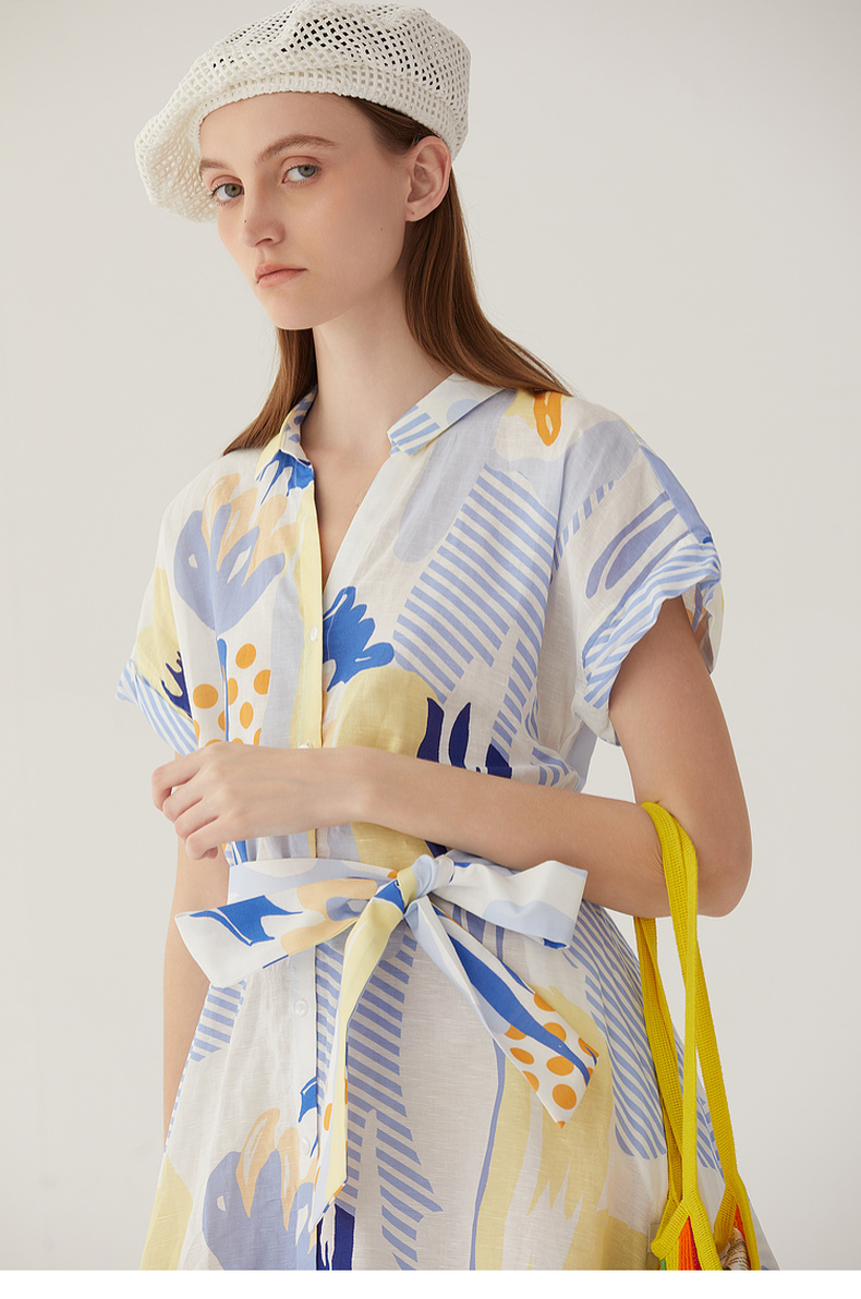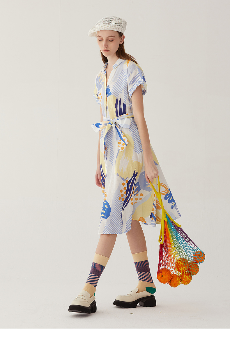 谜底复古花色V领连衣裙短袖2024夏季新款收腰长裙配腰带246ML7033