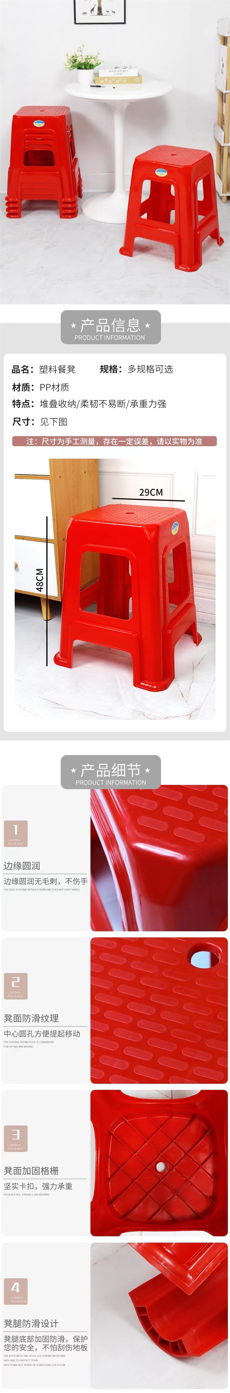 优选塑料凳子红色加厚 1张 胶凳48cm高家用简约餐桌椅子结实商用胶凳大人红色高凳