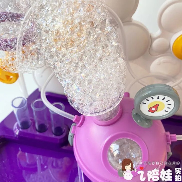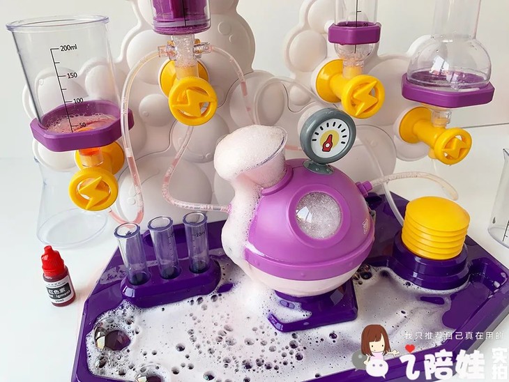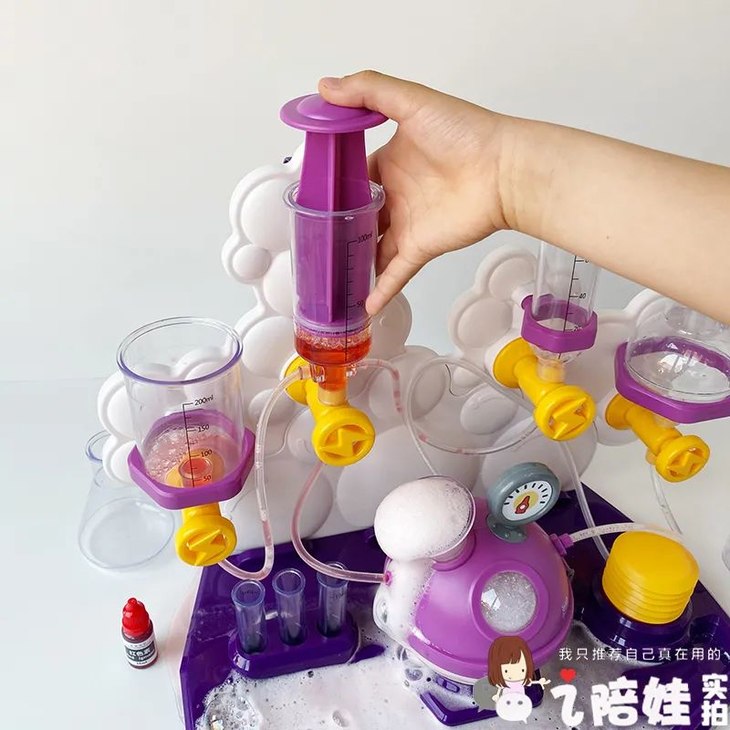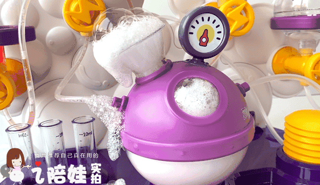 芊芊独爱另一个泡泡实验,因为它有个加压气泵。越按泡沫越多,她是乐此不疲。自己还调整配方比例,说要试试它的反应极限