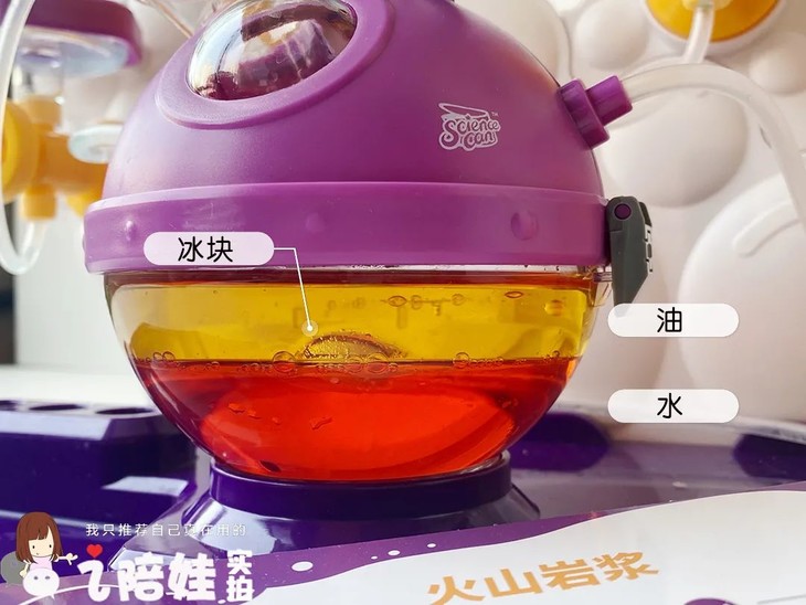 而我给芊芊新入这套引导孩子观察的是:为什么水、油、冰块混合,冰是悬浮在中间的。尽管孩子未必理解是冰块密度介于油和水之间使然,但对初中学浮力和密度的关系还是有帮助的。