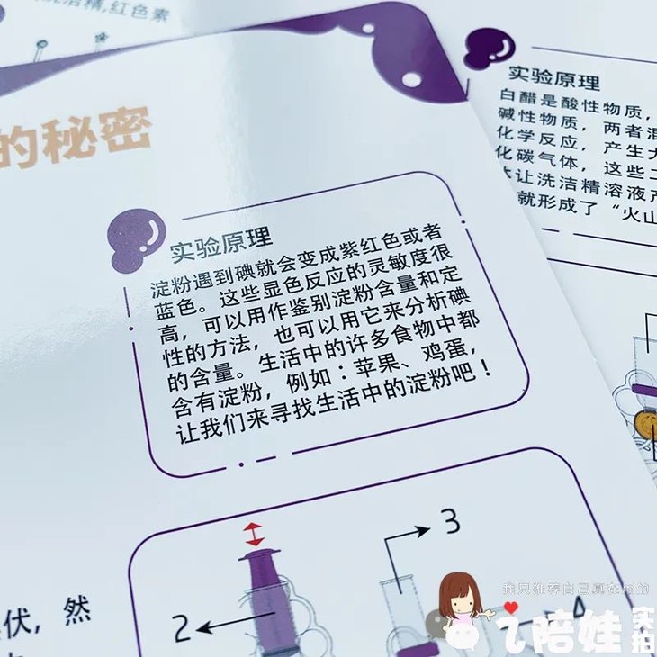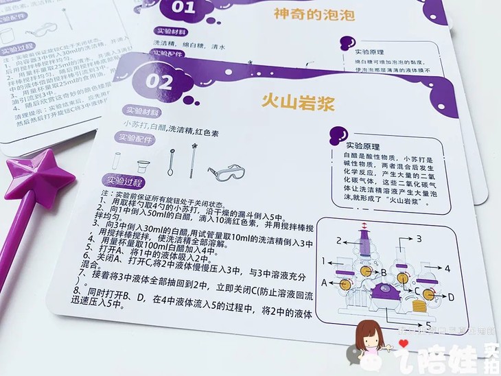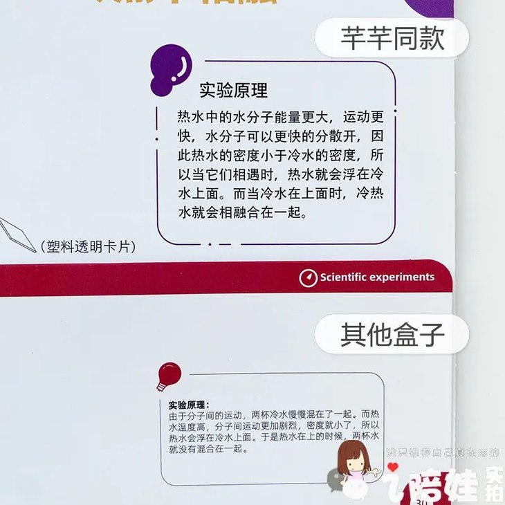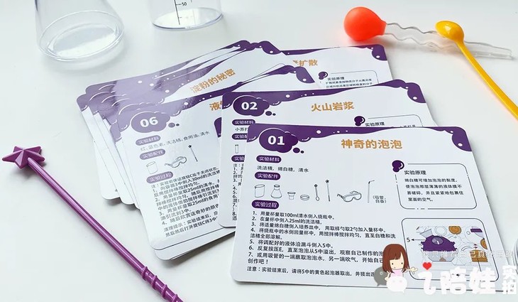 虽然带指导卡片的基础实验只有20个,里面也不乏常见的经典实验,但是它涵盖分子运动、密度、浮力、氧化反应等STEAM多领域的知识范畴,原理说明也不流于皮毛,还是能帮孩子在实验中有不少新收获的。