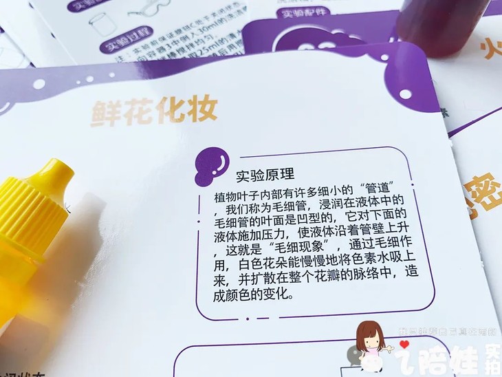 有些实验我开始觉得有点过气了。比如鲜花变色实验。大部分科学盒子会往茎的吸水性引导。很少有能提到是因为叶子的毛细管对液体施加压力上升,产生了“毛细现象”导致。