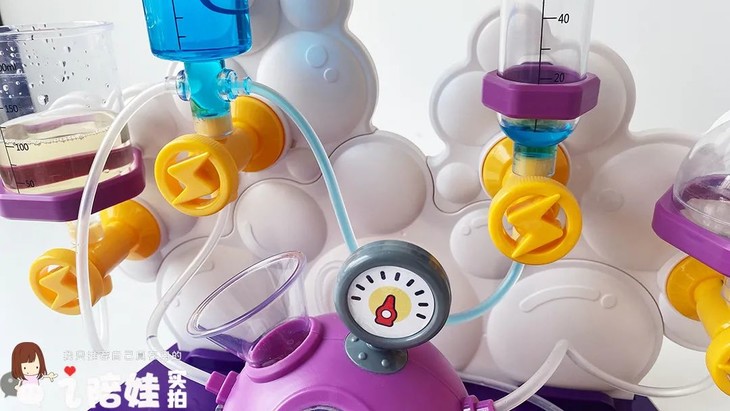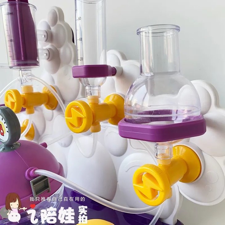 而更增加它仪式感的,是它各种仿真度很高的小细节。你看连接部位都是这种三通转接头,跟真的实验支架的感觉很接近(应该是照顾孩子操作性,所有部件都放大了尺寸,孩子小手也好操作)