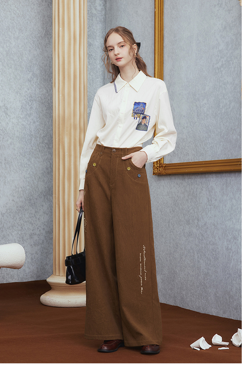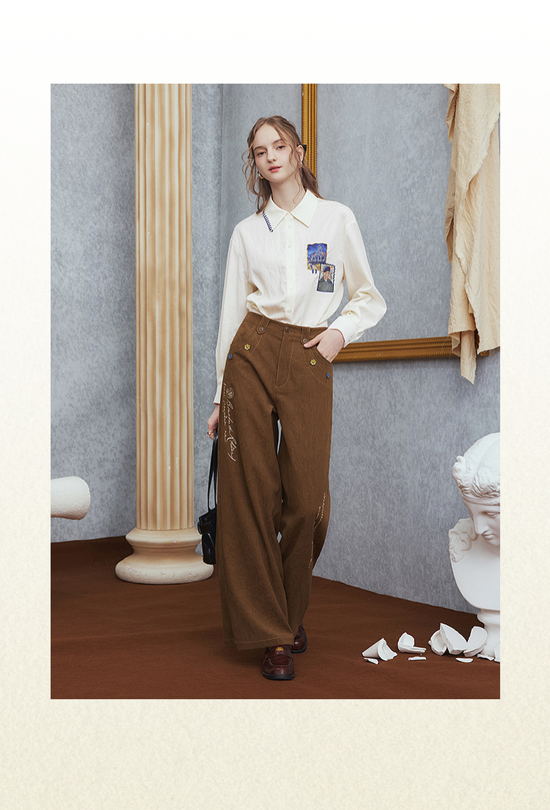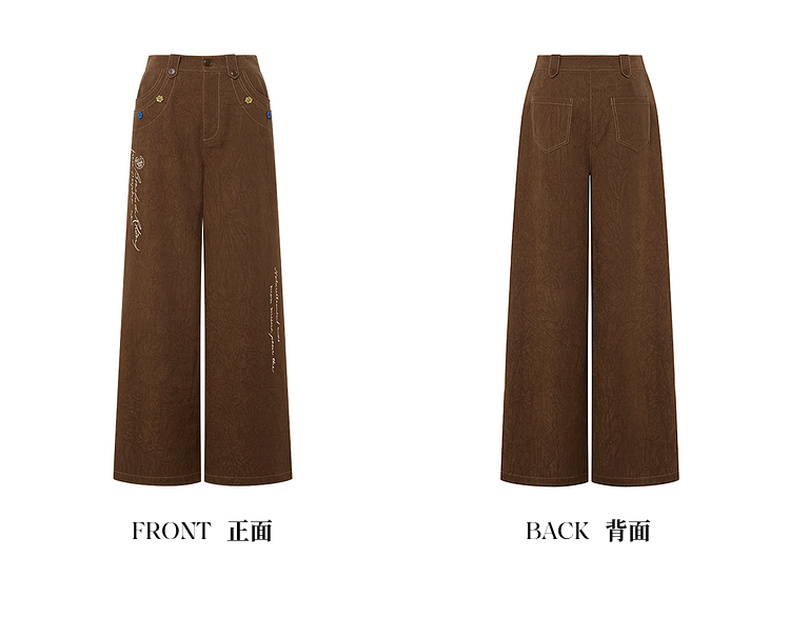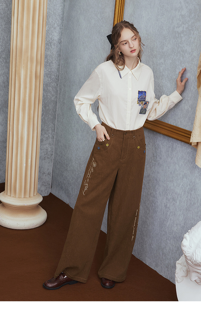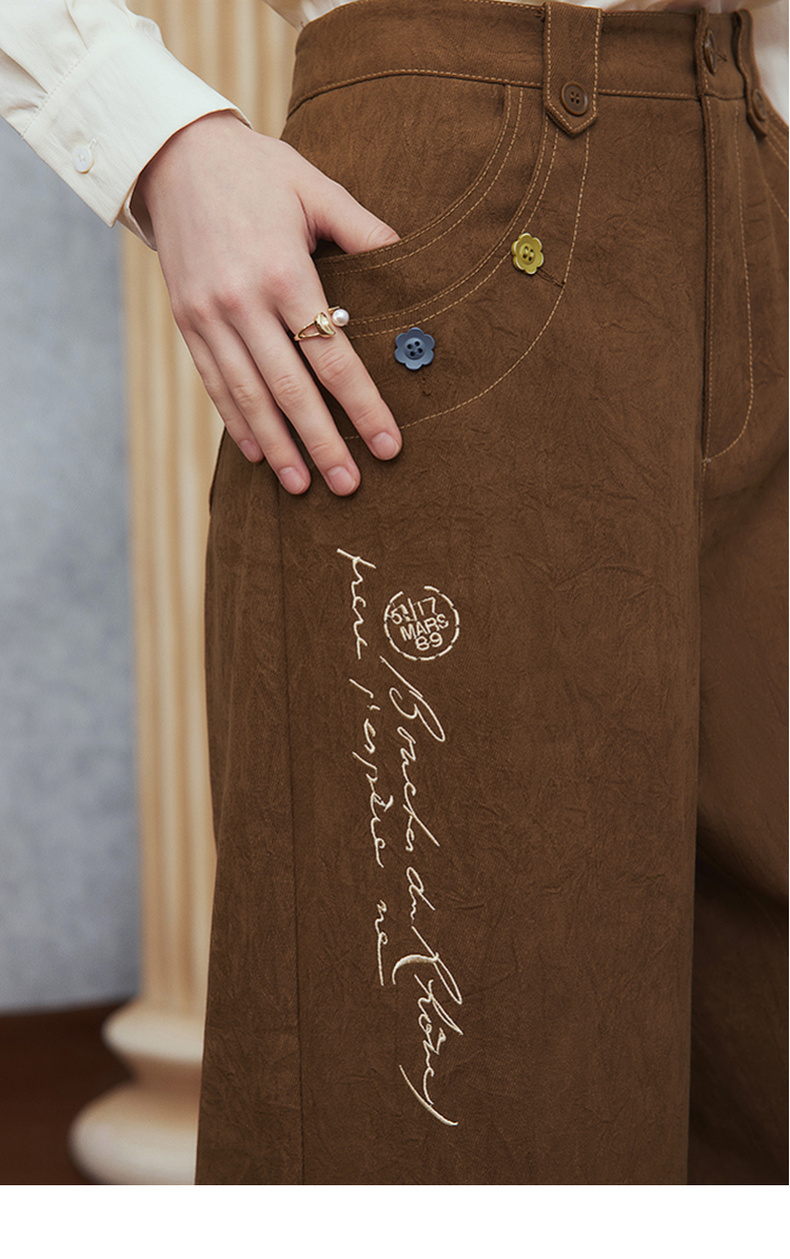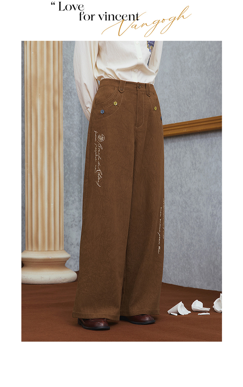 两三事梵高文艺 赭谣漫信 2025秋季新款刺绣纽扣装饰阔腿休闲裤女
