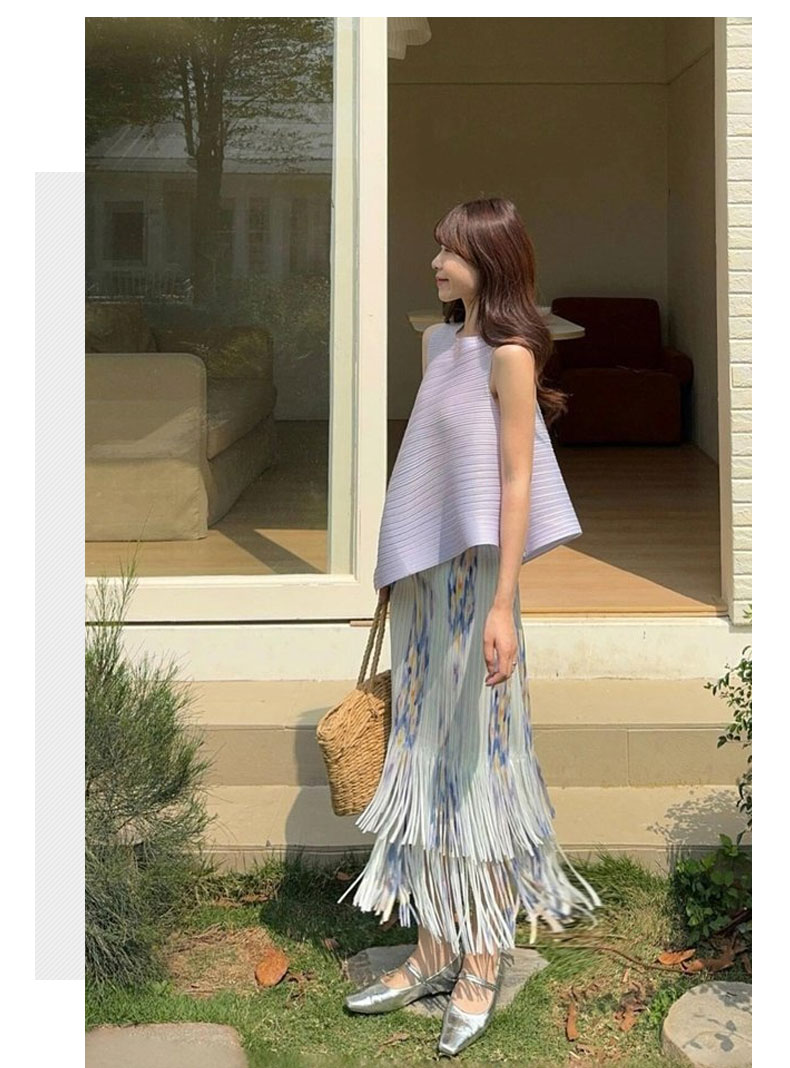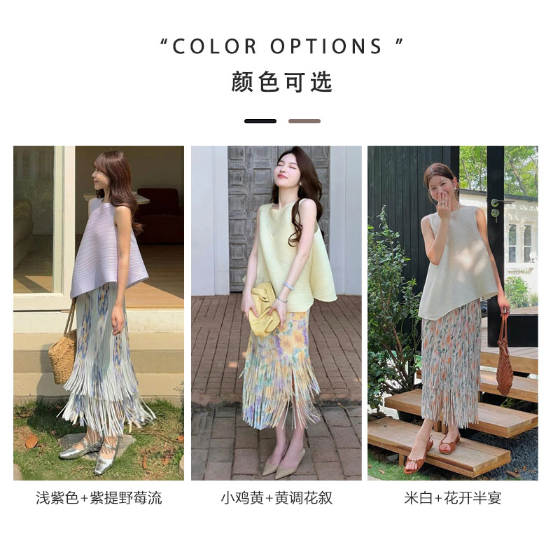 颜色:褶皱背心(浅黄/浅紫/米白),印花流苏半裙(紫提野莓流苏半裙/黄调花叙流苏半裙 /花开半夏流苏半裙/)