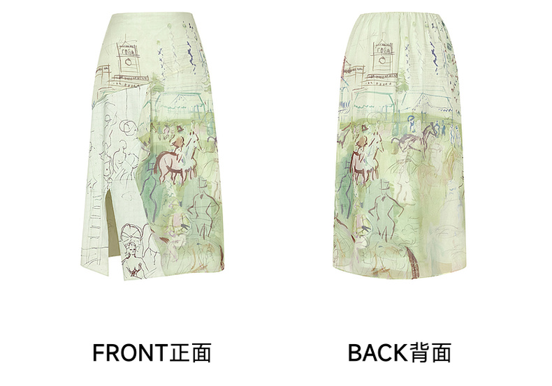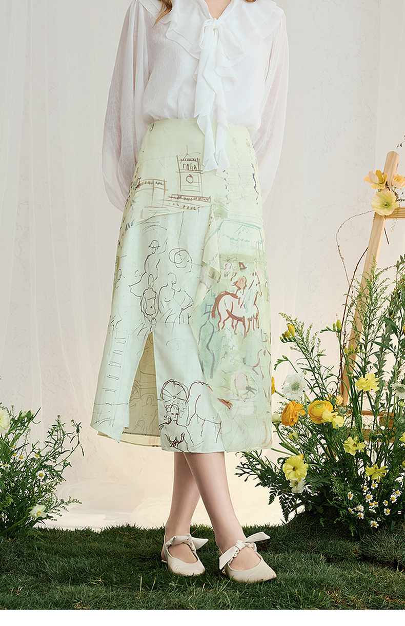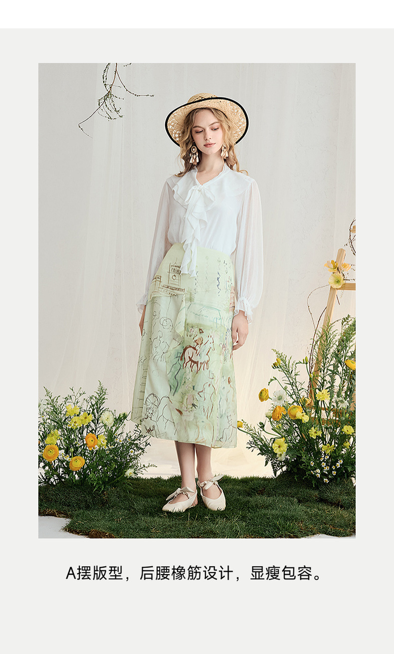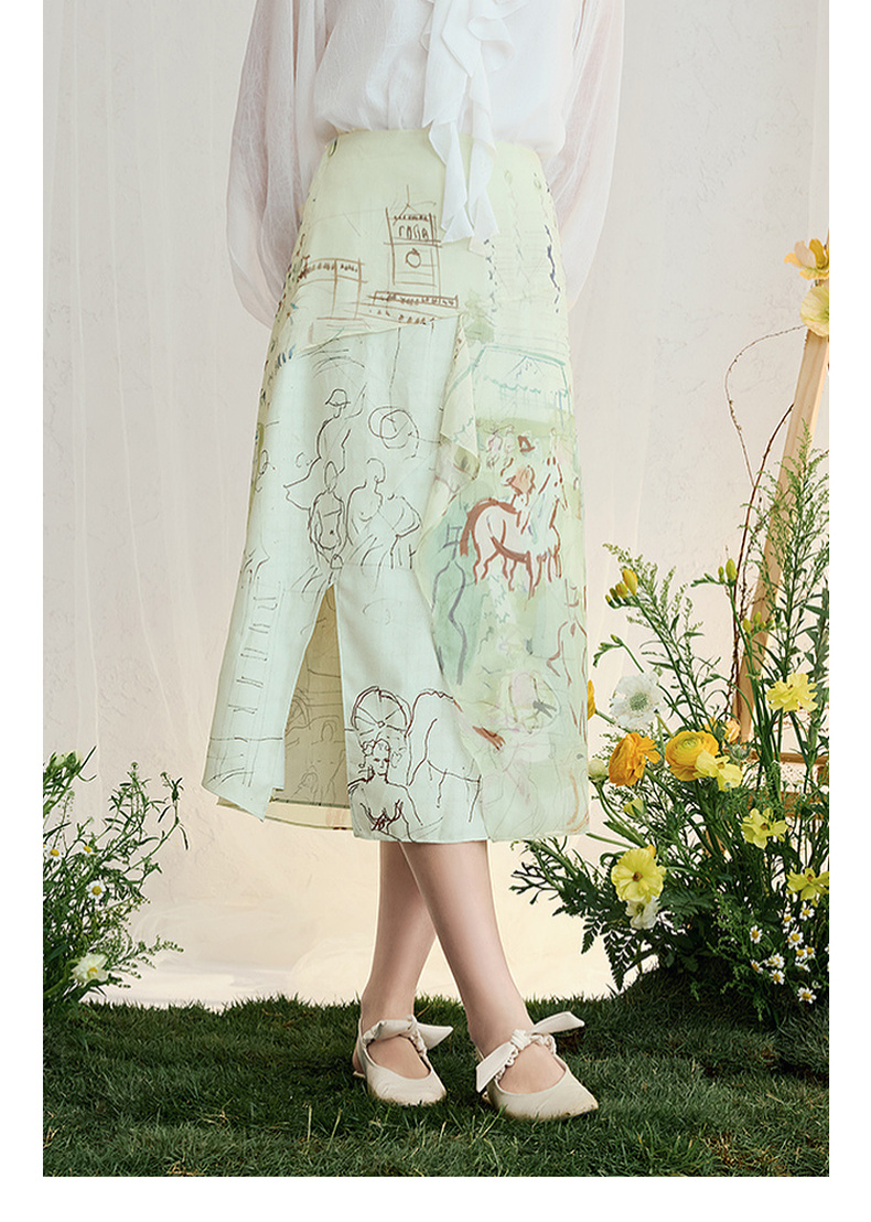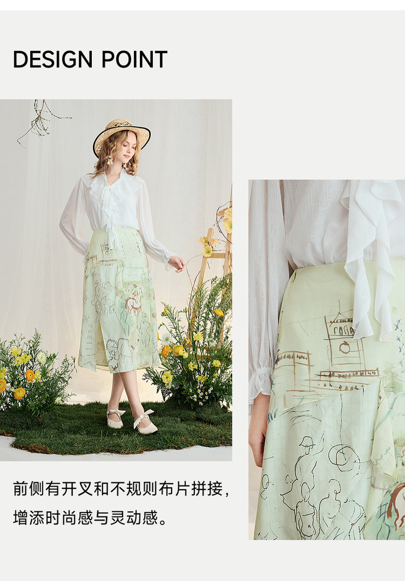 两三事 青蔓游绘 2025夏季新款复古印花开叉裙摆高腰半身裙长裙