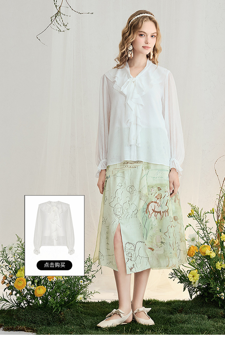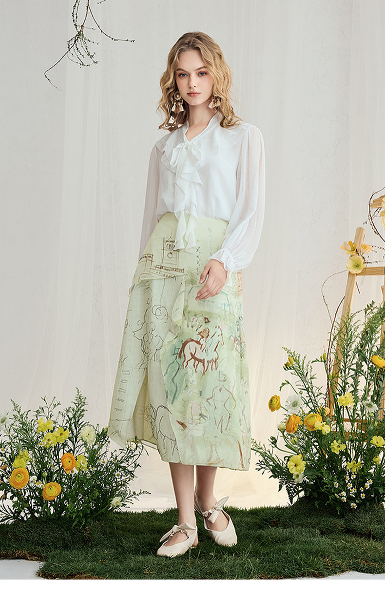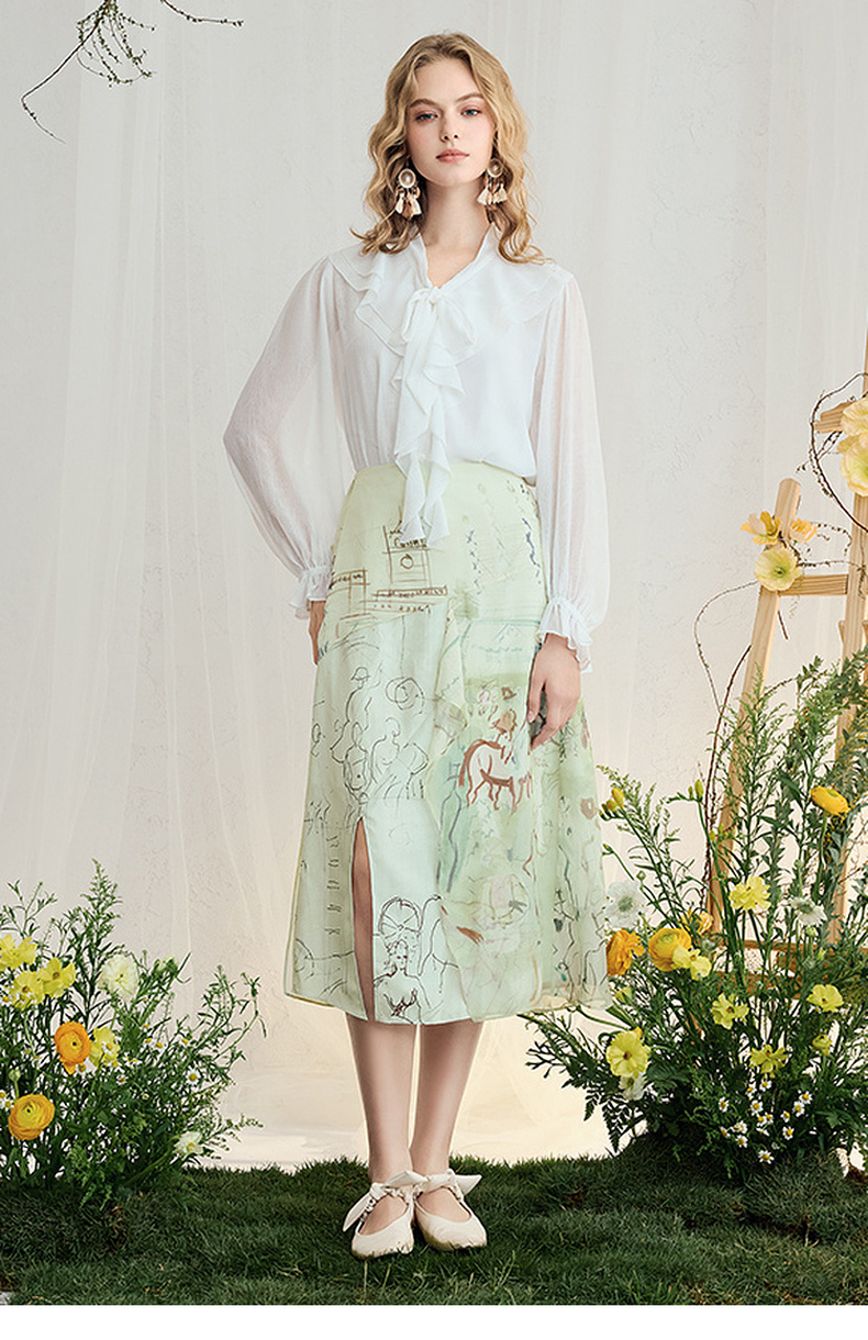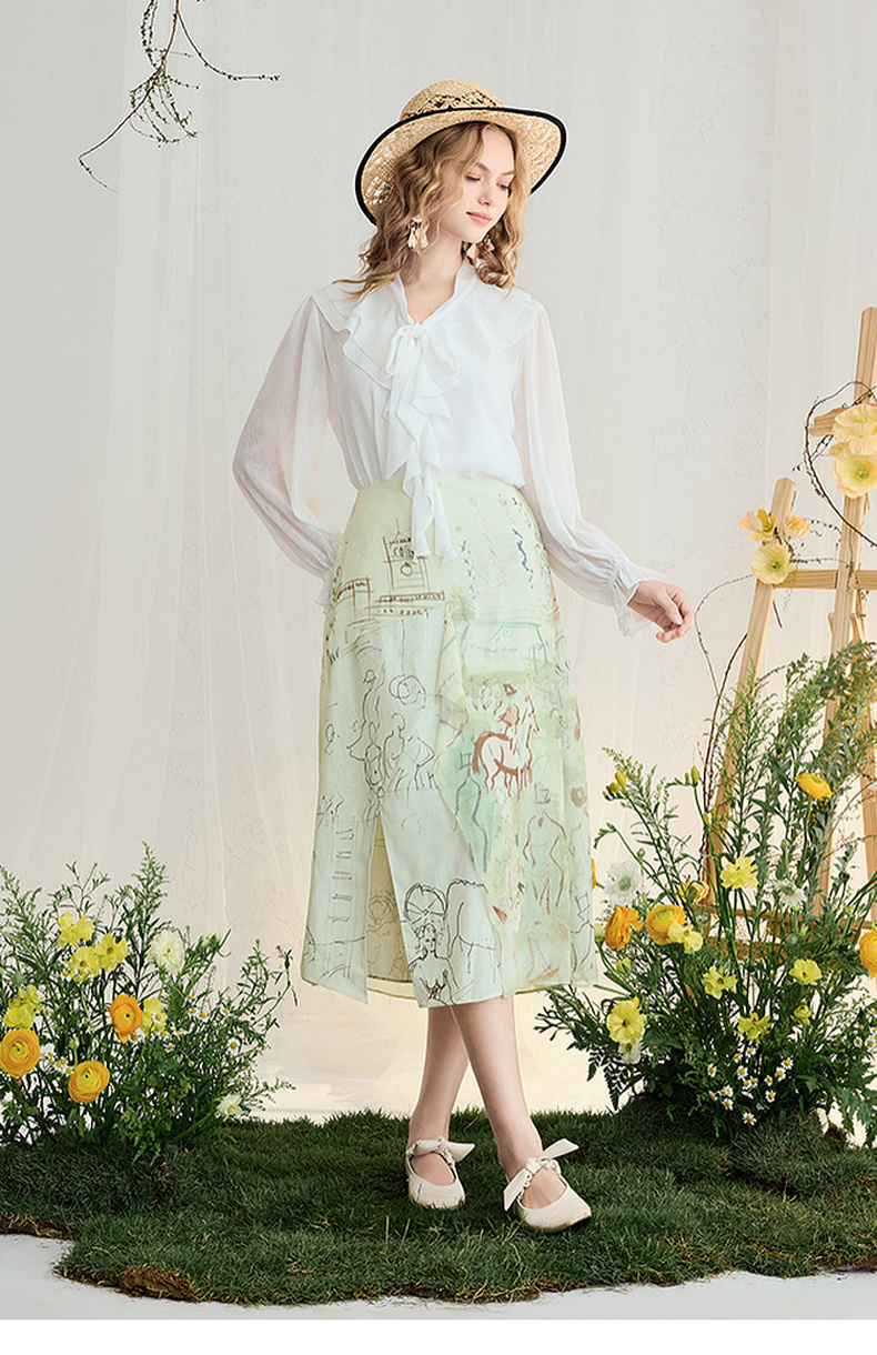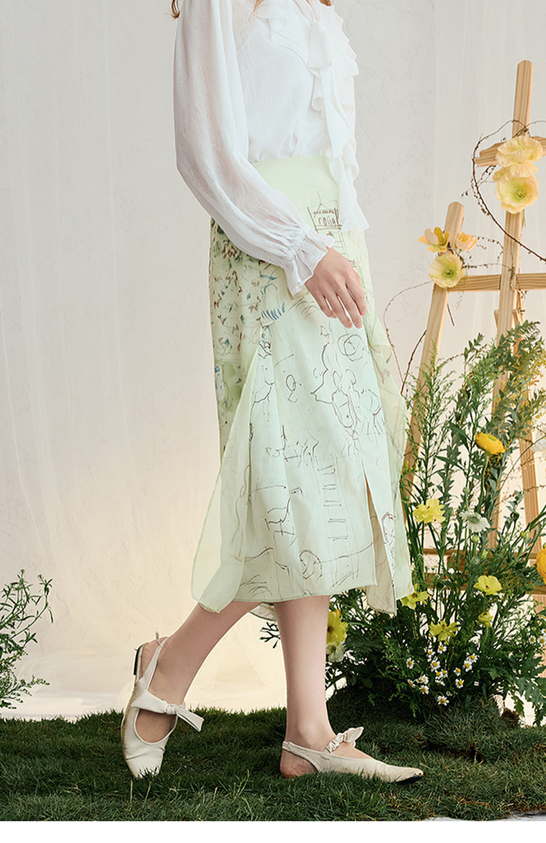 两三事 青蔓游绘 2025夏季新款复古印花开叉裙摆高腰半身裙长裙