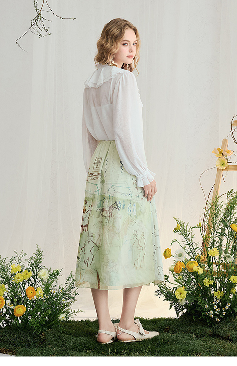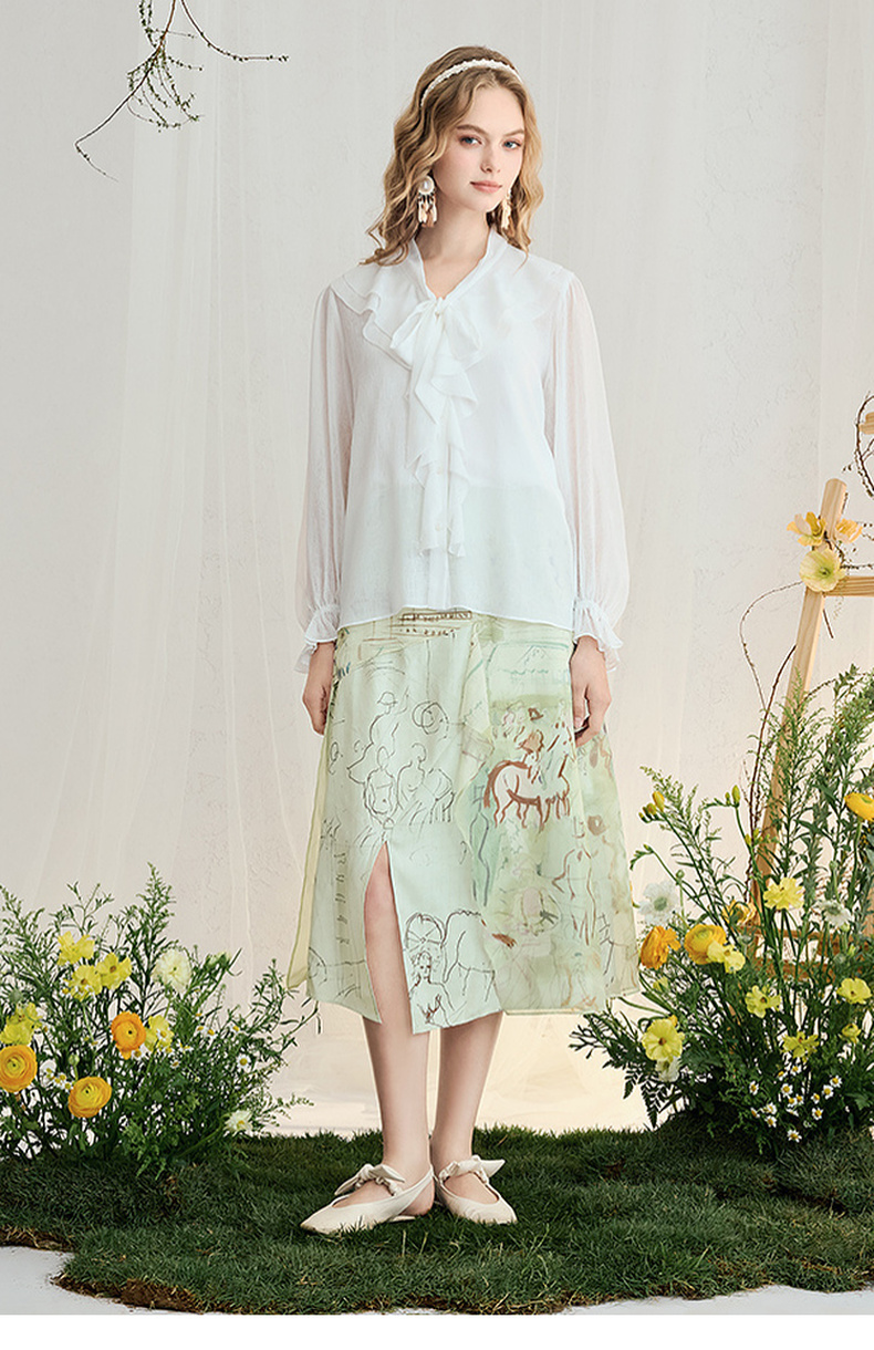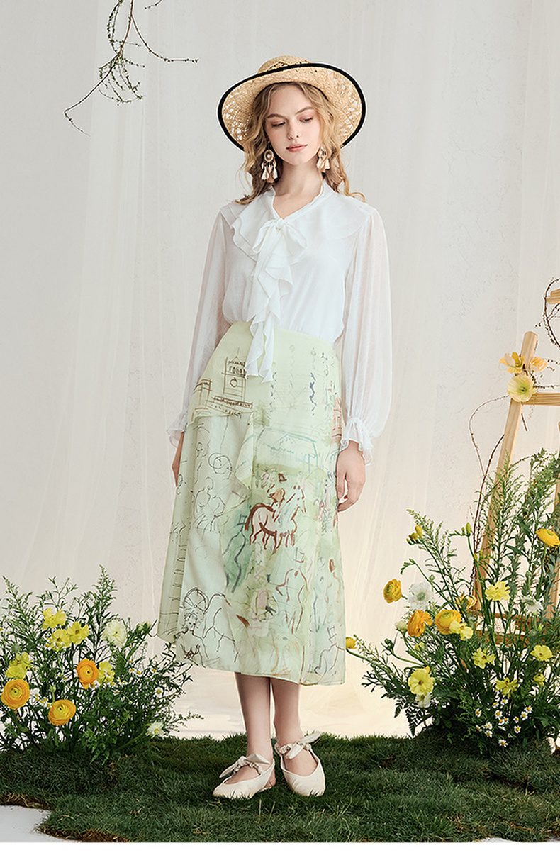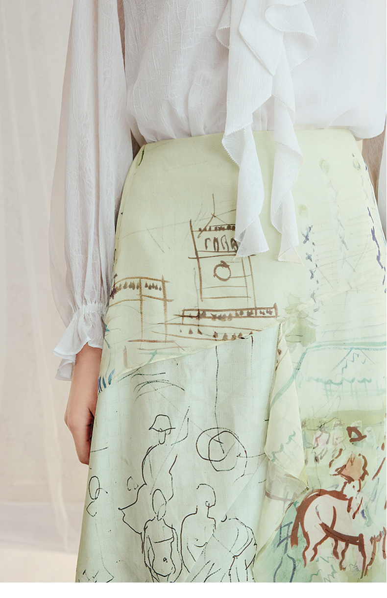 两三事 青蔓游绘 2025夏季新款复古印花开叉裙摆高腰半身裙长裙