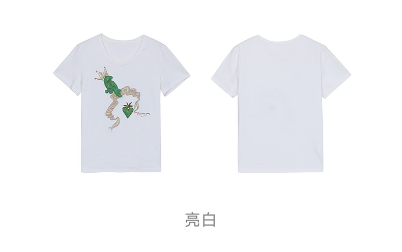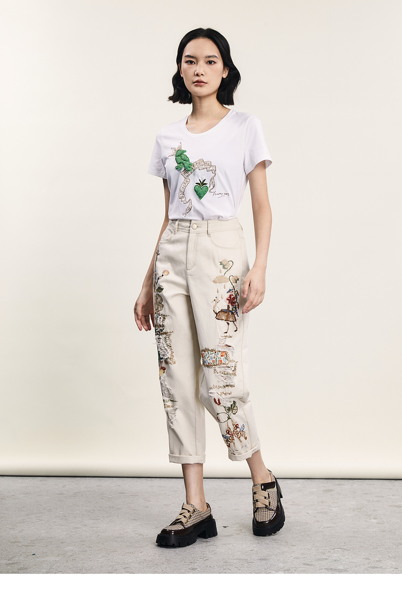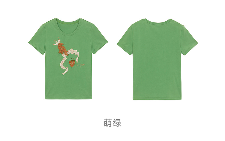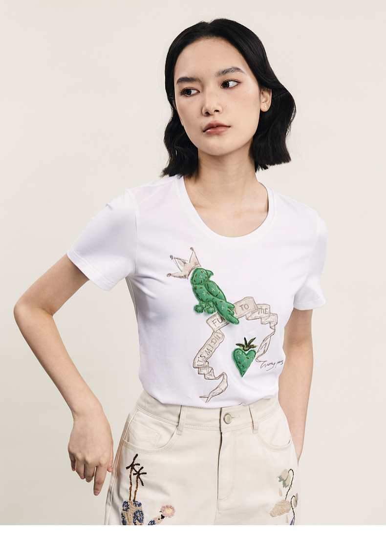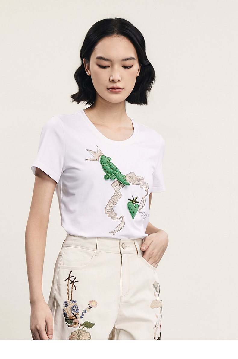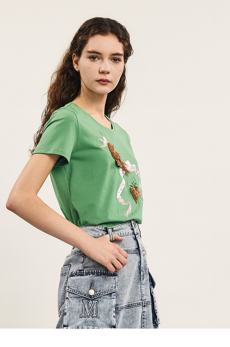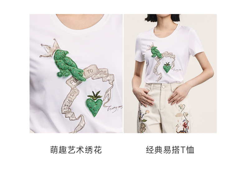 谜底圆领印花T恤女2024年夏季新品时尚绣花修身百搭上衣242MT0527