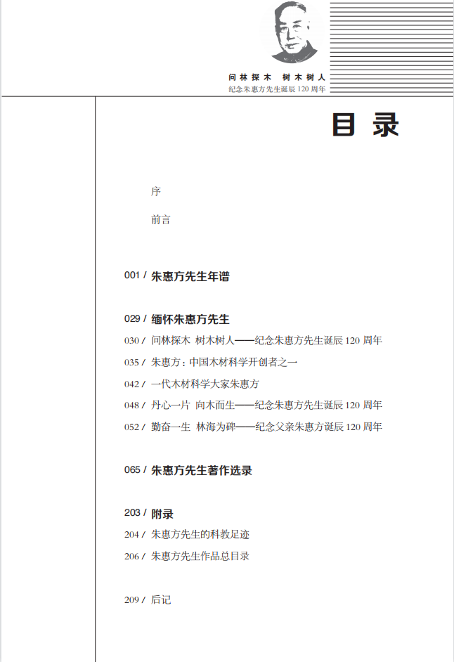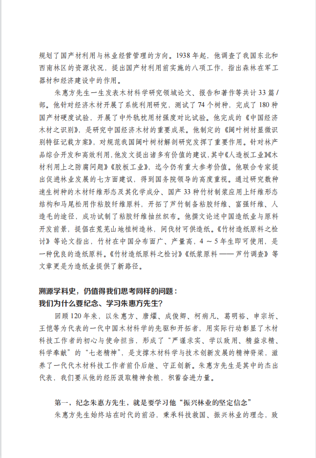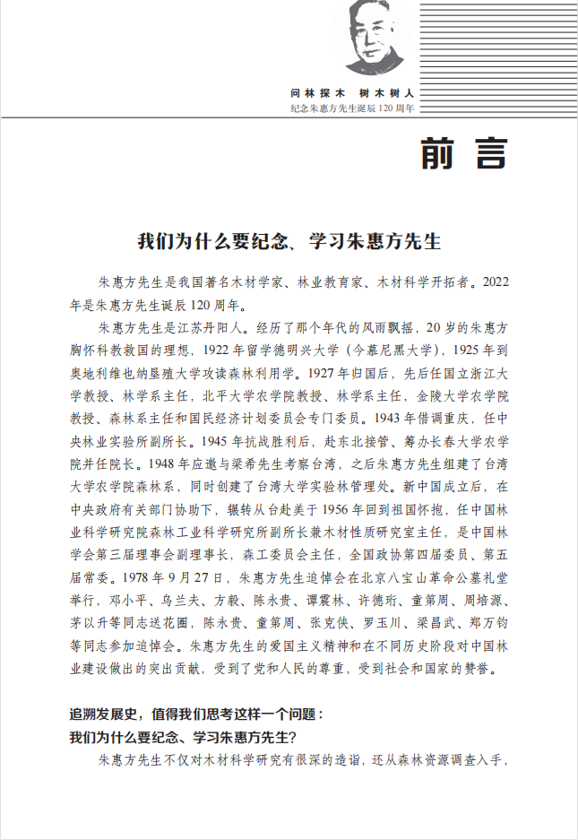 《问林探木 树木树人》是中国林业科学研究院木材工业研究所为纪念朱惠方先生诞辰120周年而编撰的纪念文集。本书以《中国林业事业的先驱和开拓者(朱惠方年谱)》为线索,通过史料查阅、发掘、系列研讨等工作,系统梳理了朱惠方先生的生平事迹、学术思想、重要论著、媒体报道、人物照片等,收录10万字、照片30余张、论著17篇(部),深入发掘了朱惠方先生教做合一、严谨求实、科学奉献的理念和精神,全景重现了朱惠方先生伟大光辉的奋斗足迹。中国林业科学研究院第三任院长、林学家黄枢先生为此书作序。黄枢先生与朱惠方先生相识于读书时期,结缘于梁希教授,共事于中国林学会。他对朱惠方先生的学术成就、爱国情怀,以及科学家精神给予高度赞扬。该书的出版是弘扬科学家精神、讲好中国木材故事的重要实践。