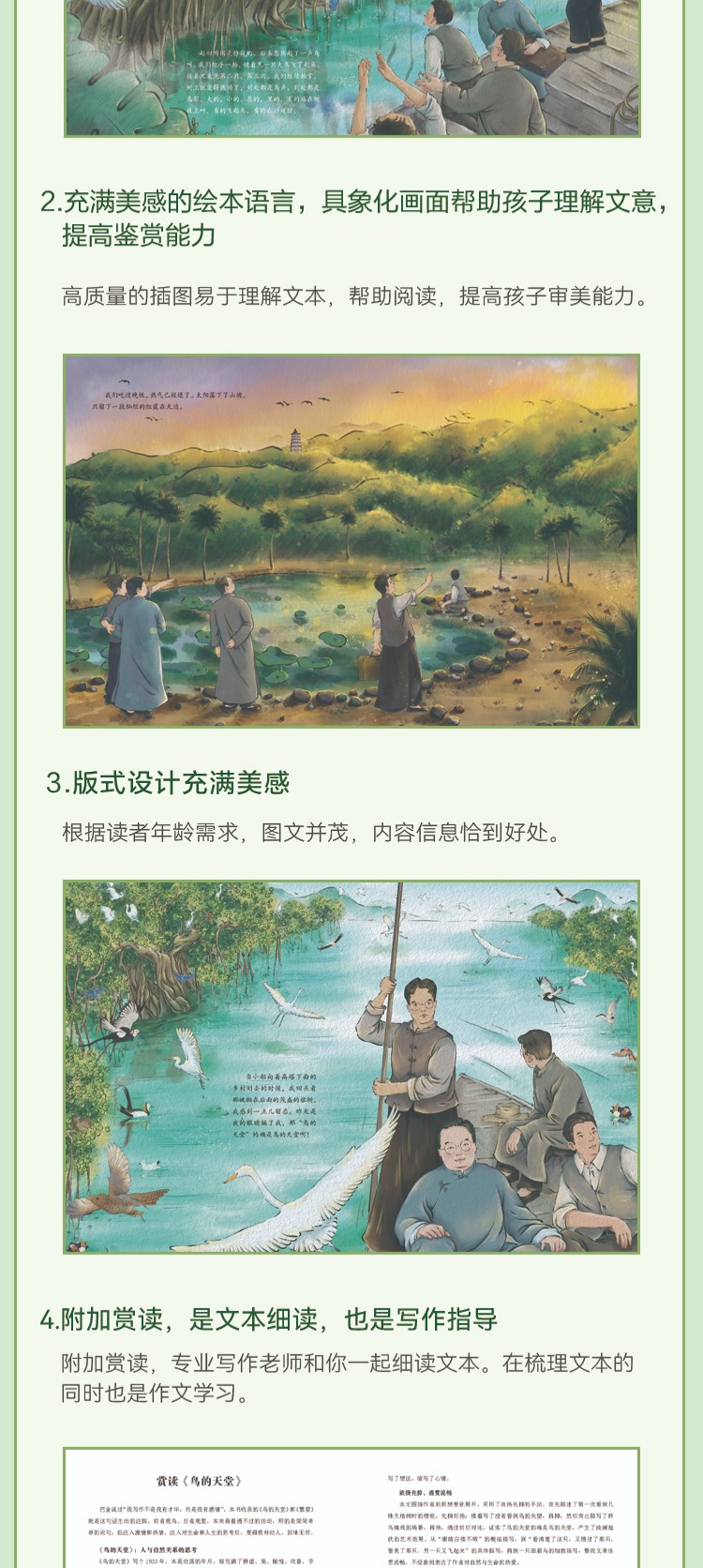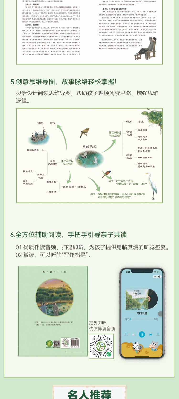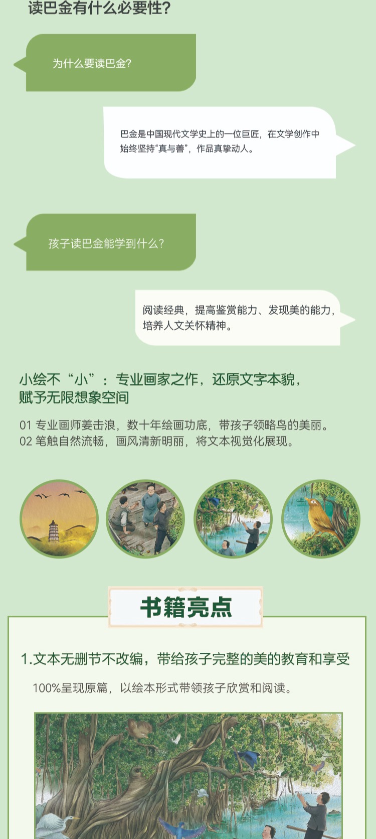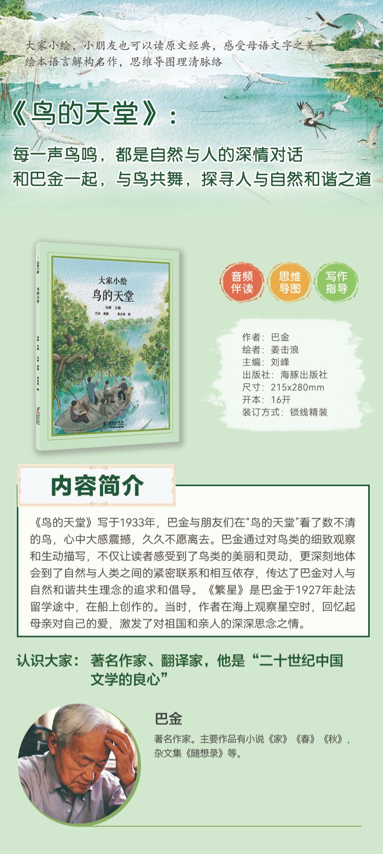 《鸟的天堂》写于1933年,巴金与朋友们在“鸟的天堂”看了数不清的鸟,心中大感震撼,久久不愿离去。巴金通过对鸟类的细致观察和生动描写,不仅让读者感受到了鸟类的美丽和灵动,更深刻地体会到了自然与人类之间的紧密联系和相互依存,传达了巴金对人与自然和谐共生理念的追求和倡导。《繁星》是巴金于1927年赴法留学途中,在船上创作的。当时,作者在海上观察星空时,回忆起母亲对自己的爱,激发了对祖国和亲人的深深思念之情。